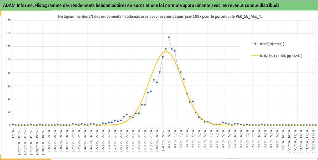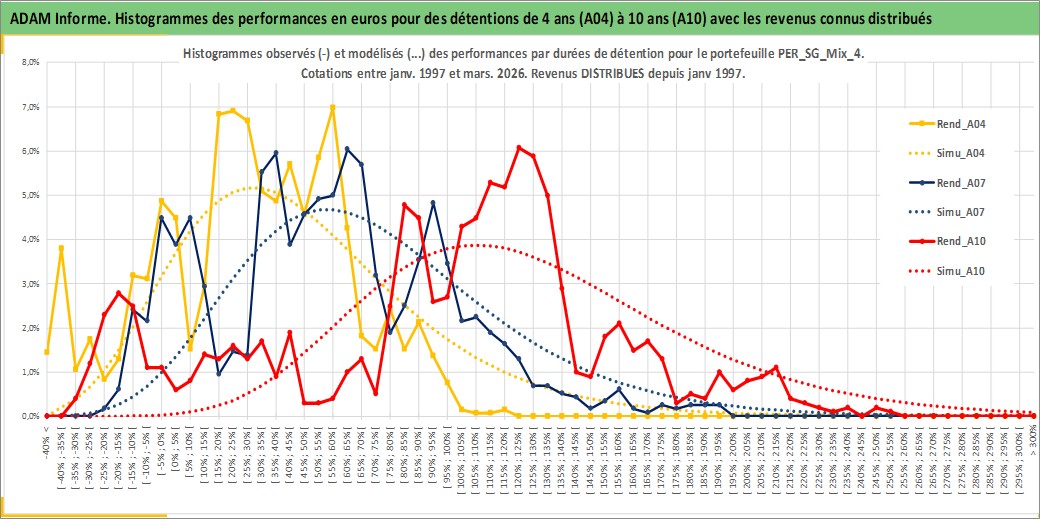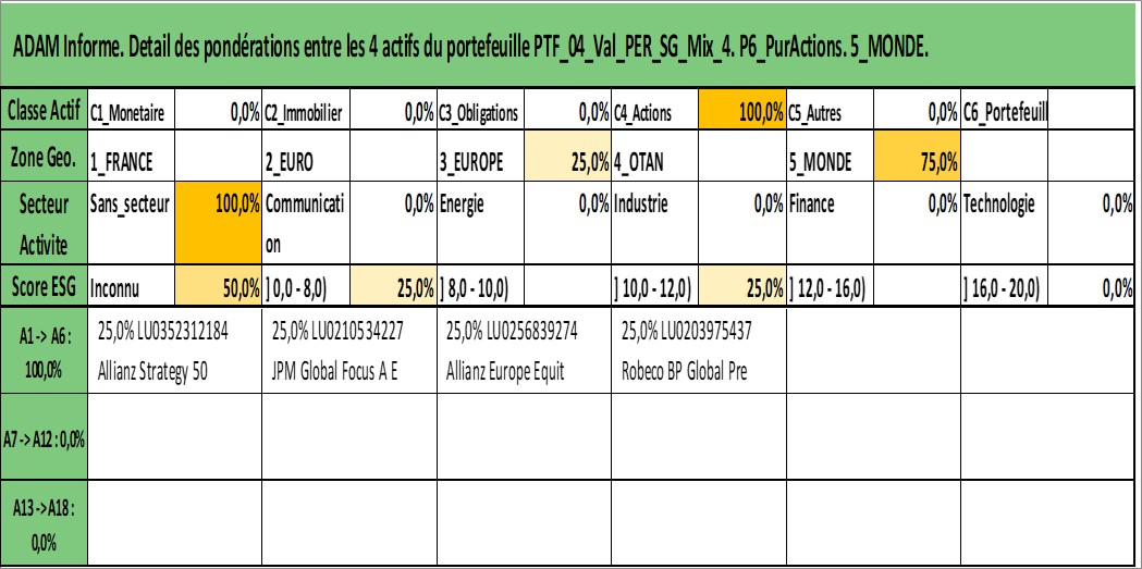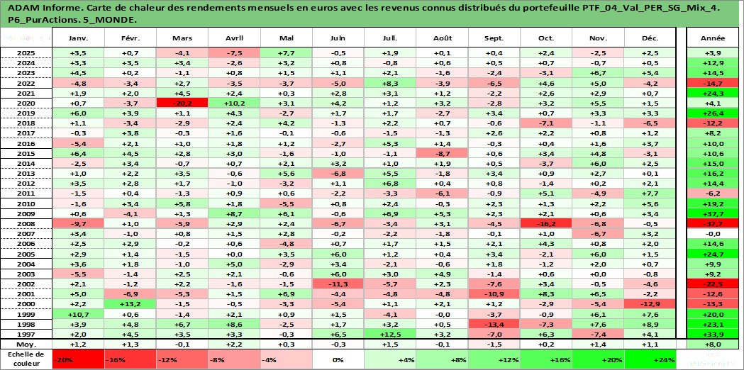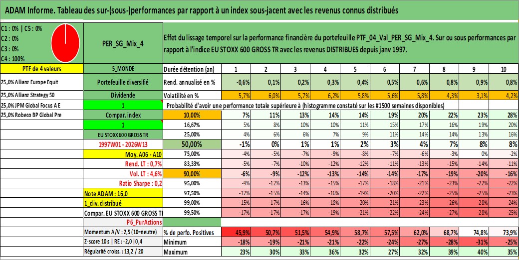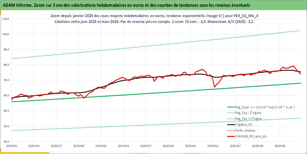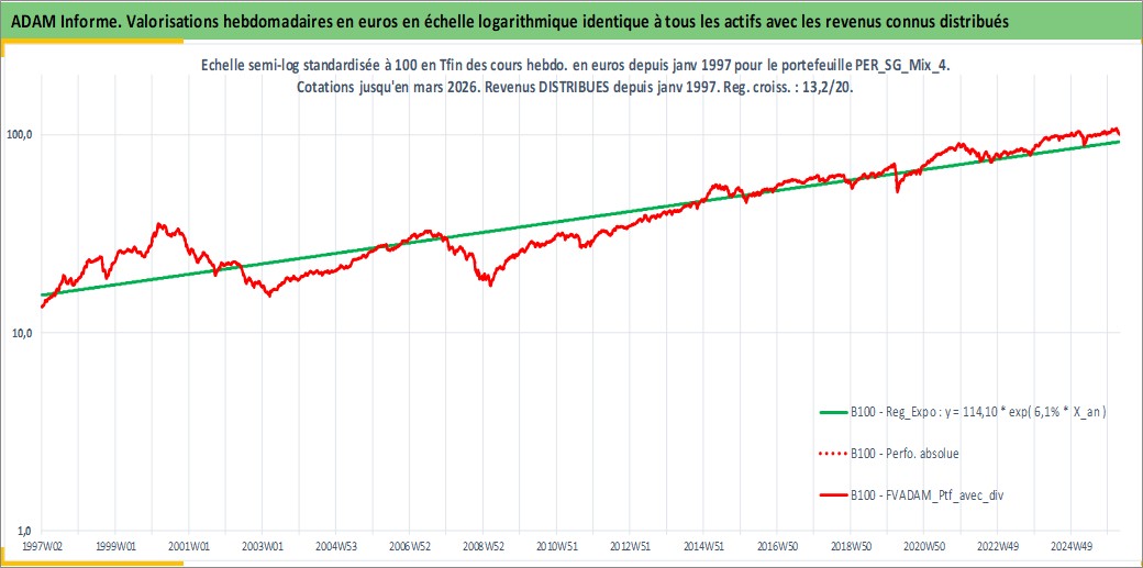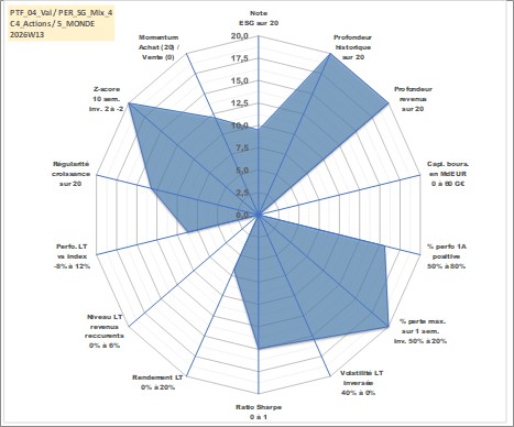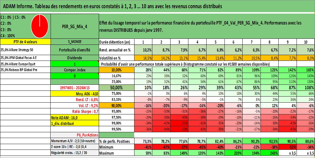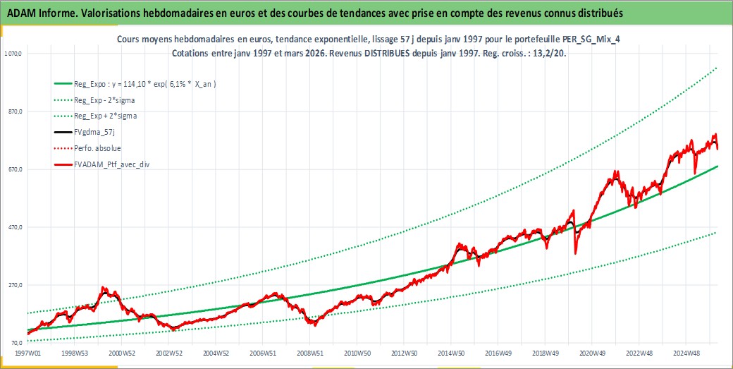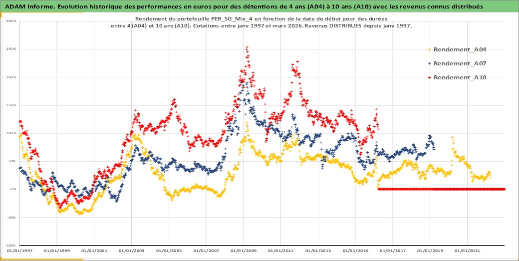 Site dédié aux investisseursPage dédiée sur site financeAnalyse des valorisations hebdomadaires du portefeuille ADAM_PER_SG_Mix_4_7actifs avec un profil P6_PurActions. Ce portefeuille est cote en EUR. Les valorisations couvrent les semaines 1997W01 a 2026W13. Les revenus de cet actif financier sont pris en compte depuis la semaine 1997W01. La note globale ESG de cet actif est estimee a 9.5 (apres rebasage entre 0 et 20).