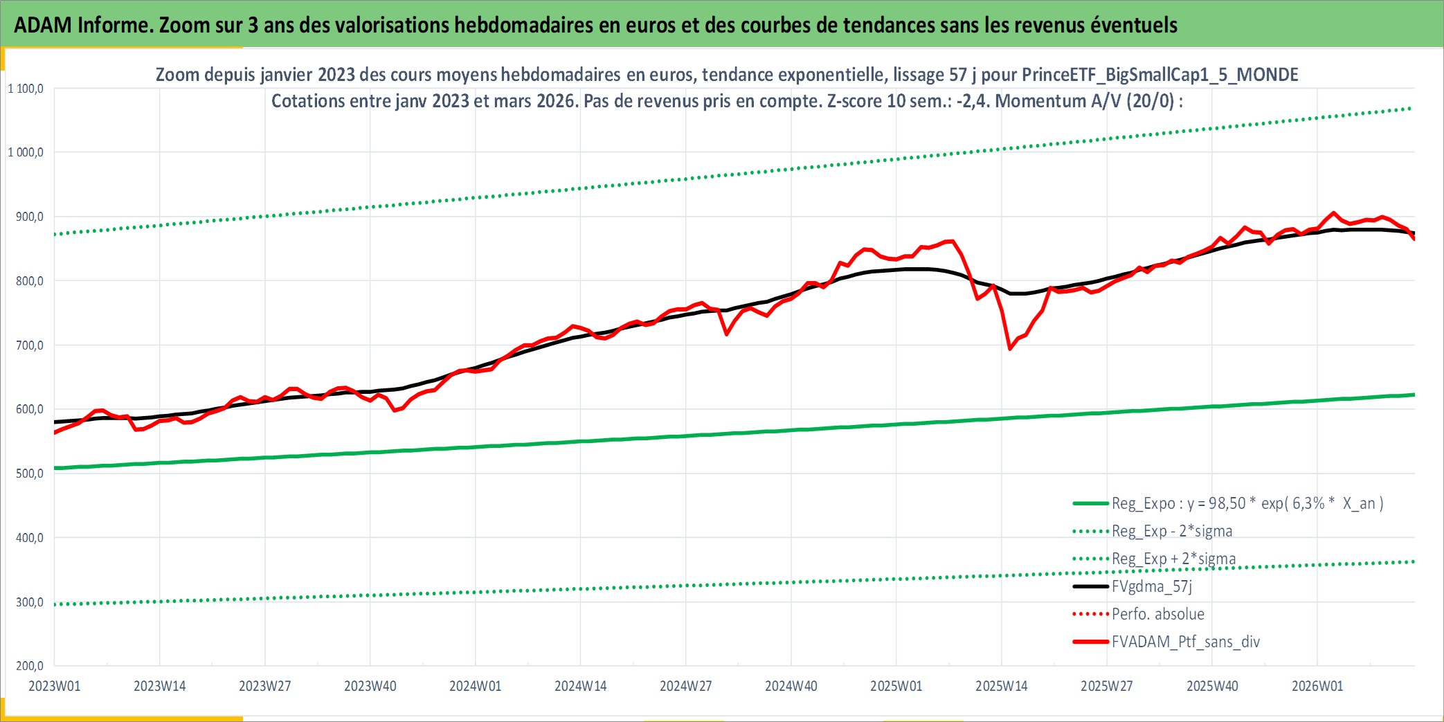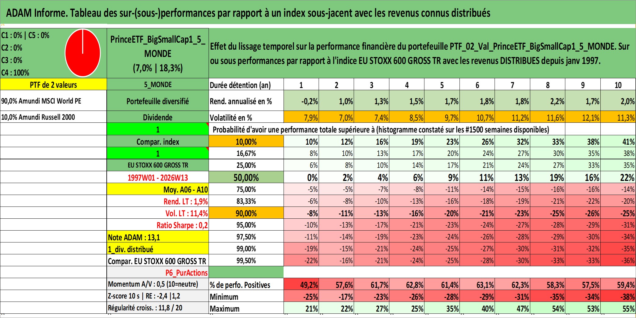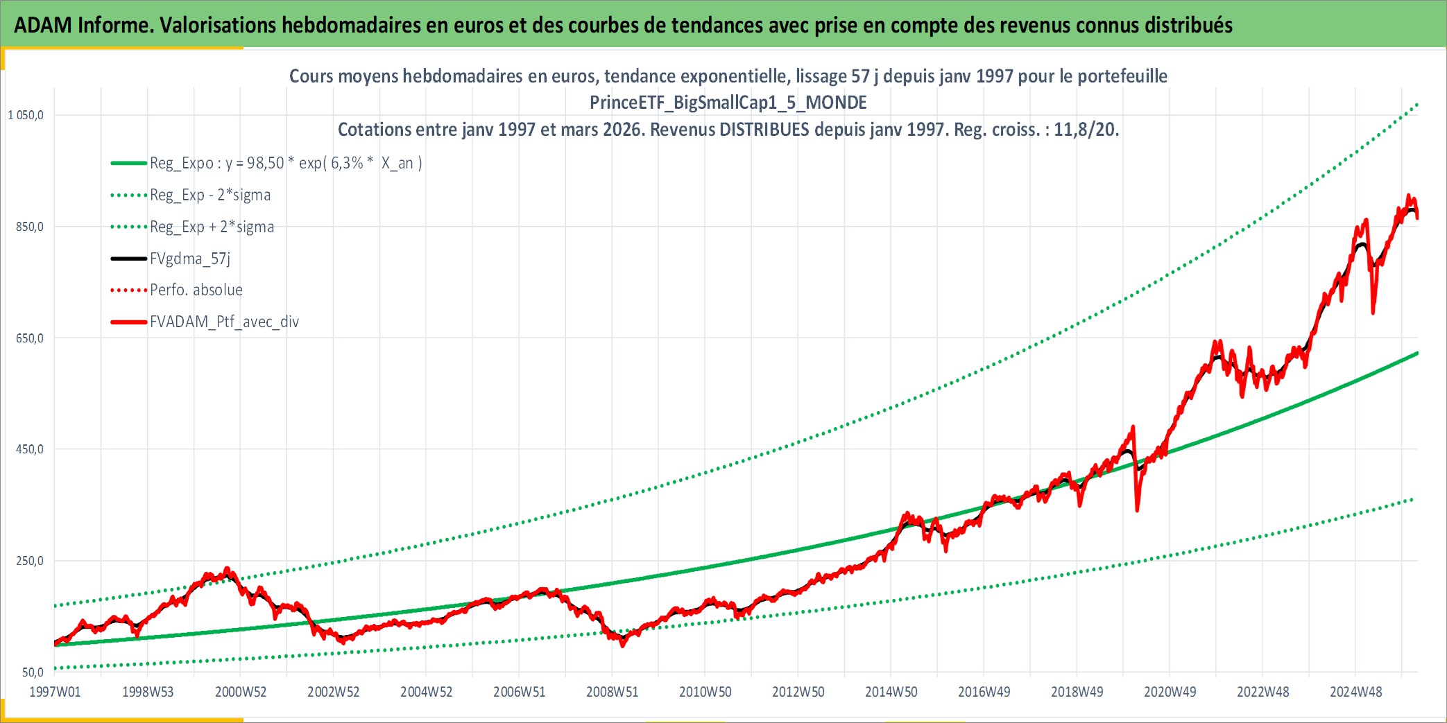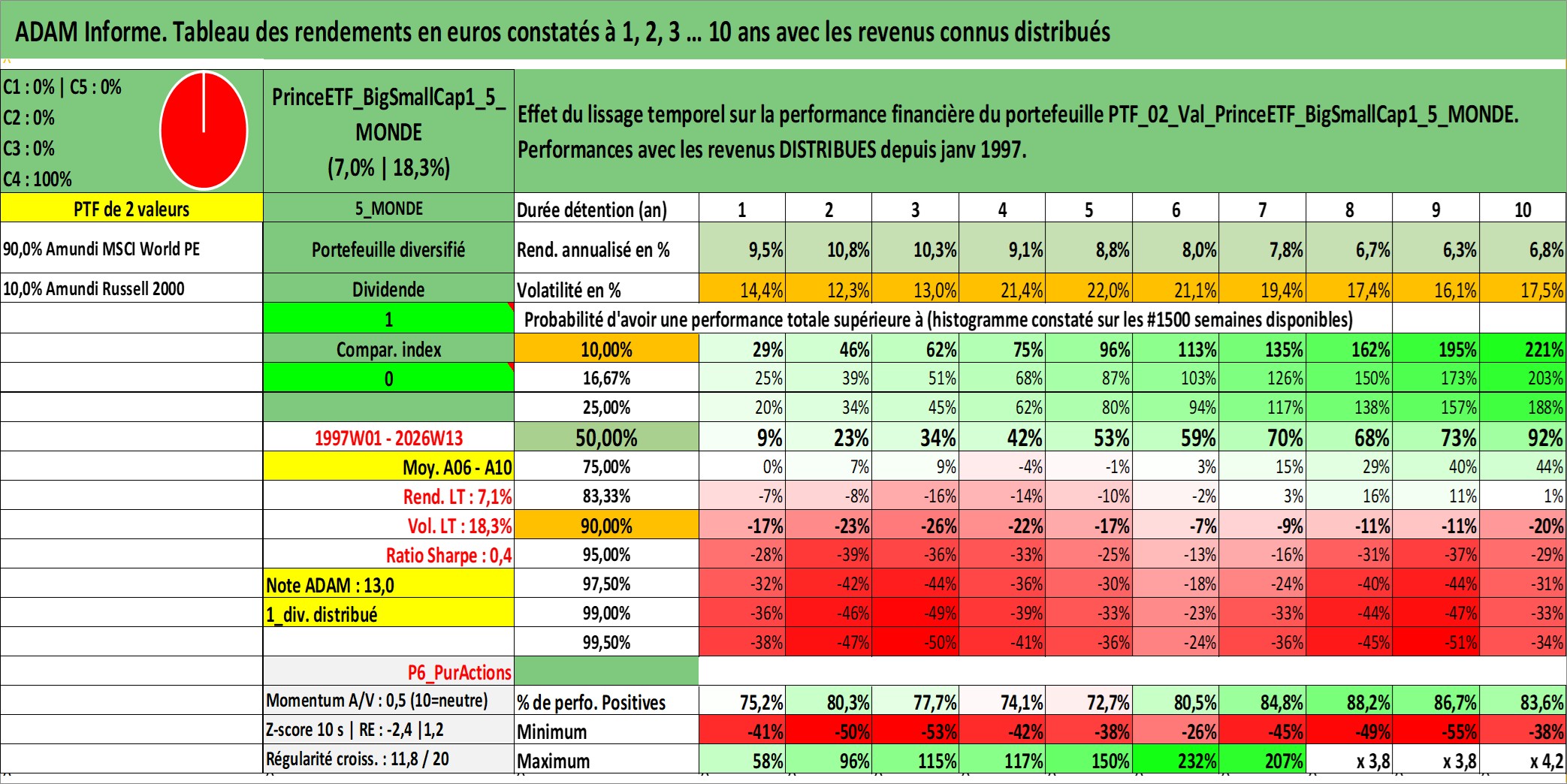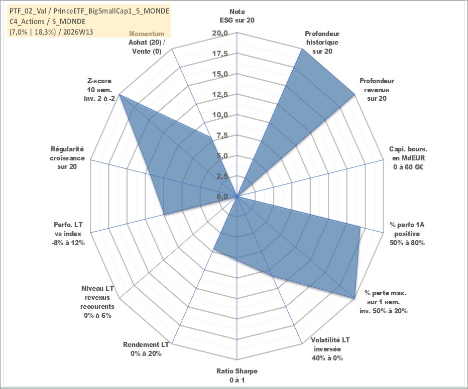 Site dédié aux investisseursPage dédiée sur site financeAnalyse des valorisations hebdomadaires du portefeuille PrinceETF_BigSmallCap1_5_MONDE_2actifs avec un profil P6_PurActions. Ce portefeuille est cote en EUR. Les valorisations couvrent les semaines 1997W01 a 2026W13. Les revenus de cet actif financier sont pris en compte depuis la semaine 1997W01. La note ESG de cet actif n'est pas connue.