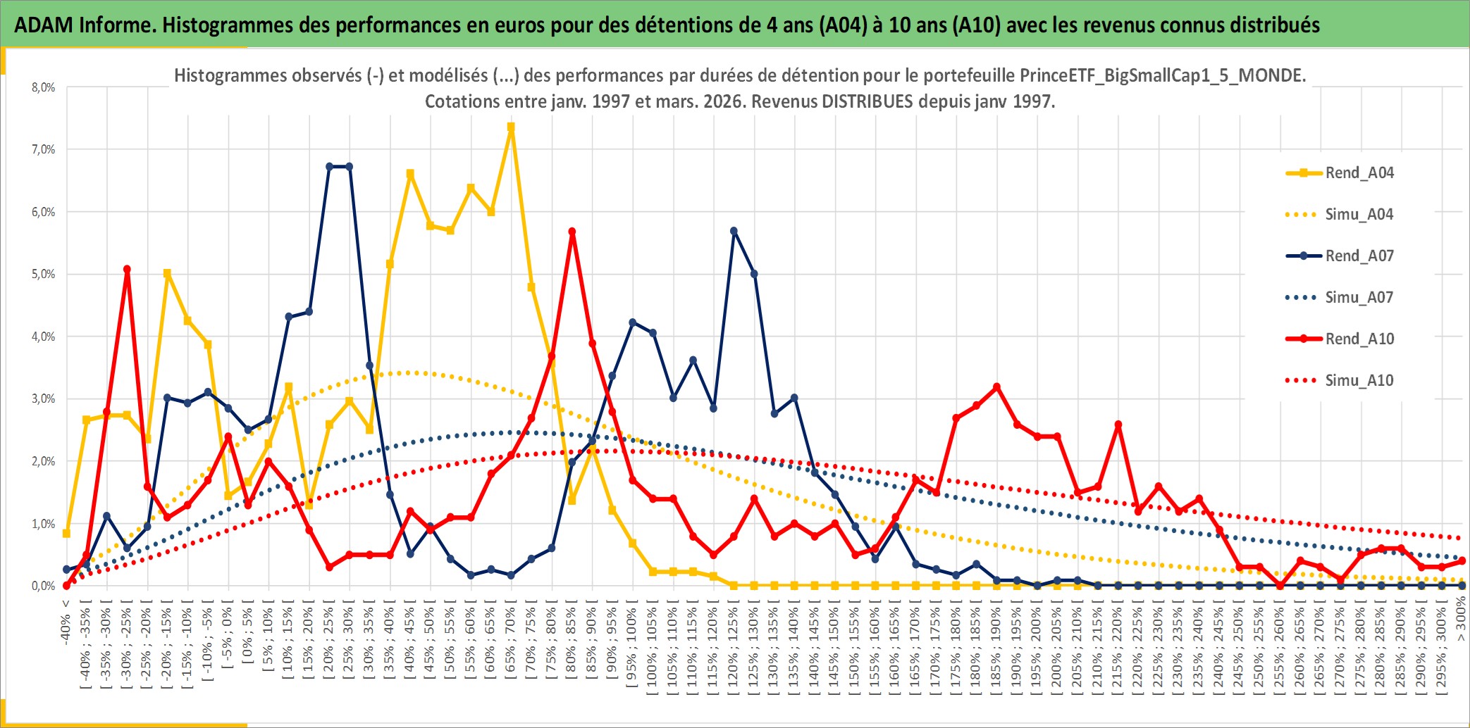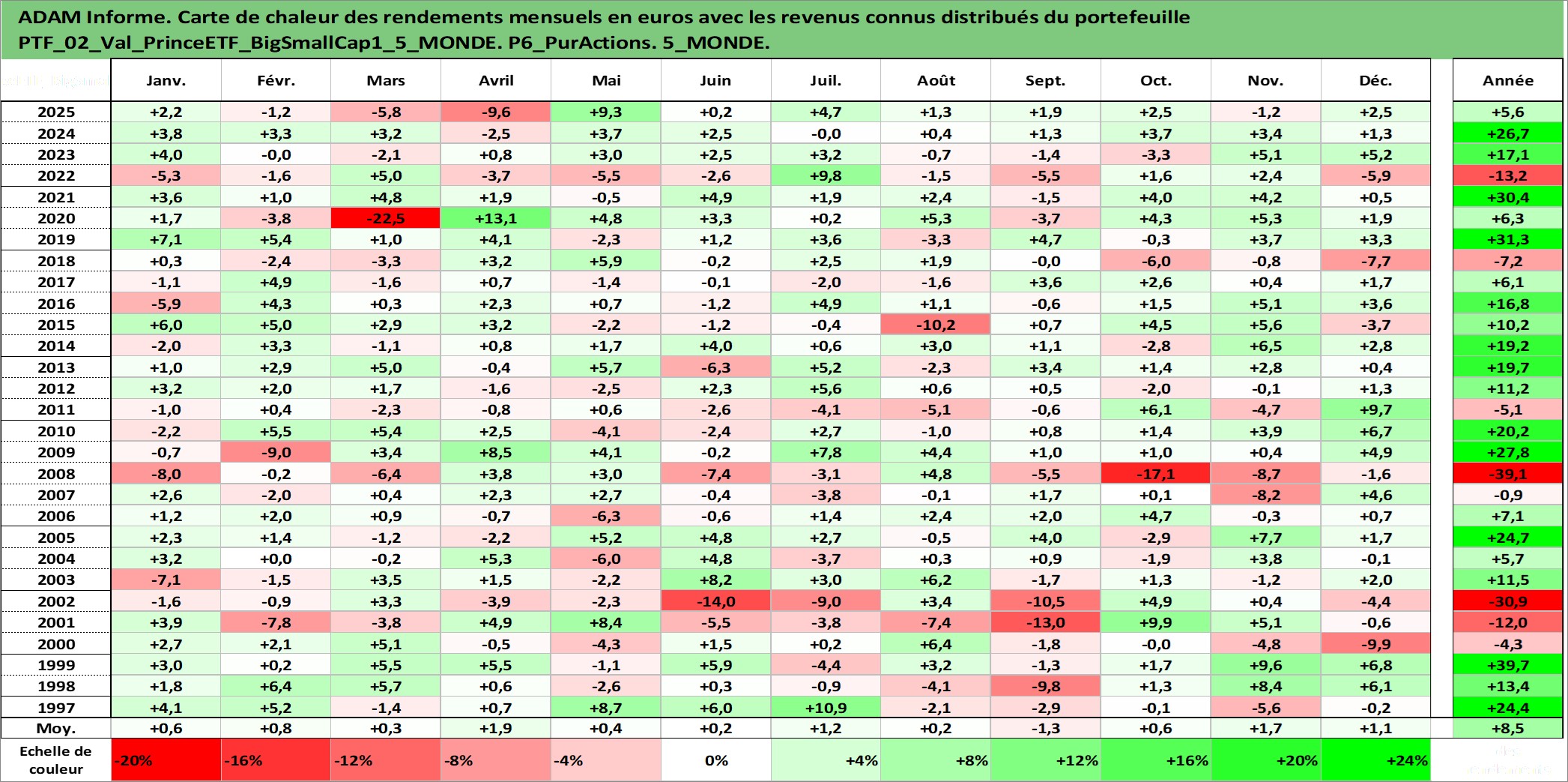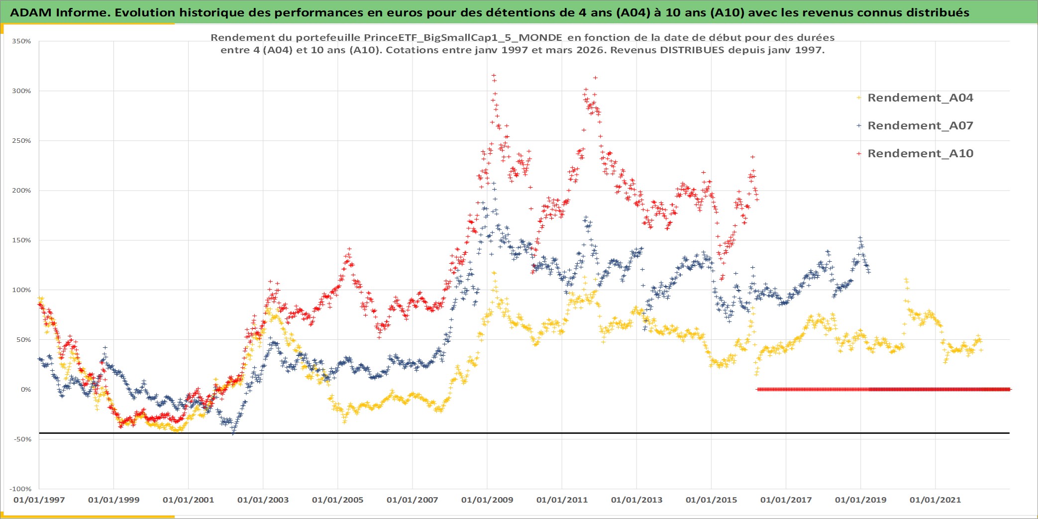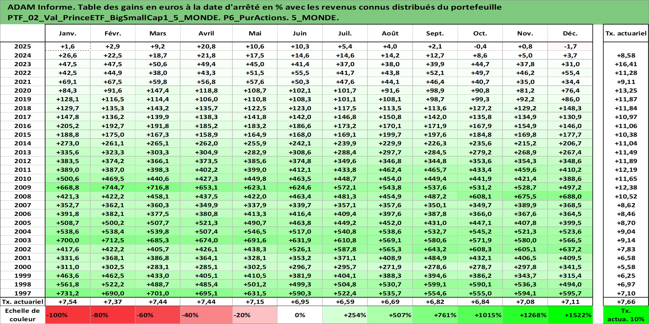 Site dédié aux investisseursPage dédiée sur site financeAnalyse des valorisations hebdomadaires du portefeuille PrinceETF_BigSmallCap1_5_MONDE_2actifs avec un profil P6_PurActions. Ce portefeuille est cote en EUR. Les valorisations couvrent les semaines 1997W01 a 2026W13. Les revenus de cet actif financier sont pris en compte depuis la semaine 1997W01. La note ESG de cet actif n'est pas connue.