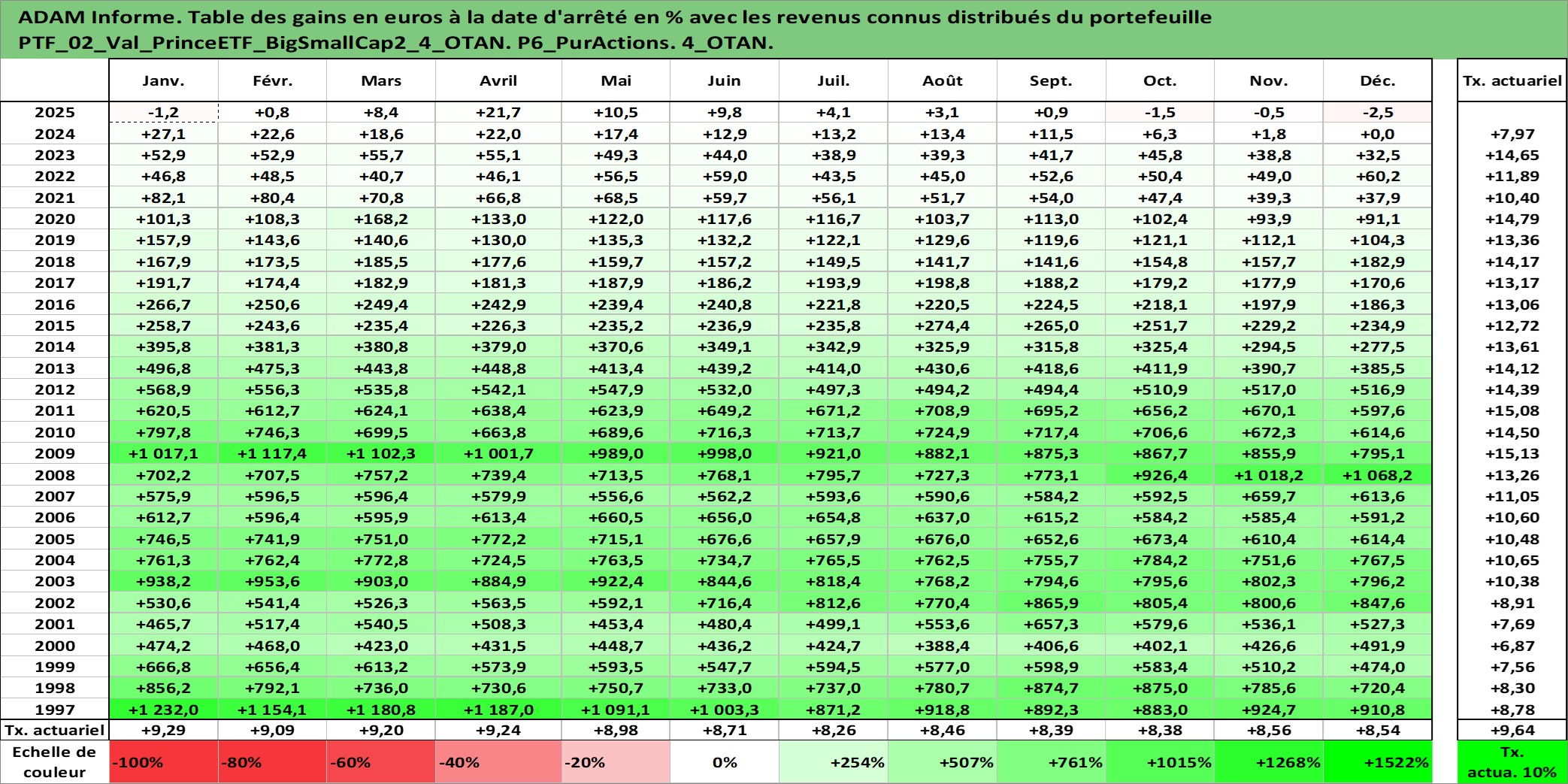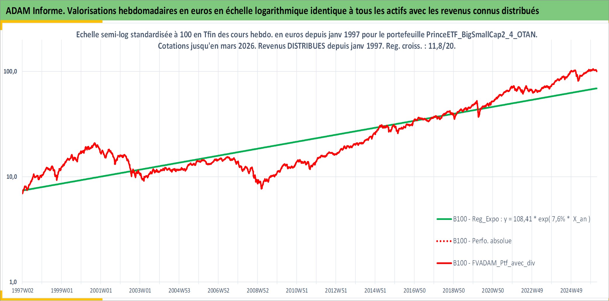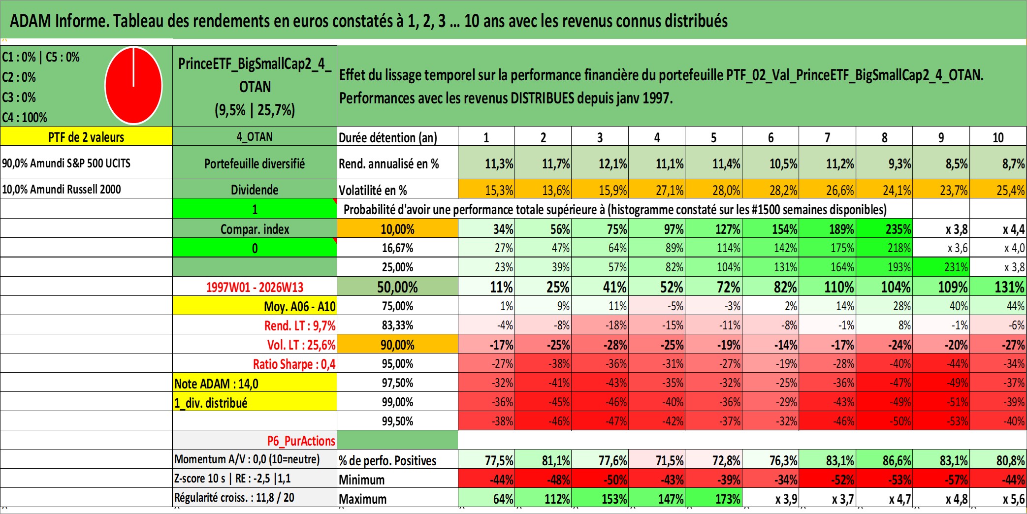 Site dédié aux investisseursPage dédiée sur site financeAnalyse des valorisations hebdomadaires du portefeuille PrinceETF_BigSmallCap2_4_OTAN_2actifs avec un profil P6_PurActions. Ce portefeuille est cote en EUR. Les valorisations couvrent les semaines 1997W01 a 2026W13. Les revenus de cet actif financier sont pris en compte depuis la semaine 1997W01. La note ESG de cet actif n'est pas connue.