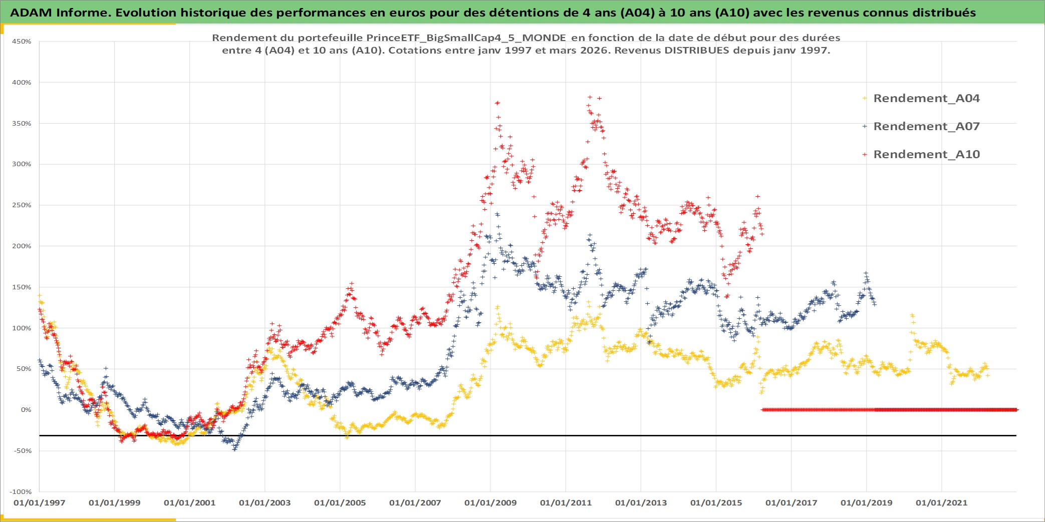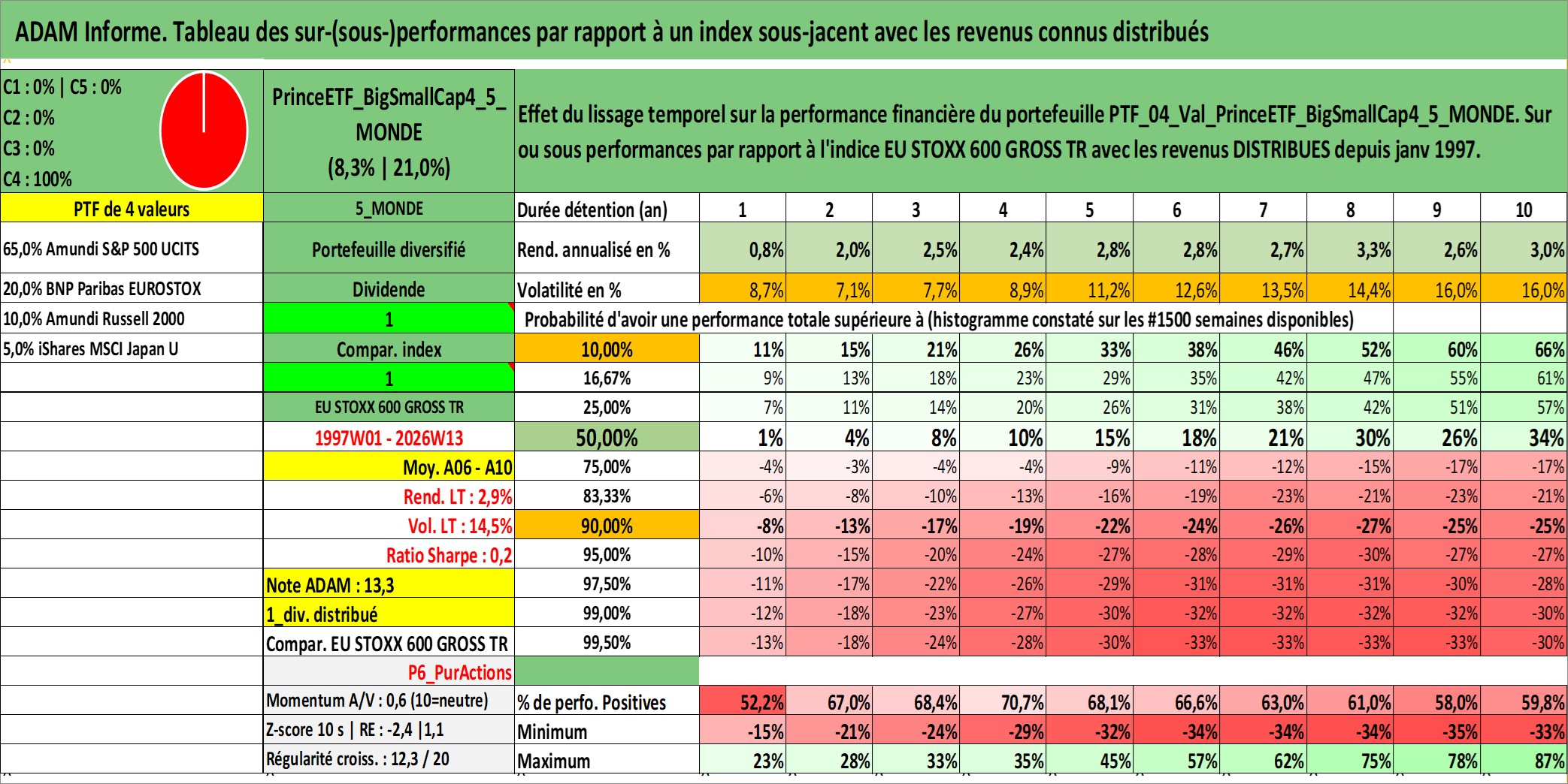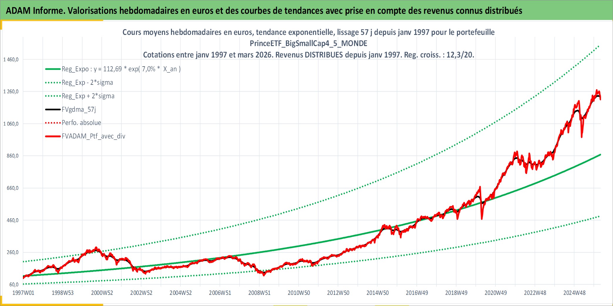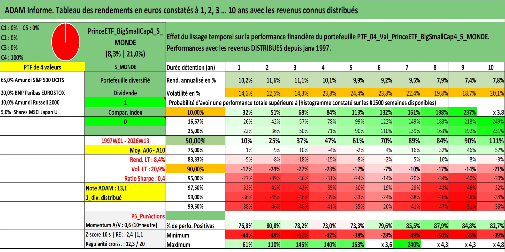 Site dédié aux investisseursPage dédiée sur site financeAnalyse des valorisations hebdomadaires du portefeuille PrinceETF_BigSmallCap4_5_MONDE_4actifs avec un profil P6_PurActions. Ce portefeuille est cote en EUR. Les valorisations couvrent les semaines 1997W01 a 2026W13. Les revenus de cet actif financier sont pris en compte depuis la semaine 1997W01. La note ESG de cet actif n'est pas connue.