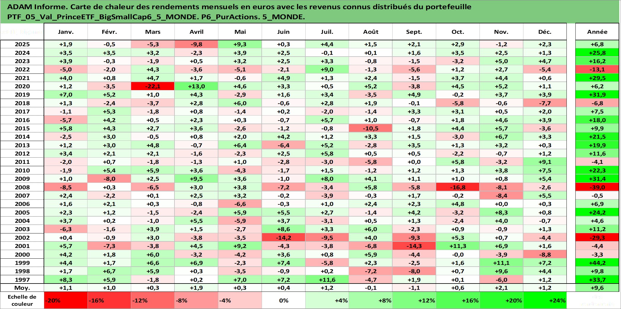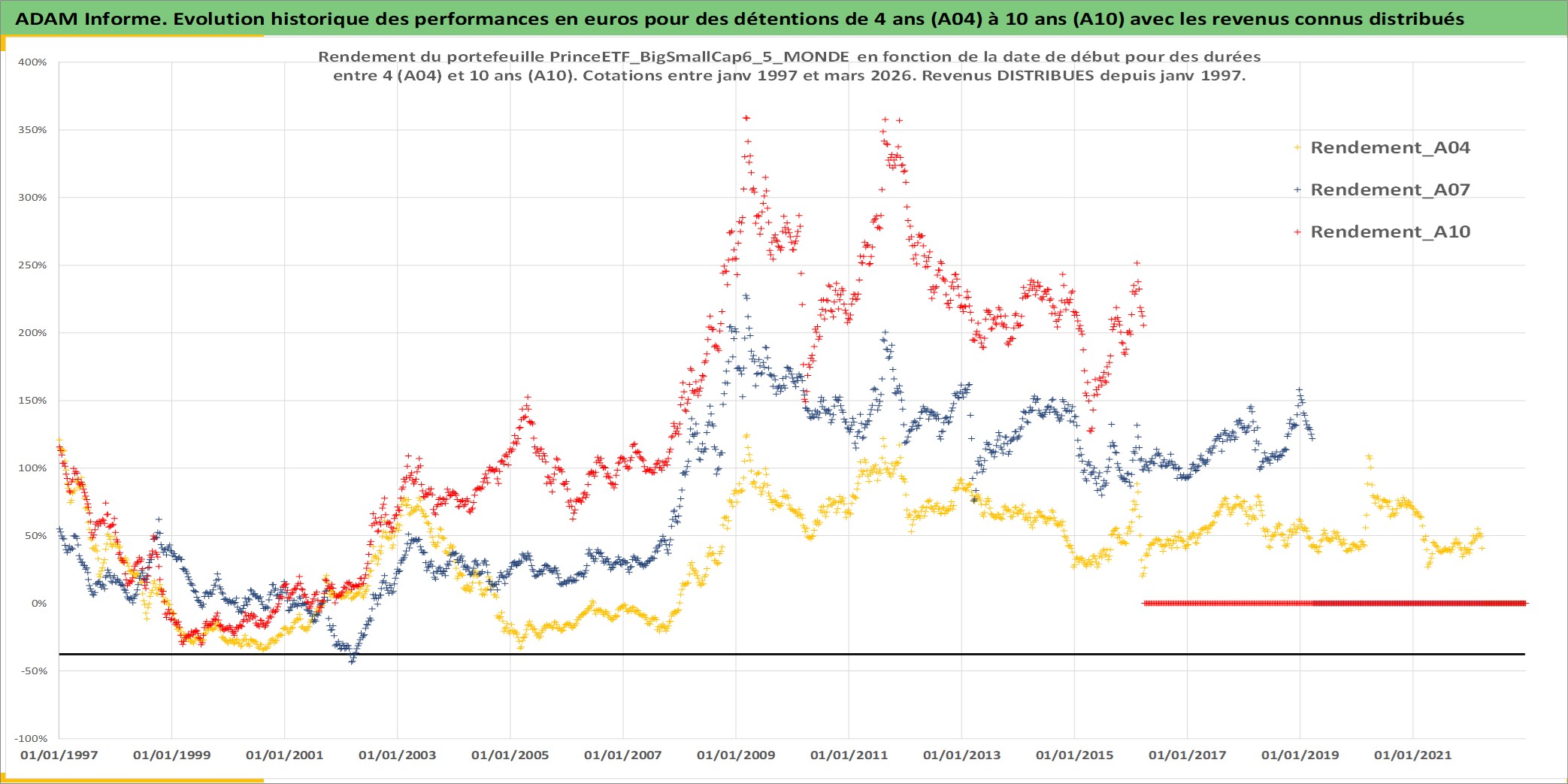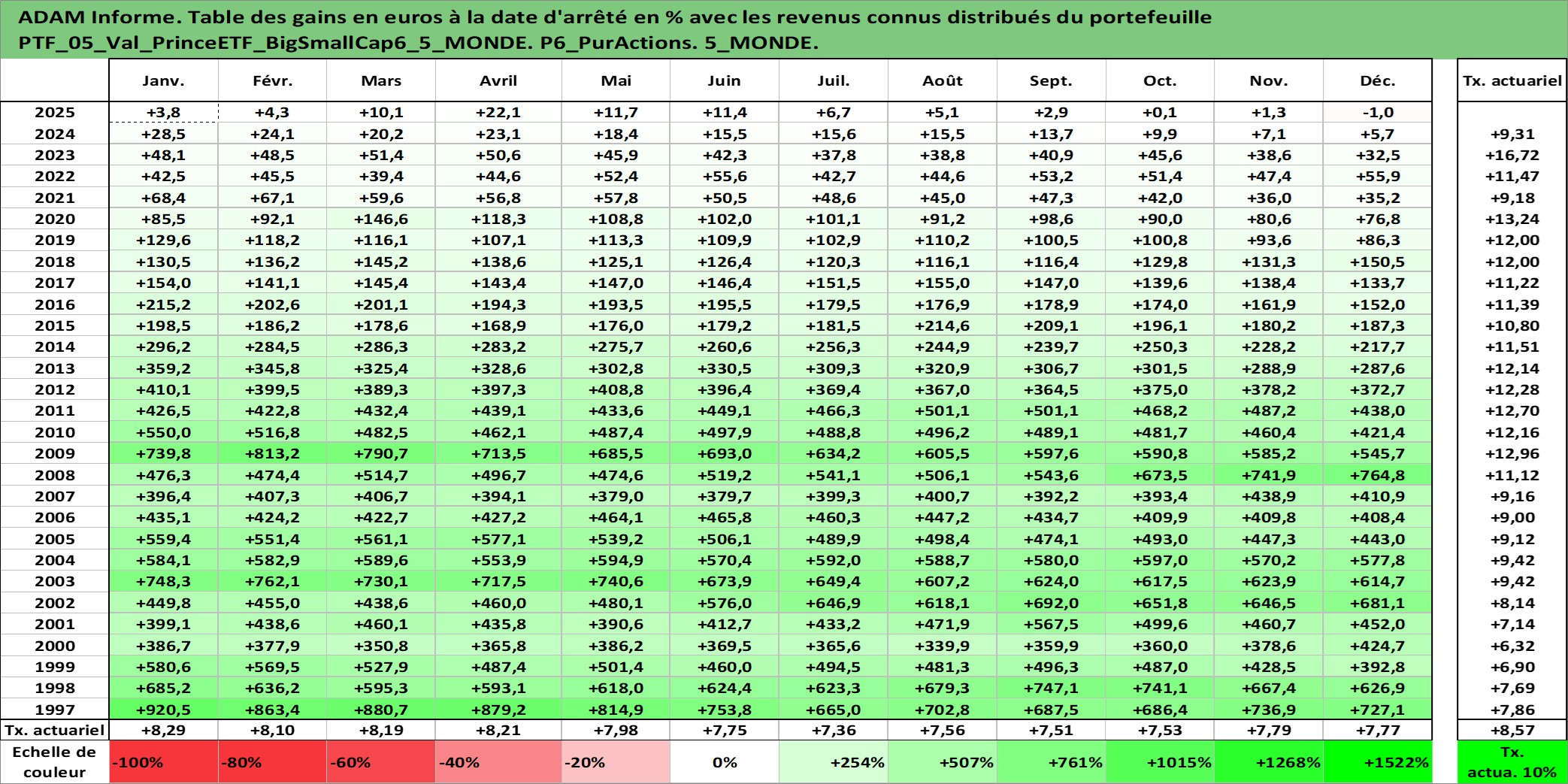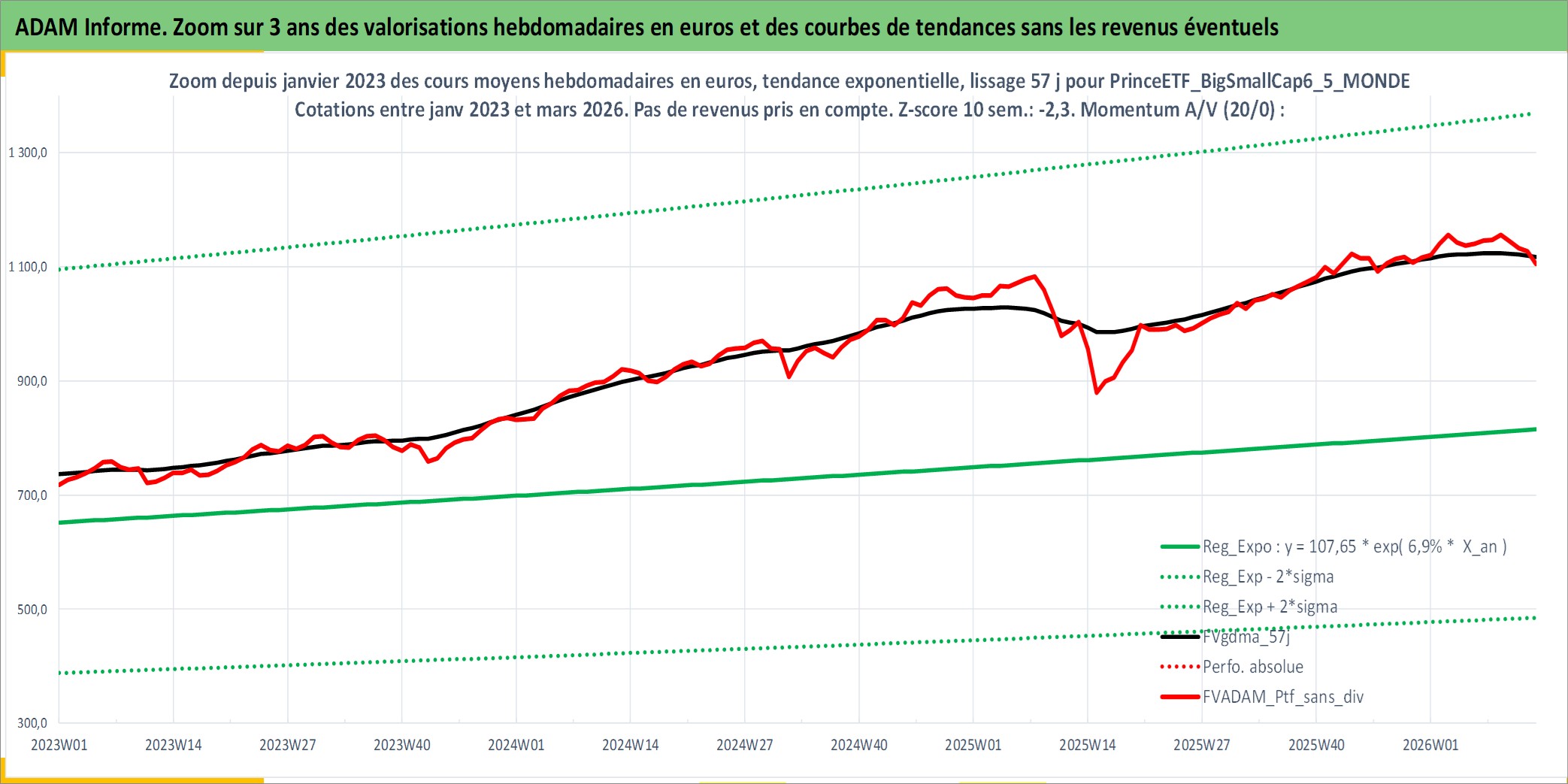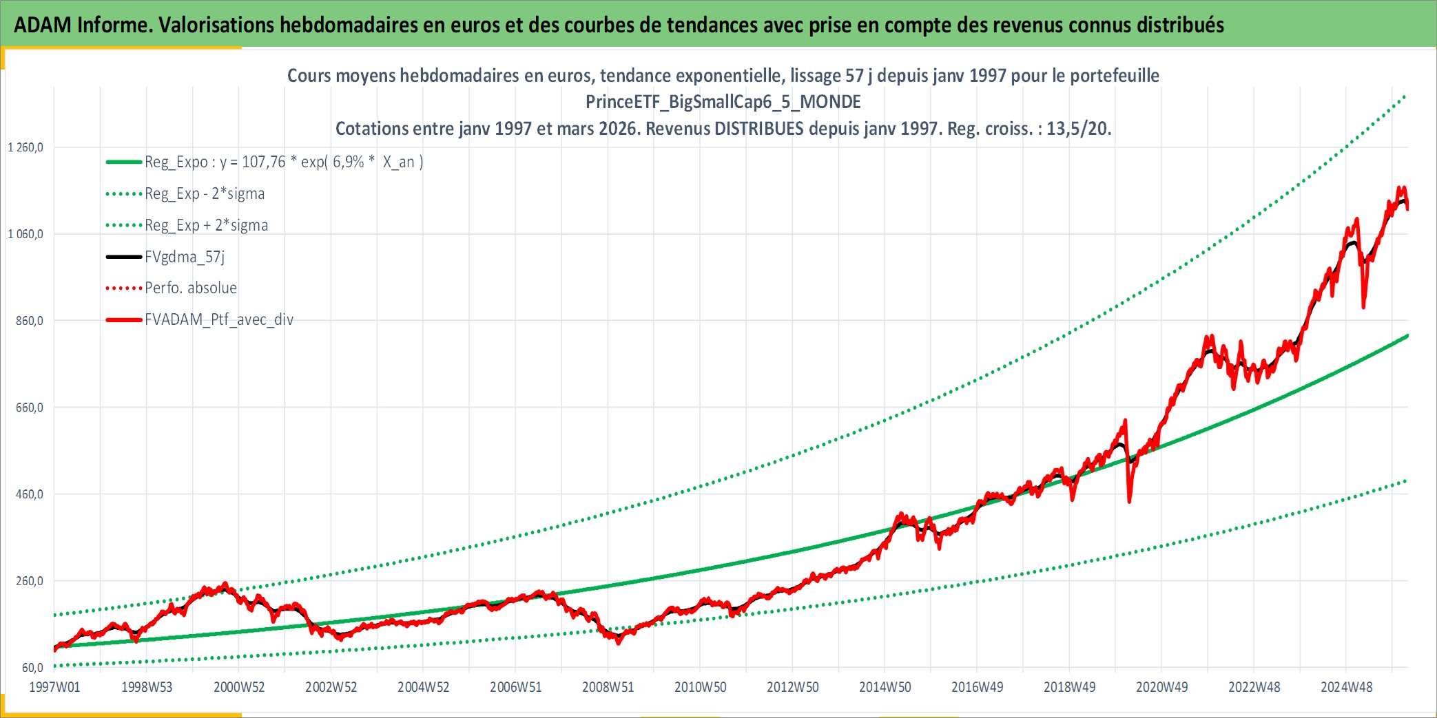 Site dédié aux investisseursPage dédiée sur site financeAnalyse des valorisations hebdomadaires du portefeuille PrinceETF_BigSmallCap6_5_MONDE_5actifs avec un profil P6_PurActions. Ce portefeuille est cote en EUR. Les valorisations couvrent les semaines 1997W01 a 2026W13. Les revenus de cet actif financier sont pris en compte depuis la semaine 1997W01. La note ESG de cet actif n'est pas connue.