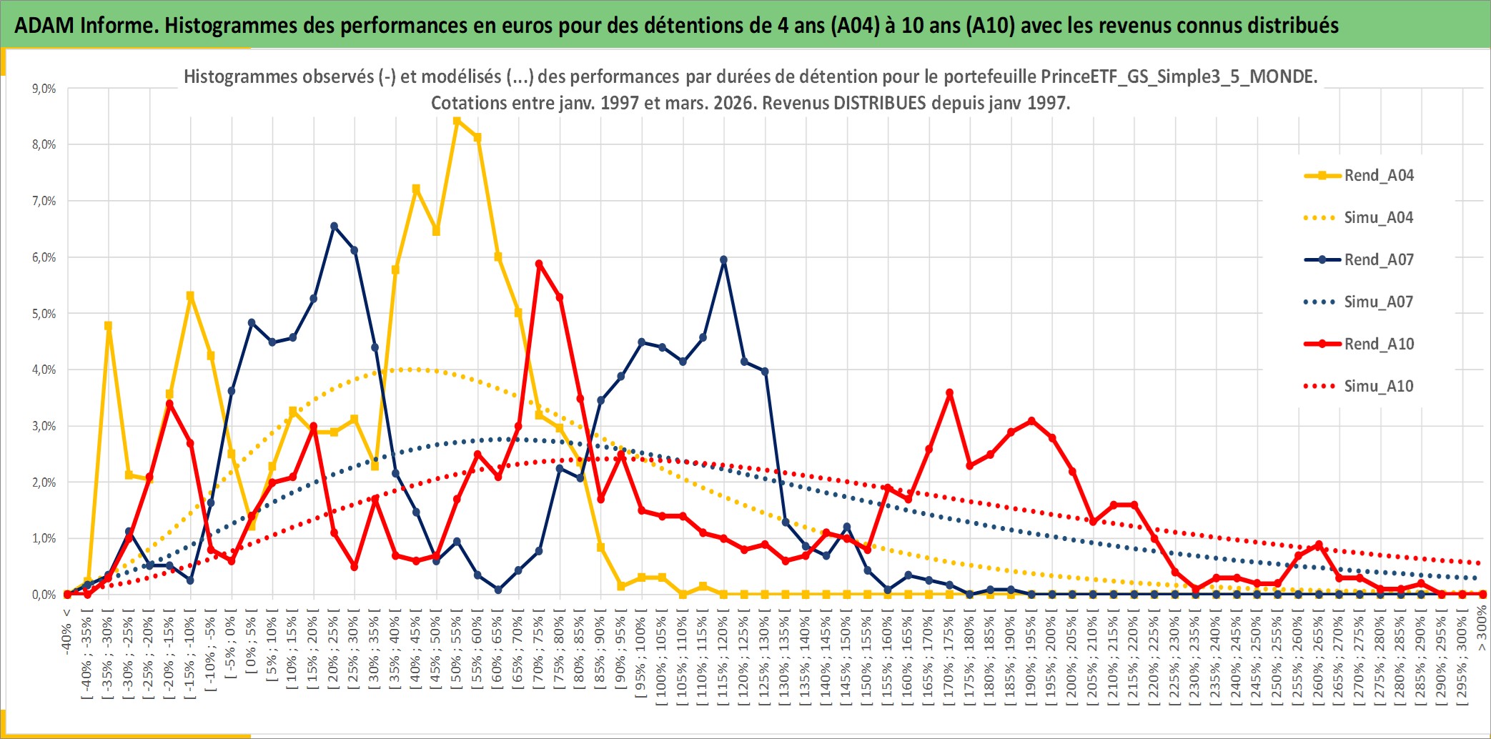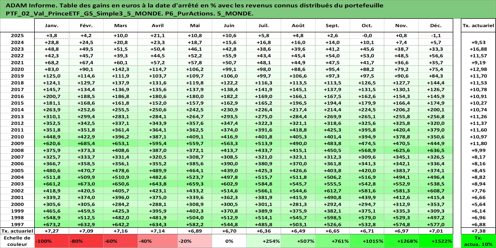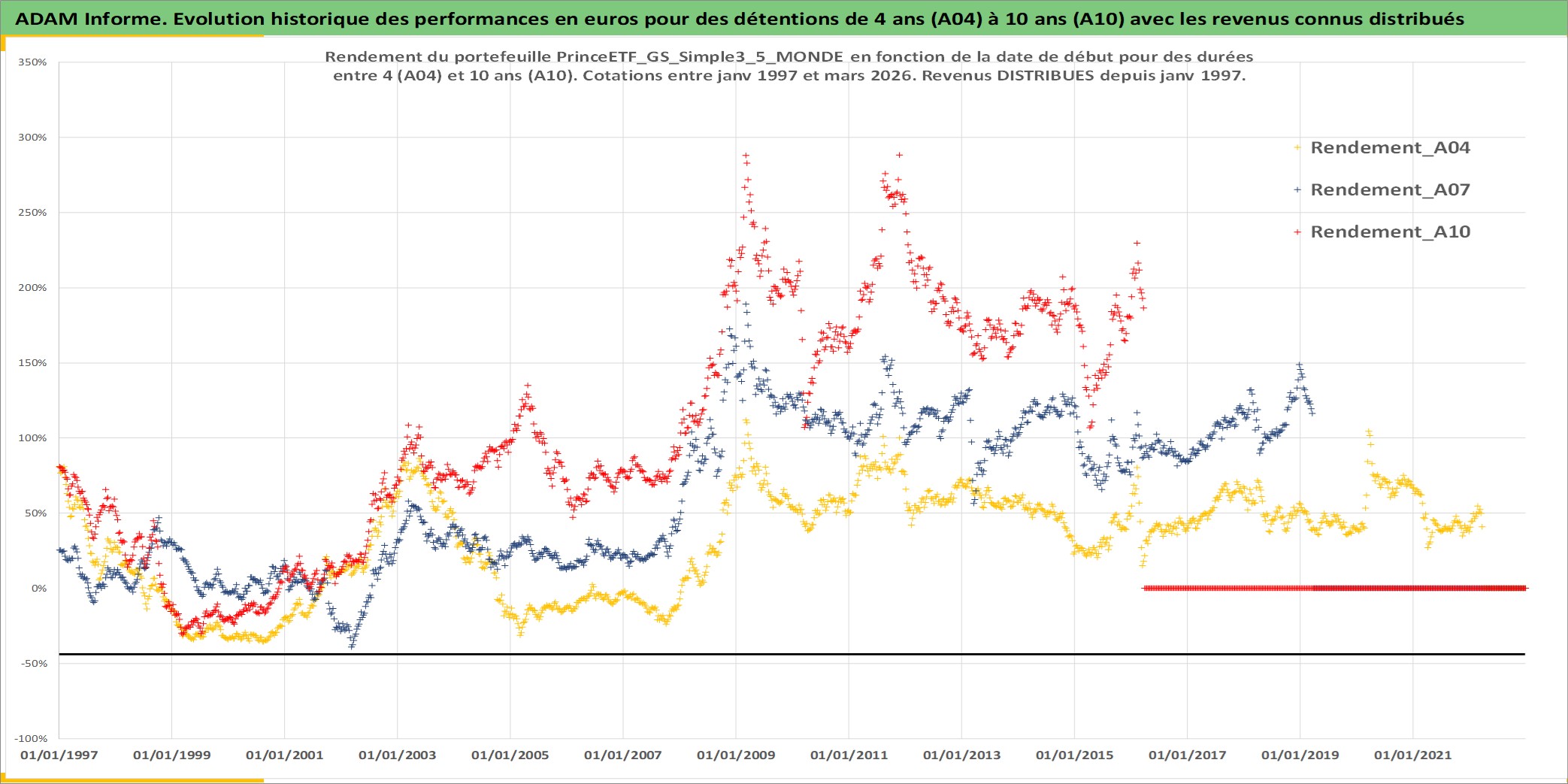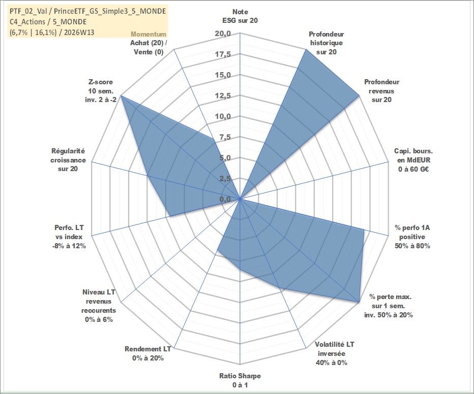 Site dédié aux investisseursPage dédiée sur site financeAnalyse des valorisations hebdomadaires du portefeuille PrinceETF_GS_Simple3_5_MONDE_2actifs avec un profil P6_PurActions. Ce portefeuille est cote en EUR. Les valorisations couvrent les semaines 1997W01 a 2026W13. Les revenus de cet actif financier sont pris en compte depuis la semaine 1997W01. La note ESG de cet actif n'est pas connue.