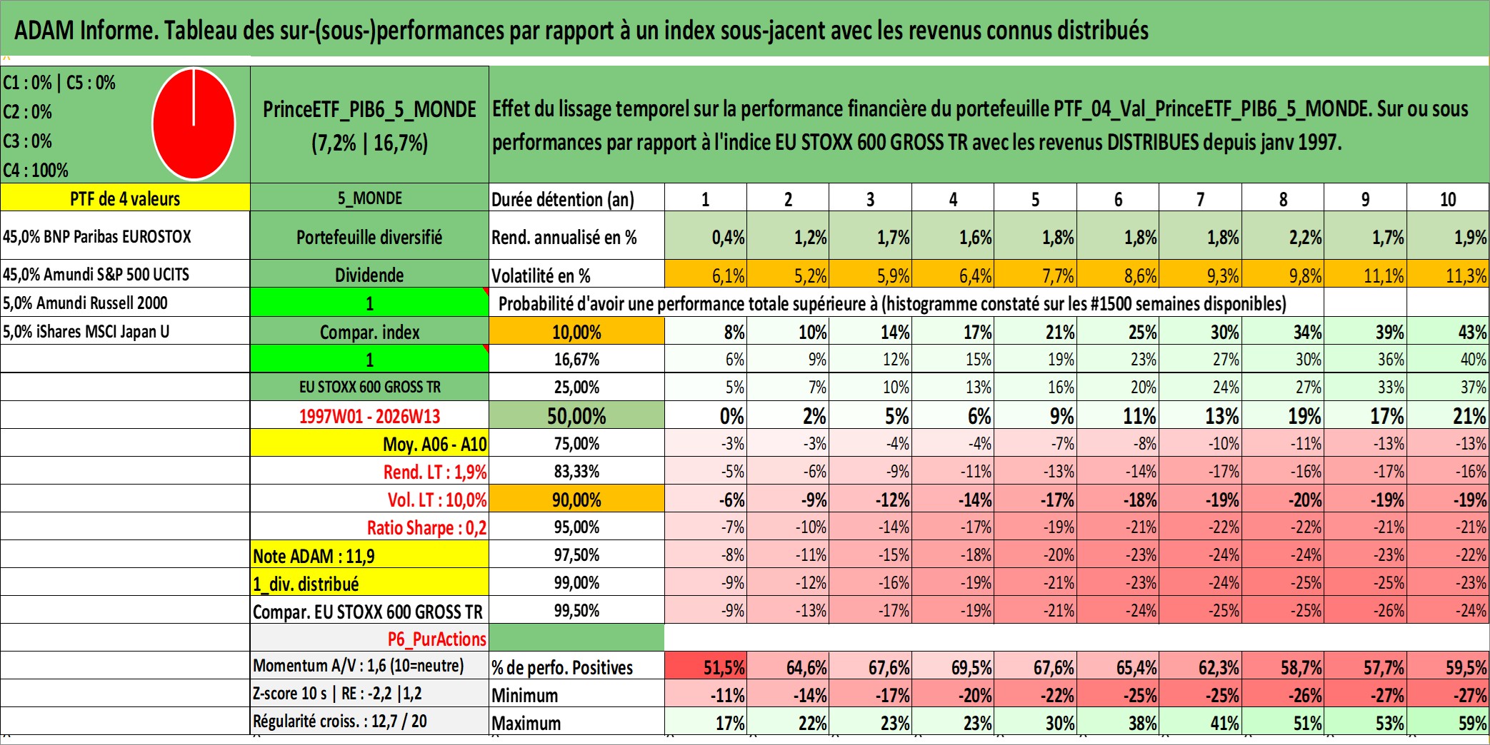 Site dédié aux investisseursPage dédiée sur site financeAnalyse des valorisations hebdomadaires du portefeuille PrinceETF_PIB6_5_MONDE_4actifs avec un profil P6_PurActions. Ce portefeuille est cote en EUR. Les valorisations couvrent les semaines 1997W01 a 2026W13. Les revenus de cet actif financier sont pris en compte depuis la semaine 1997W01. La note ESG de cet actif n'est pas connue.