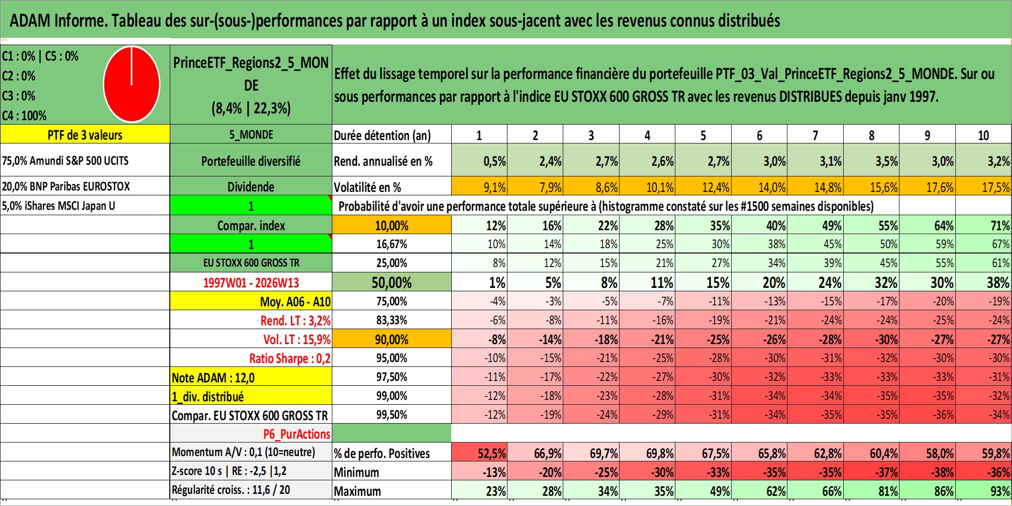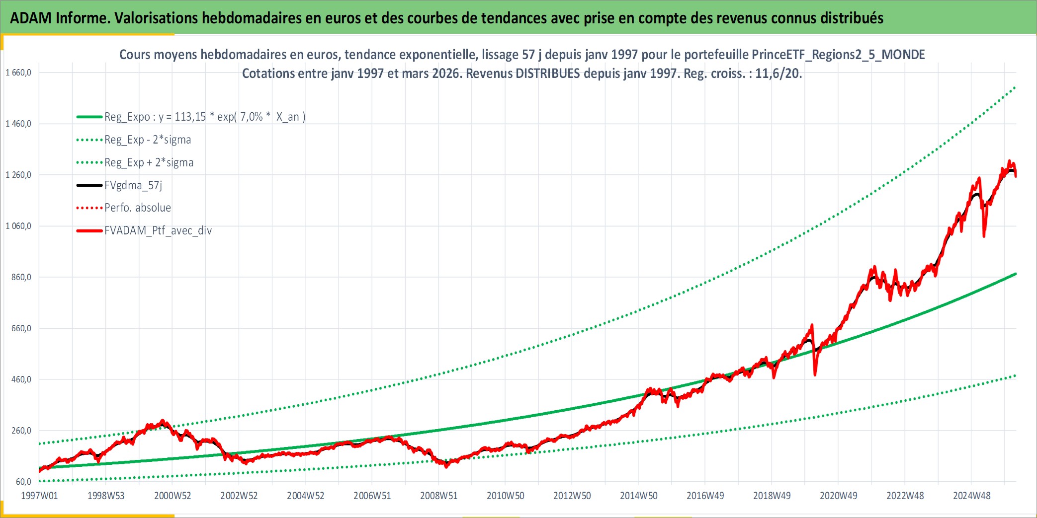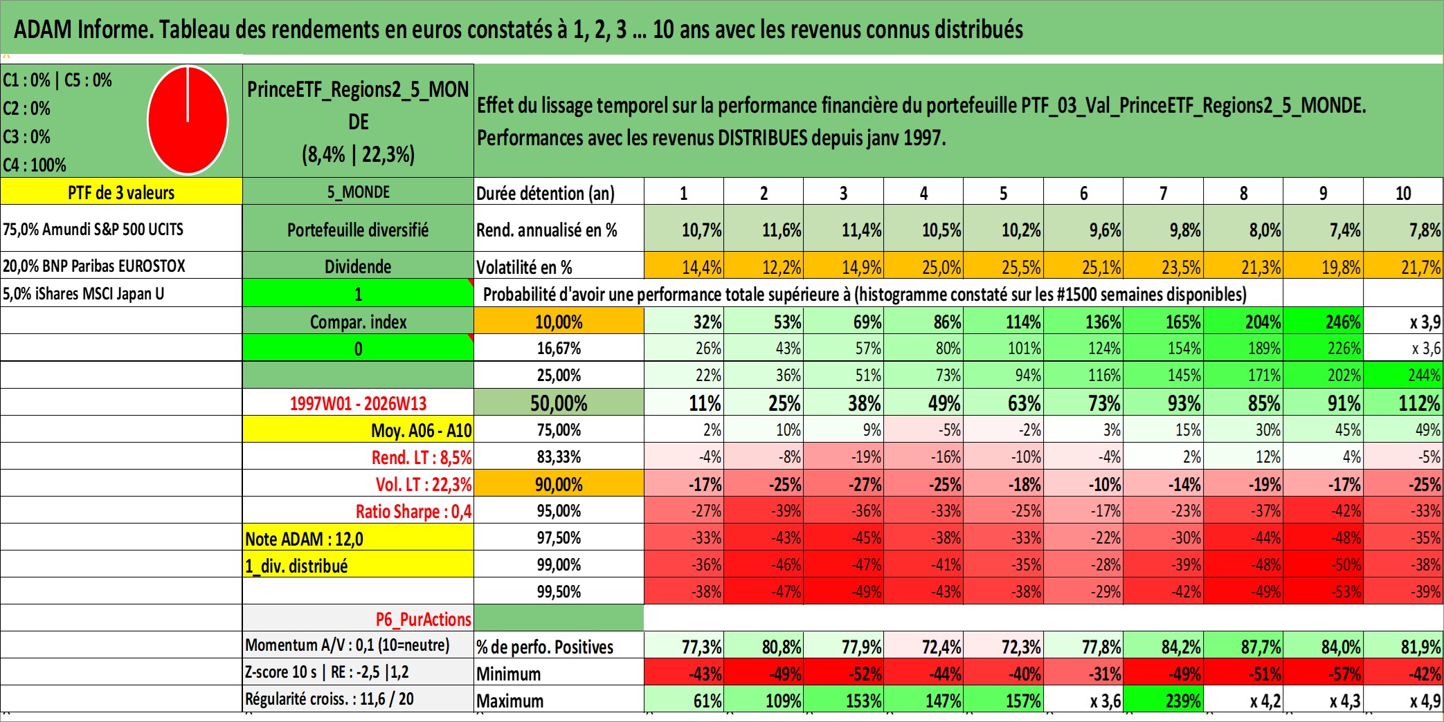 Site dédié aux investisseursPage dédiée sur site financeAnalyse des valorisations hebdomadaires du portefeuille PrinceETF_Regions2_5_MONDE_3actifs avec un profil P6_PurActions. Ce portefeuille est cote en EUR. Les valorisations couvrent les semaines 1997W01 a 2026W13. Les revenus de cet actif financier sont pris en compte depuis la semaine 1997W01. La note ESG de cet actif n'est pas connue.