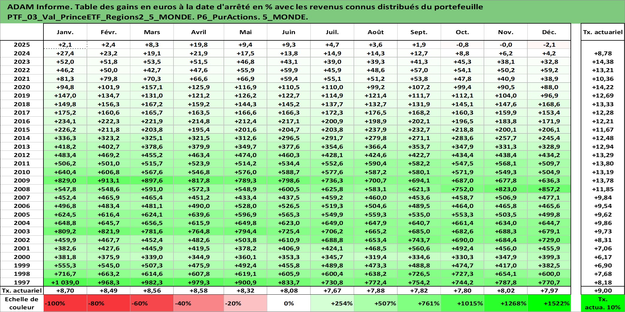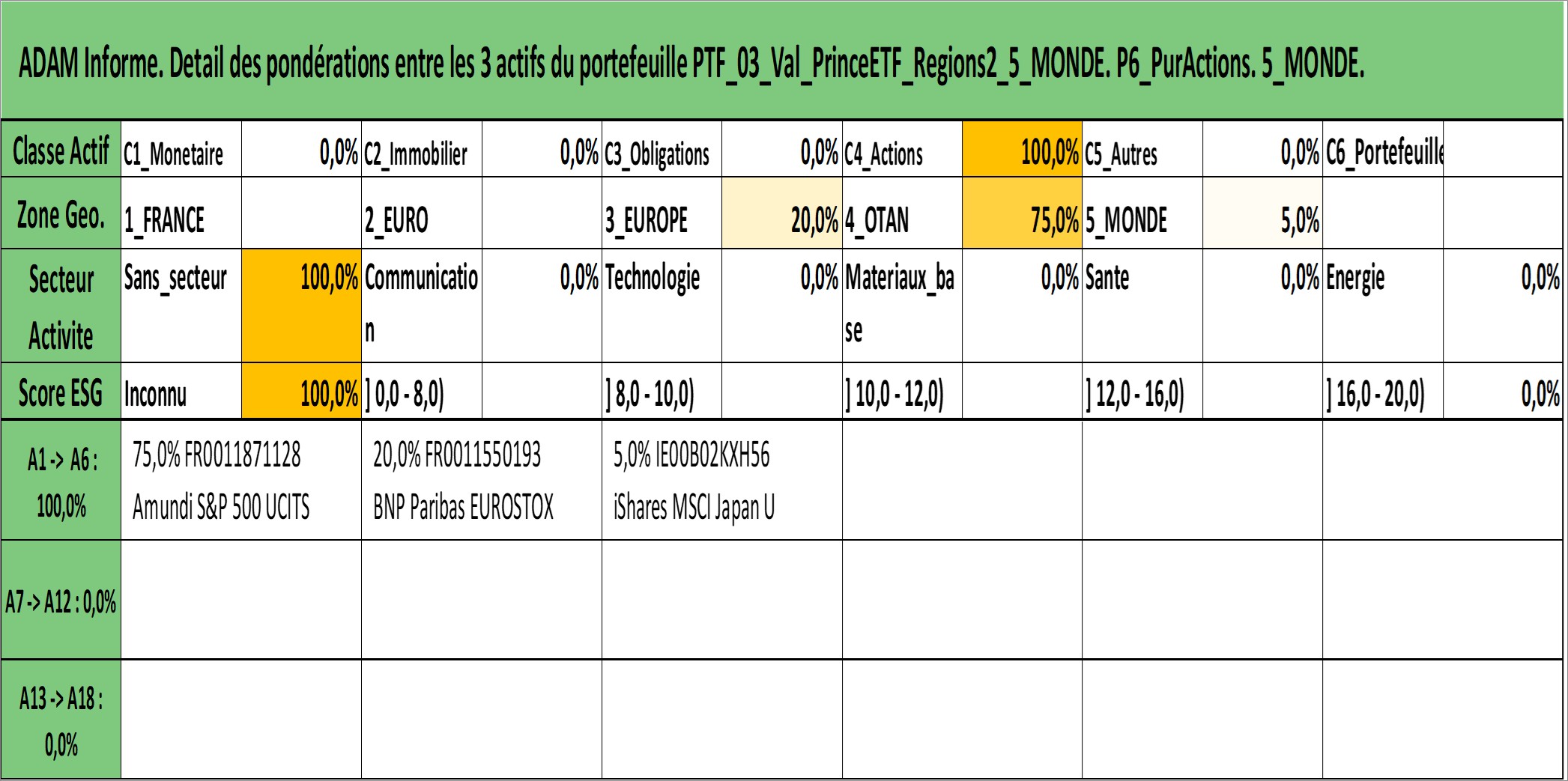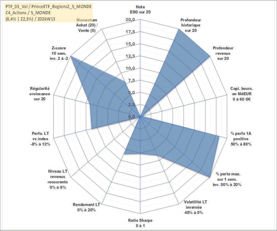 Site dédié aux investisseursPage dédiée sur site financeAnalyse des valorisations hebdomadaires du portefeuille PrinceETF_Regions2_5_MONDE_3actifs avec un profil P6_PurActions. Ce portefeuille est cote en EUR. Les valorisations couvrent les semaines 1997W01 a 2026W13. Les revenus de cet actif financier sont pris en compte depuis la semaine 1997W01. La note ESG de cet actif n'est pas connue.