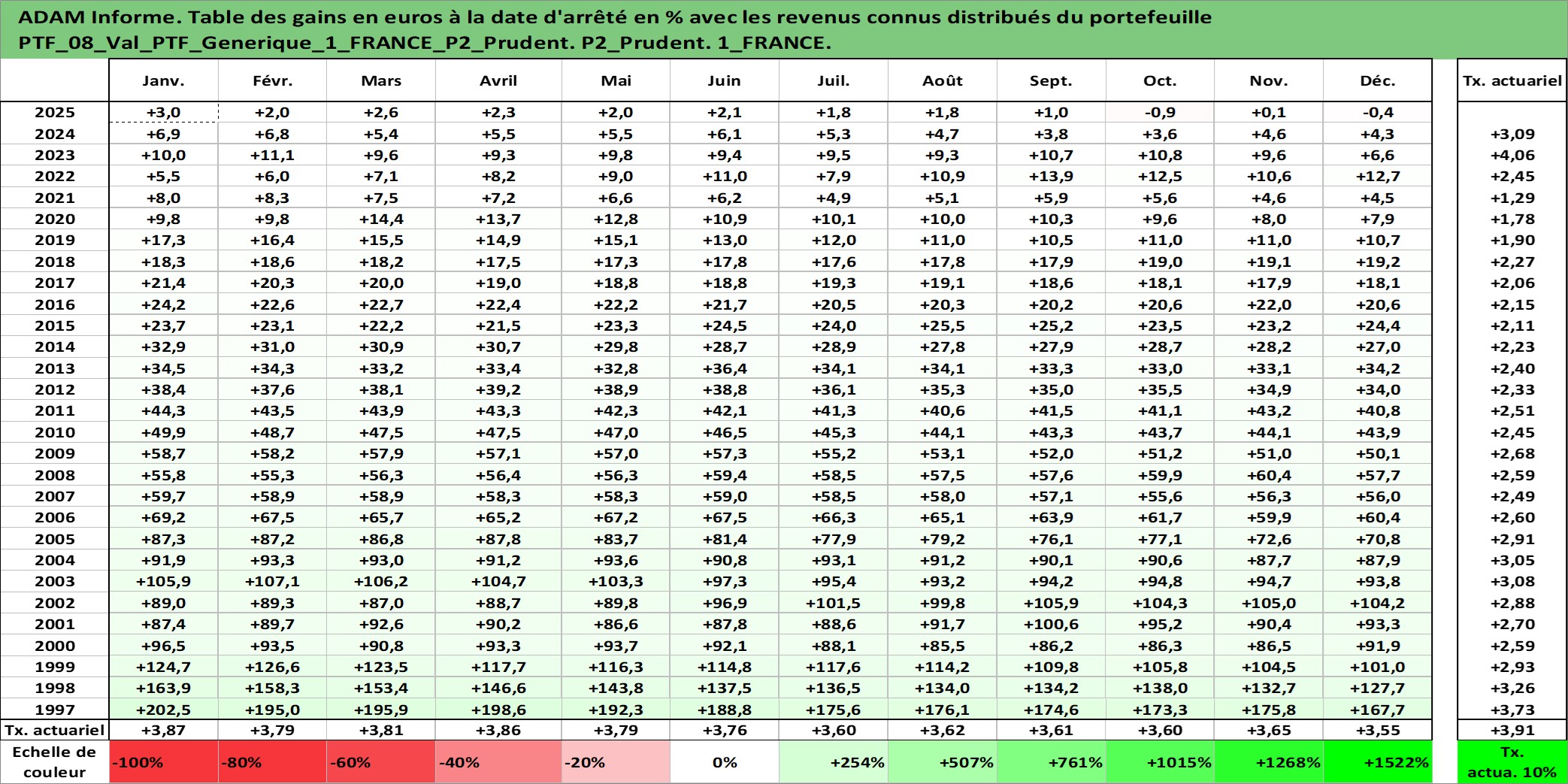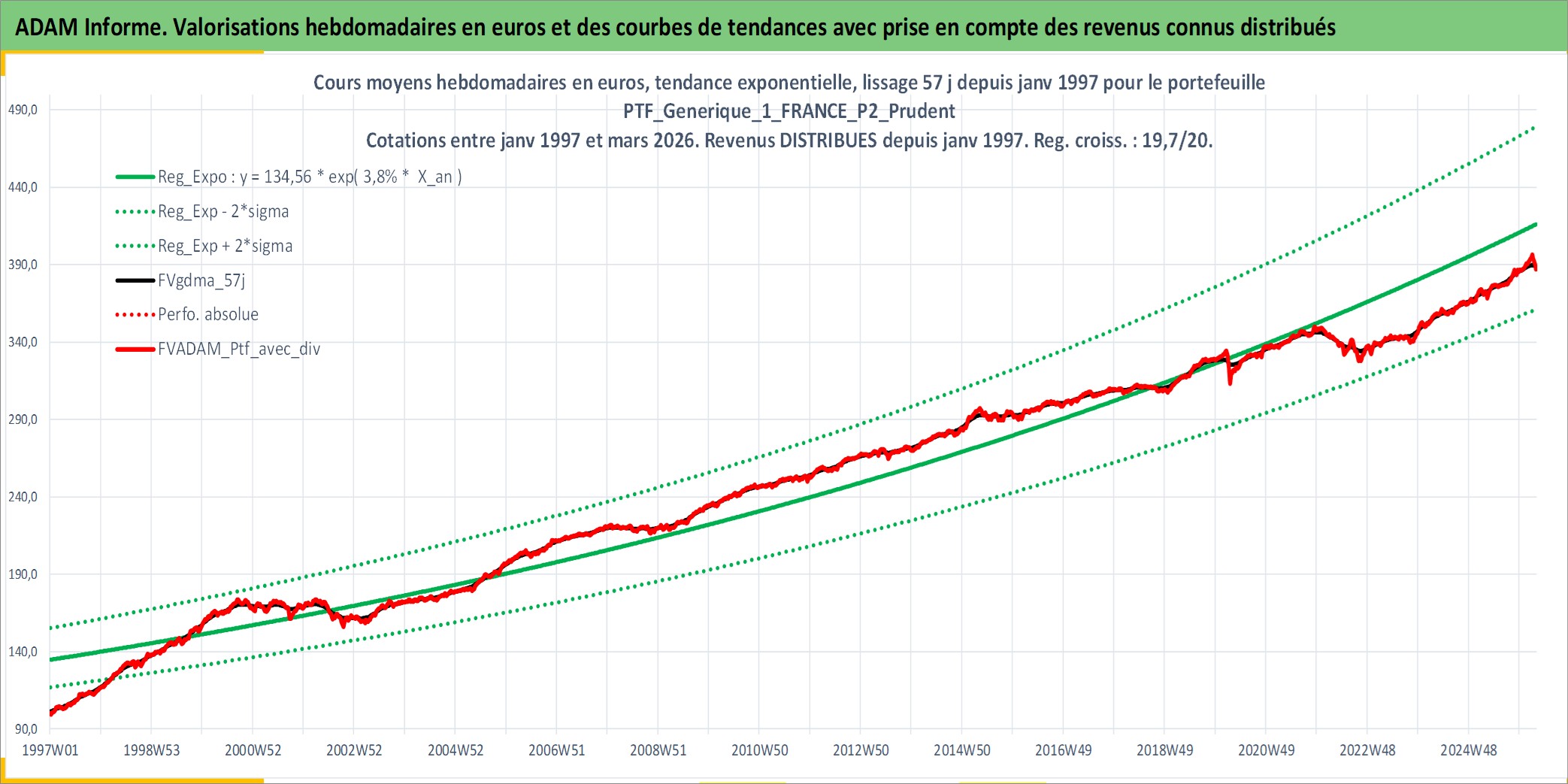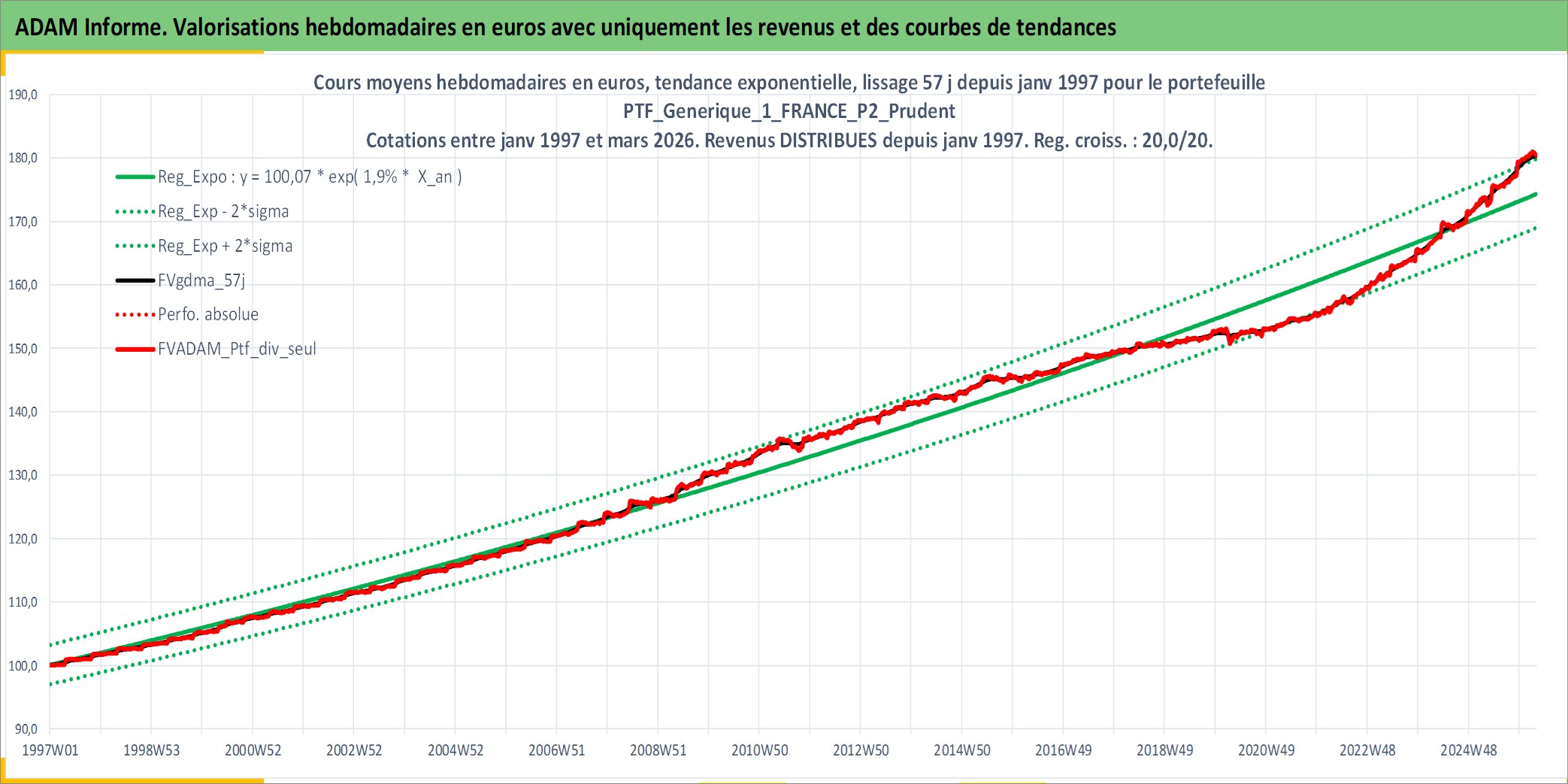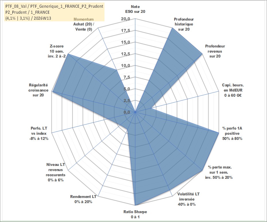 Site dédié aux investisseursPage dédiée sur site financeAnalyse des valorisations hebdomadaires du portefeuille PTF_Generique_1_FRANCE_P2_Prudent_8actifs avec un profil P2_Prudent. Ce portefeuille est cote en EUR. Les valorisations couvrent les semaines 1997W01 a 2026W13. Les revenus de cet actif financier sont pris en compte depuis la semaine 1997W01. La note ESG de cet actif n'est pas connue.