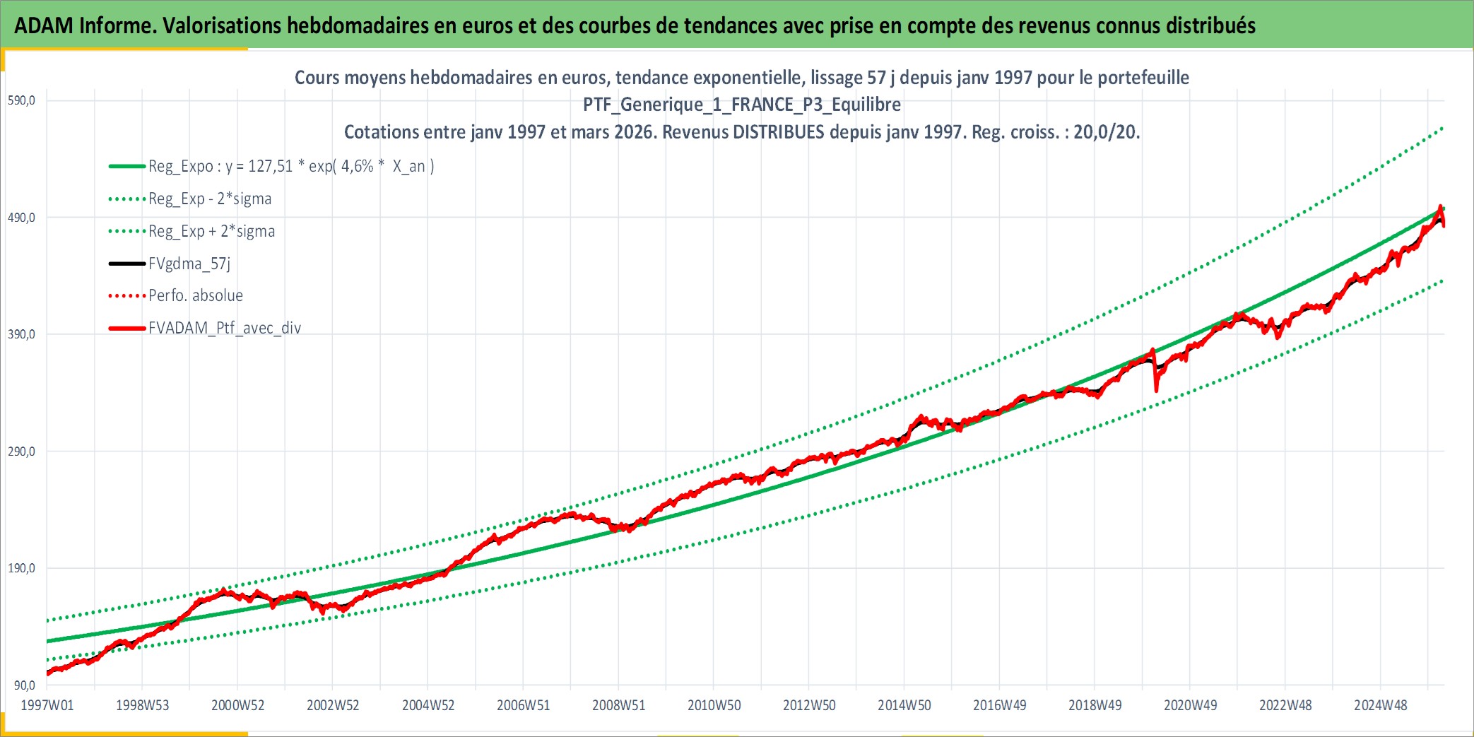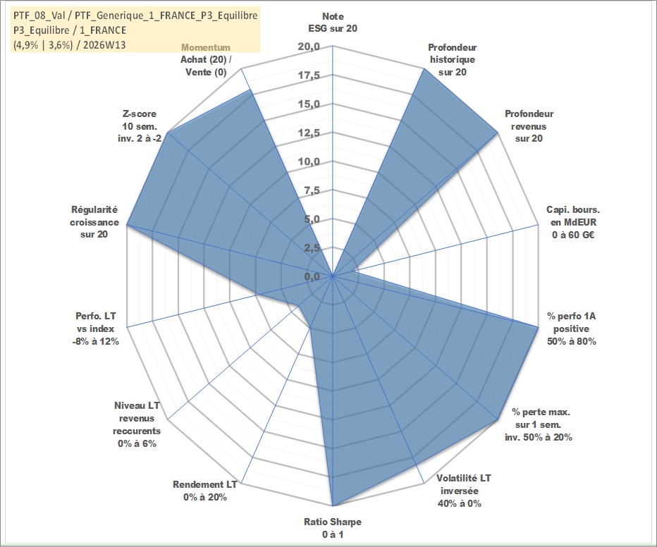 Site dédié aux investisseursPage dédiée sur site financeAnalyse des valorisations hebdomadaires du portefeuille PTF_Generique_1_FRANCE_P3_Equilibre_8actifs avec un profil P3_Equilibre. Ce portefeuille est cote en EUR. Les valorisations couvrent les semaines 1997W01 a 2026W13. Les revenus de cet actif financier sont pris en compte depuis la semaine 1997W01. La note ESG de cet actif n'est pas connue.