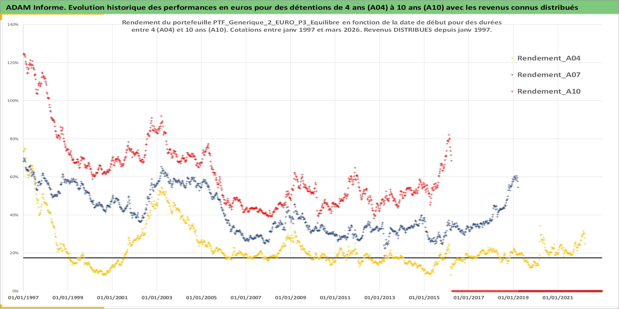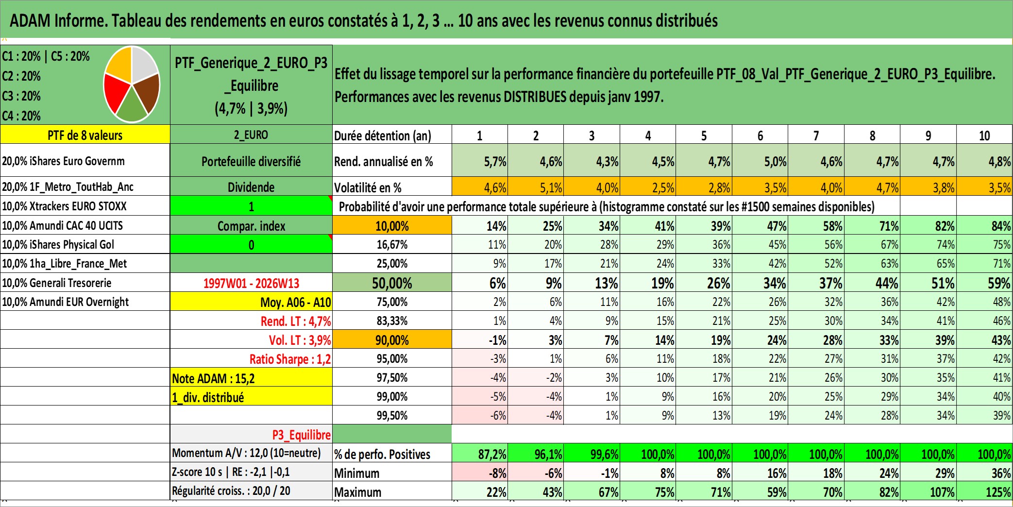 Site dédié aux investisseursPage dédiée sur site financeAnalyse des valorisations hebdomadaires du portefeuille PTF_Generique_2_EURO_P3_Equilibre_8actifs avec un profil P3_Equilibre. Ce portefeuille est cote en EUR. Les valorisations couvrent les semaines 1997W01 a 2026W13. Les revenus de cet actif financier sont pris en compte depuis la semaine 1997W01. La note ESG de cet actif n'est pas connue.