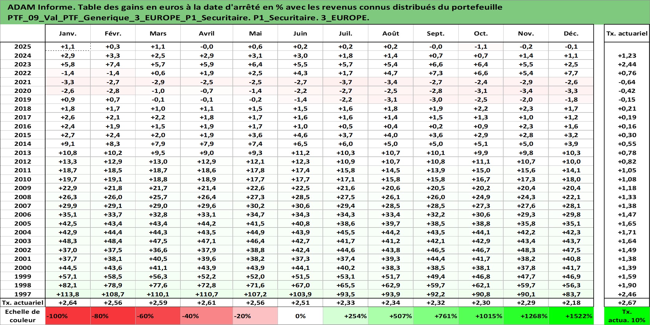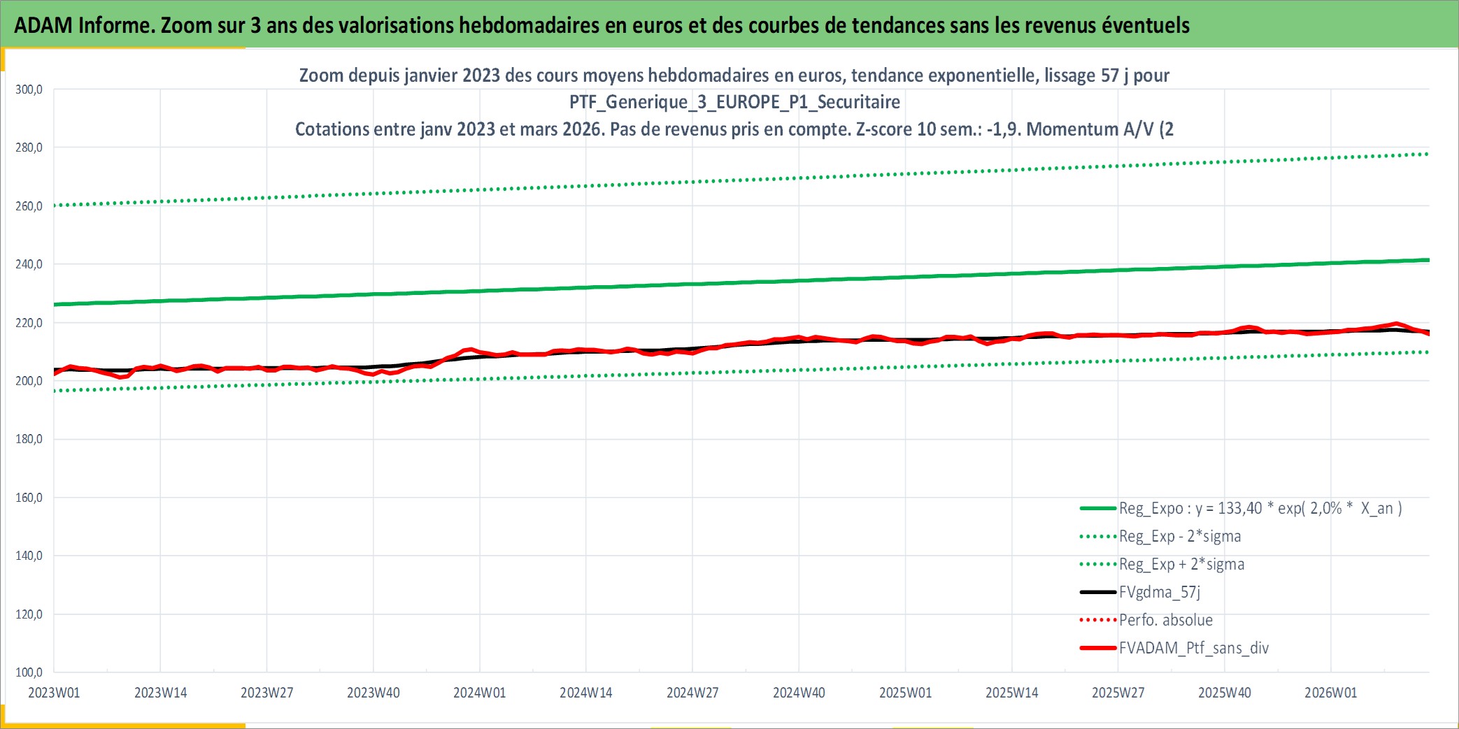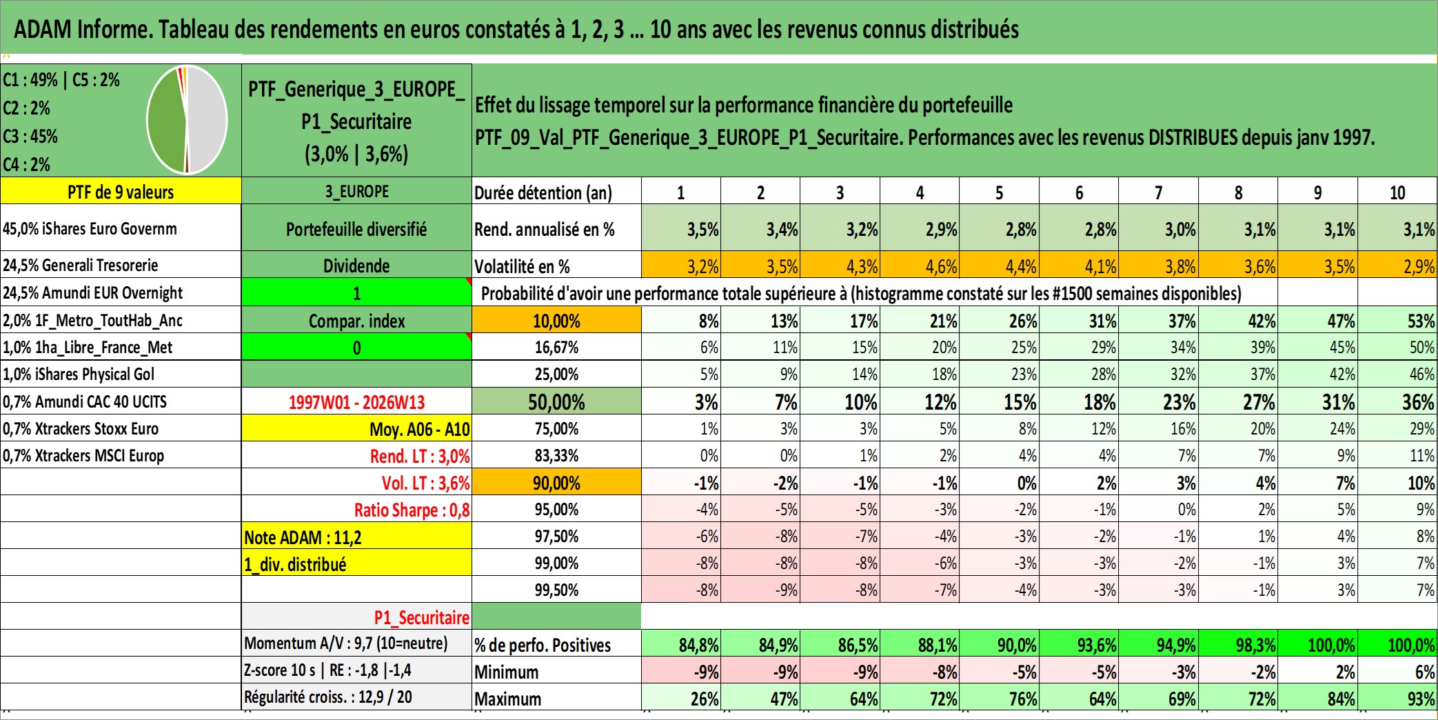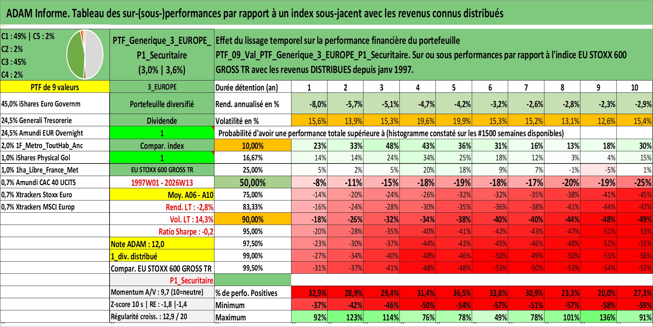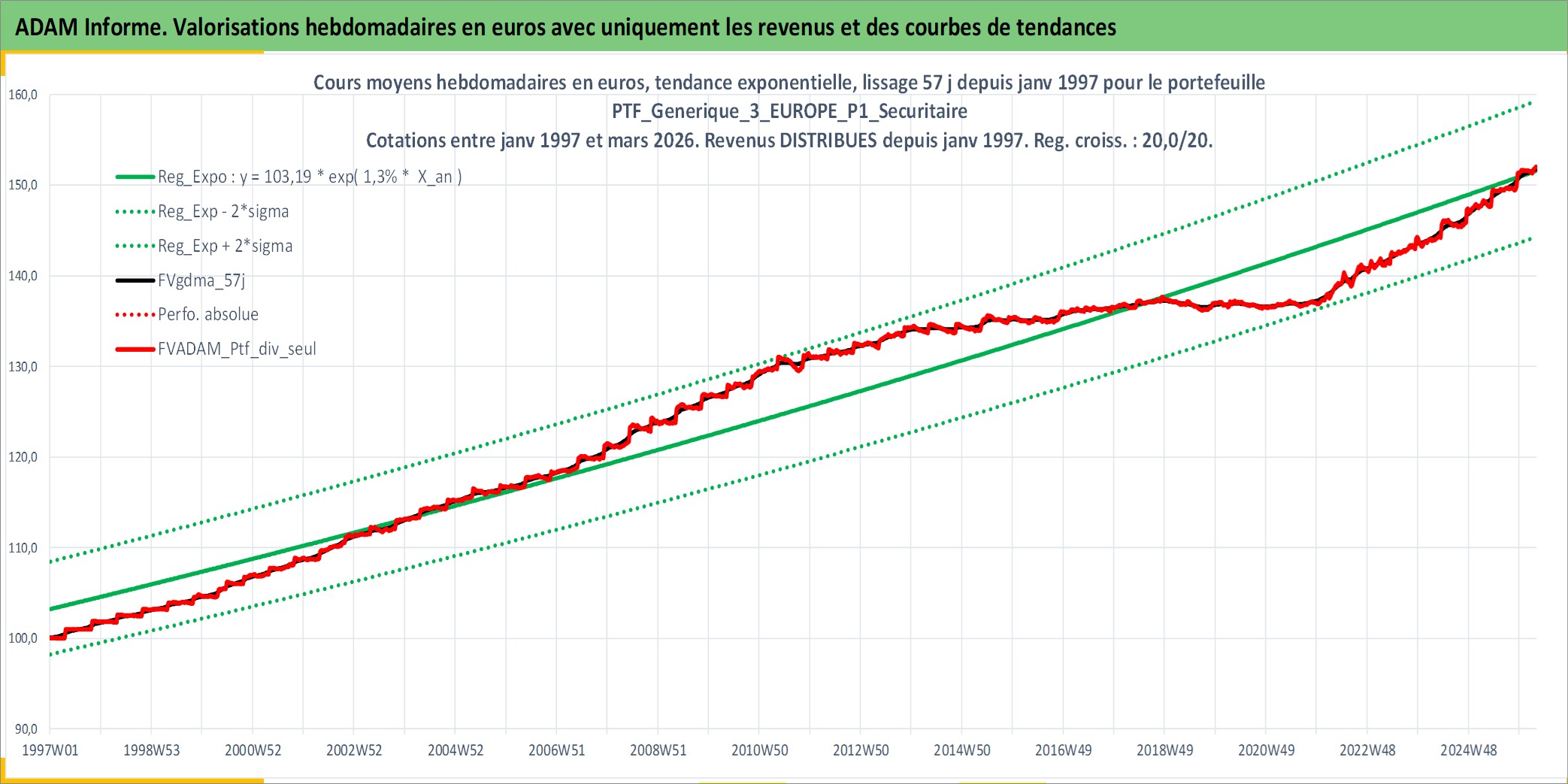 Site dédié aux investisseursPage dédiée sur site financeAnalyse des valorisations hebdomadaires du portefeuille PTF_Generique_3_EUROPE_P1_Securitaire_9actifs avec un profil P1_Securitaire. Ce portefeuille est cote en EUR. Les valorisations couvrent les semaines 1997W01 a 2026W13. Les revenus de cet actif financier sont pris en compte depuis la semaine 1997W01. La note ESG de cet actif n'est pas connue.