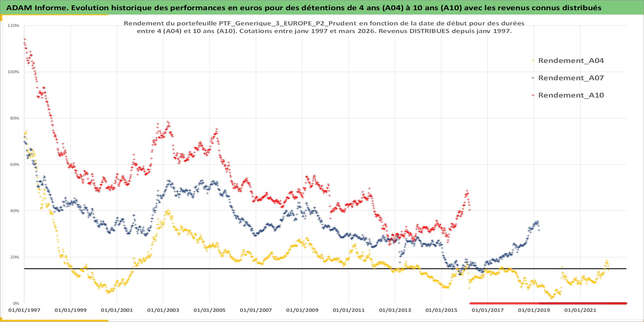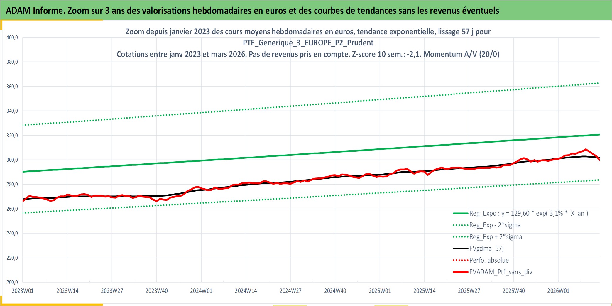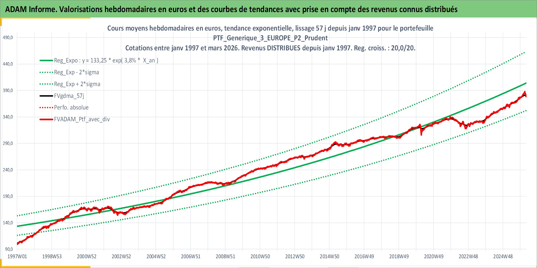 Site dédié aux investisseursPage dédiée sur site financeAnalyse des valorisations hebdomadaires du portefeuille PTF_Generique_3_EUROPE_P2_Prudent_9actifs avec un profil P2_Prudent. Ce portefeuille est cote en EUR. Les valorisations couvrent les semaines 1997W01 a 2026W13. Les revenus de cet actif financier sont pris en compte depuis la semaine 1997W01. La note ESG de cet actif n'est pas connue.