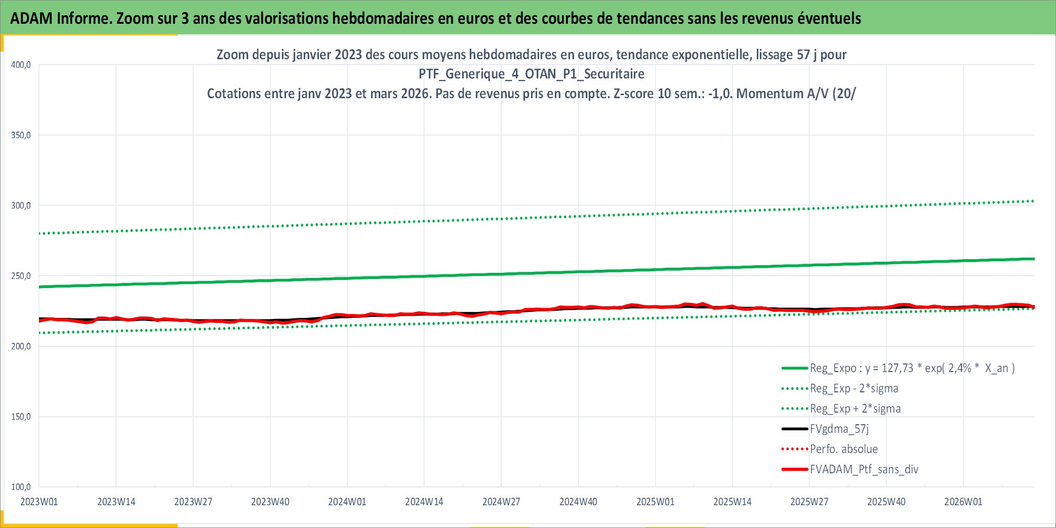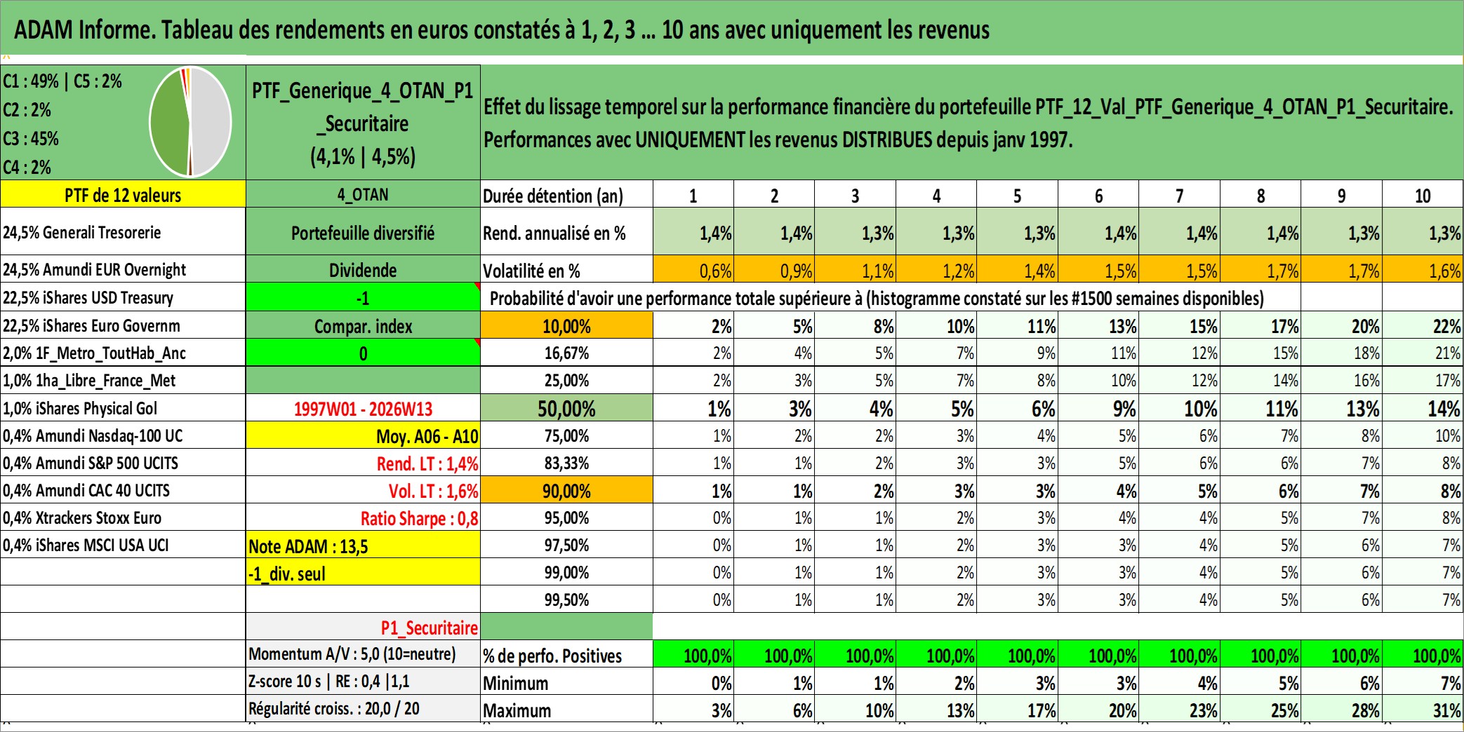 Site dédié aux investisseursPage dédiée sur site financeAnalyse des valorisations hebdomadaires du portefeuille PTF_Generique_4_OTAN_P1_Securitaire_12actifs avec un profil P1_Securitaire. Ce portefeuille est cote en EUR. Les valorisations couvrent les semaines 1997W01 a 2026W13. Les revenus de cet actif financier sont pris en compte depuis la semaine 1997W01. La note ESG de cet actif n'est pas connue.
