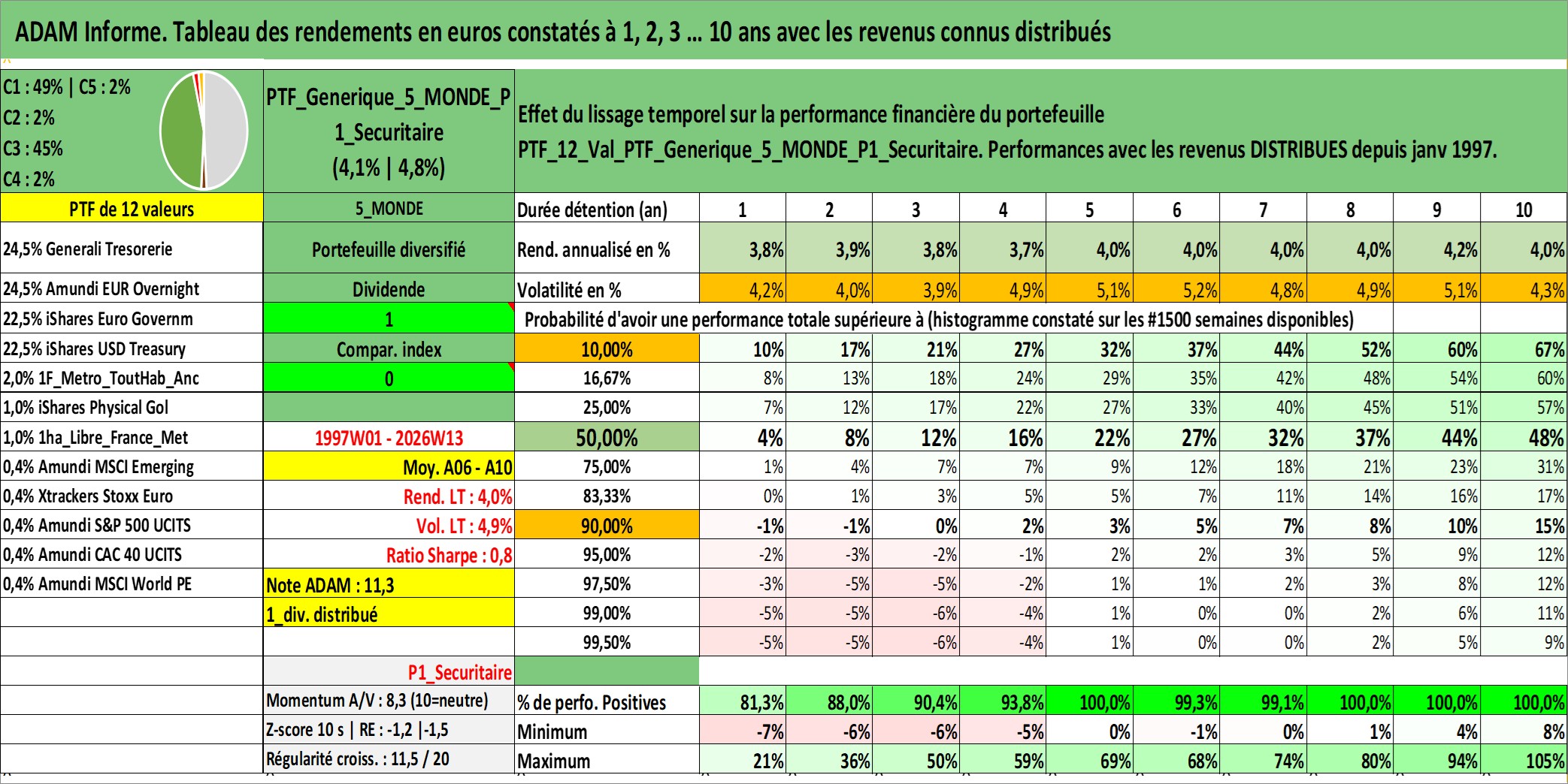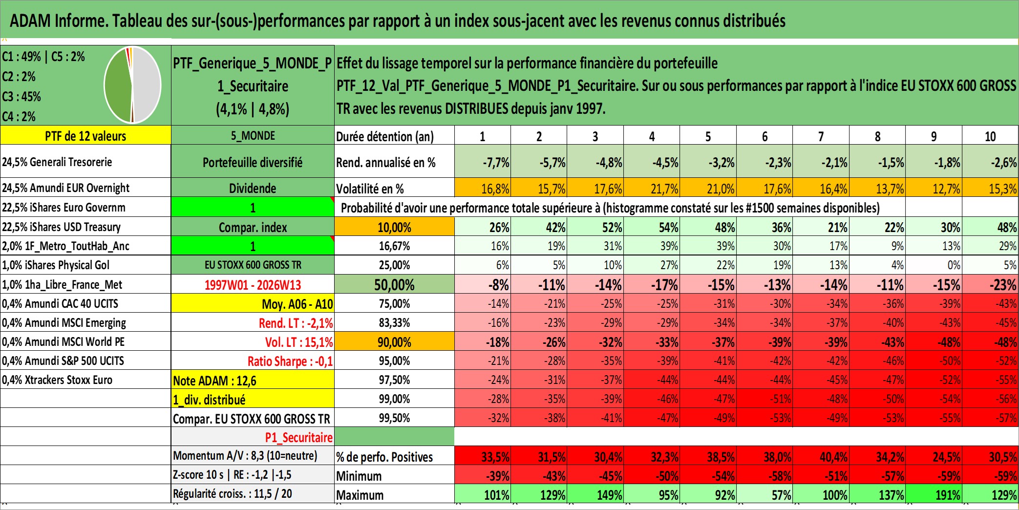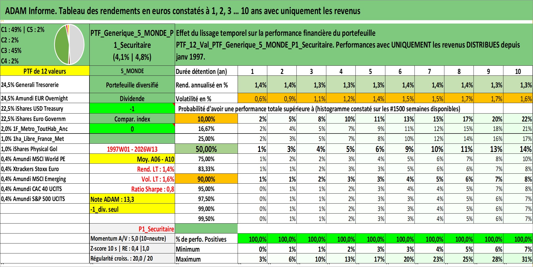 Site dédié aux investisseursPage dédiée sur site financeAnalyse des valorisations hebdomadaires du portefeuille PTF_Generique_5_MONDE_P1_Securitaire_12actifs avec un profil P1_Securitaire. Ce portefeuille est cote en EUR. Les valorisations couvrent les semaines 1997W01 a 2026W13. Les revenus de cet actif financier sont pris en compte depuis la semaine 1997W01. La note ESG de cet actif n'est pas connue.