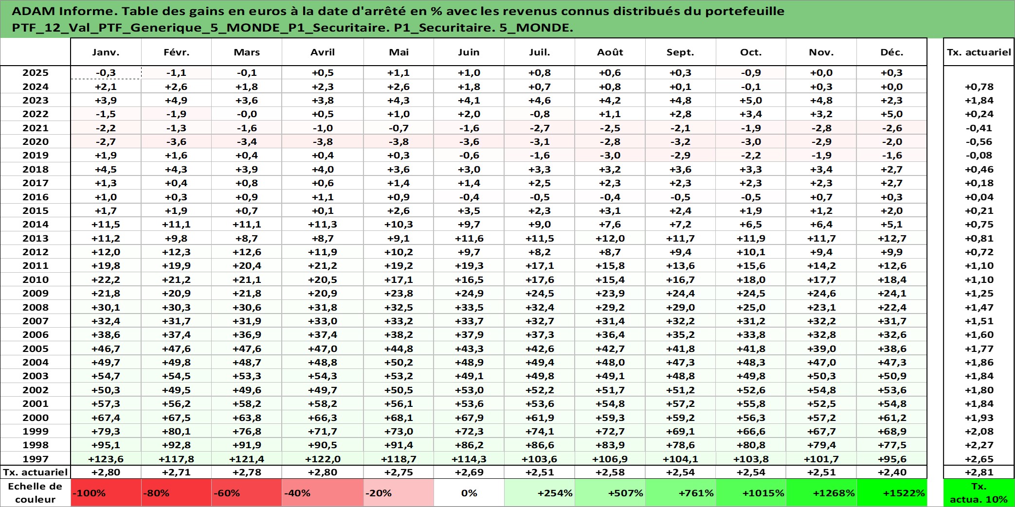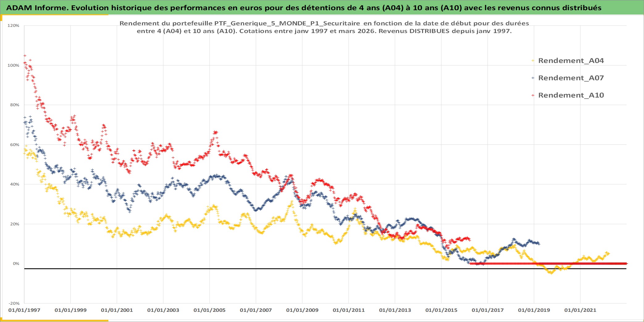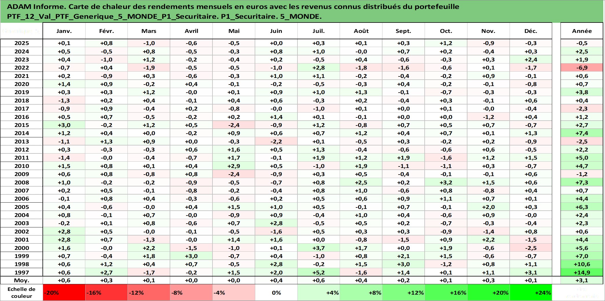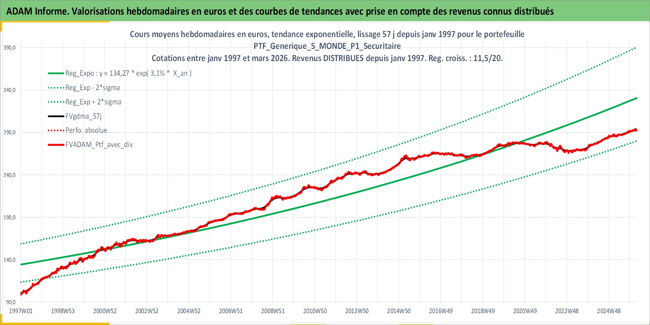 Site dédié aux investisseursPage dédiée sur site financeAnalyse des valorisations hebdomadaires du portefeuille PTF_Generique_5_MONDE_P1_Securitaire_12actifs avec un profil P1_Securitaire. Ce portefeuille est cote en EUR. Les valorisations couvrent les semaines 1997W01 a 2026W13. Les revenus de cet actif financier sont pris en compte depuis la semaine 1997W01. La note ESG de cet actif n'est pas connue.