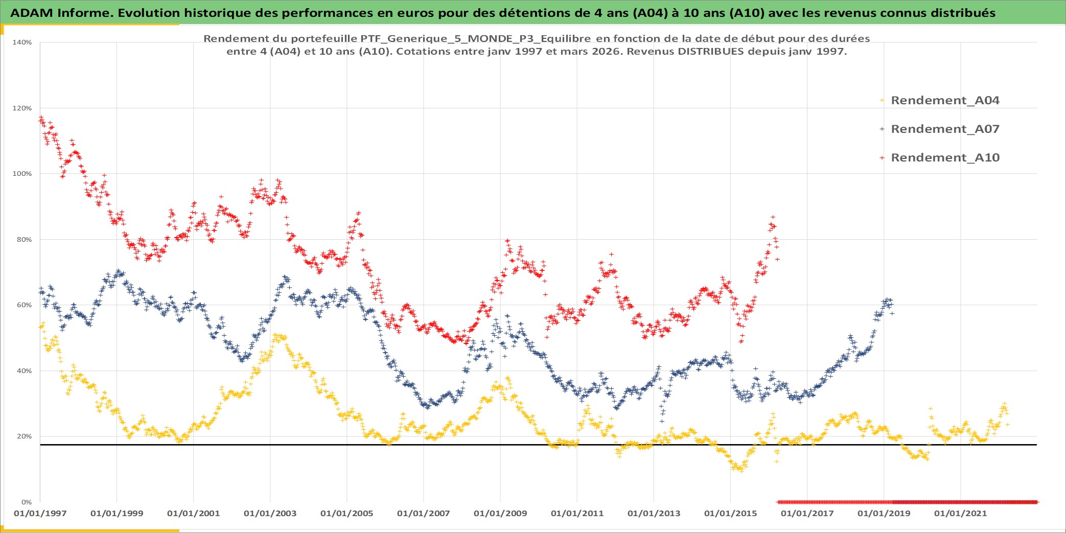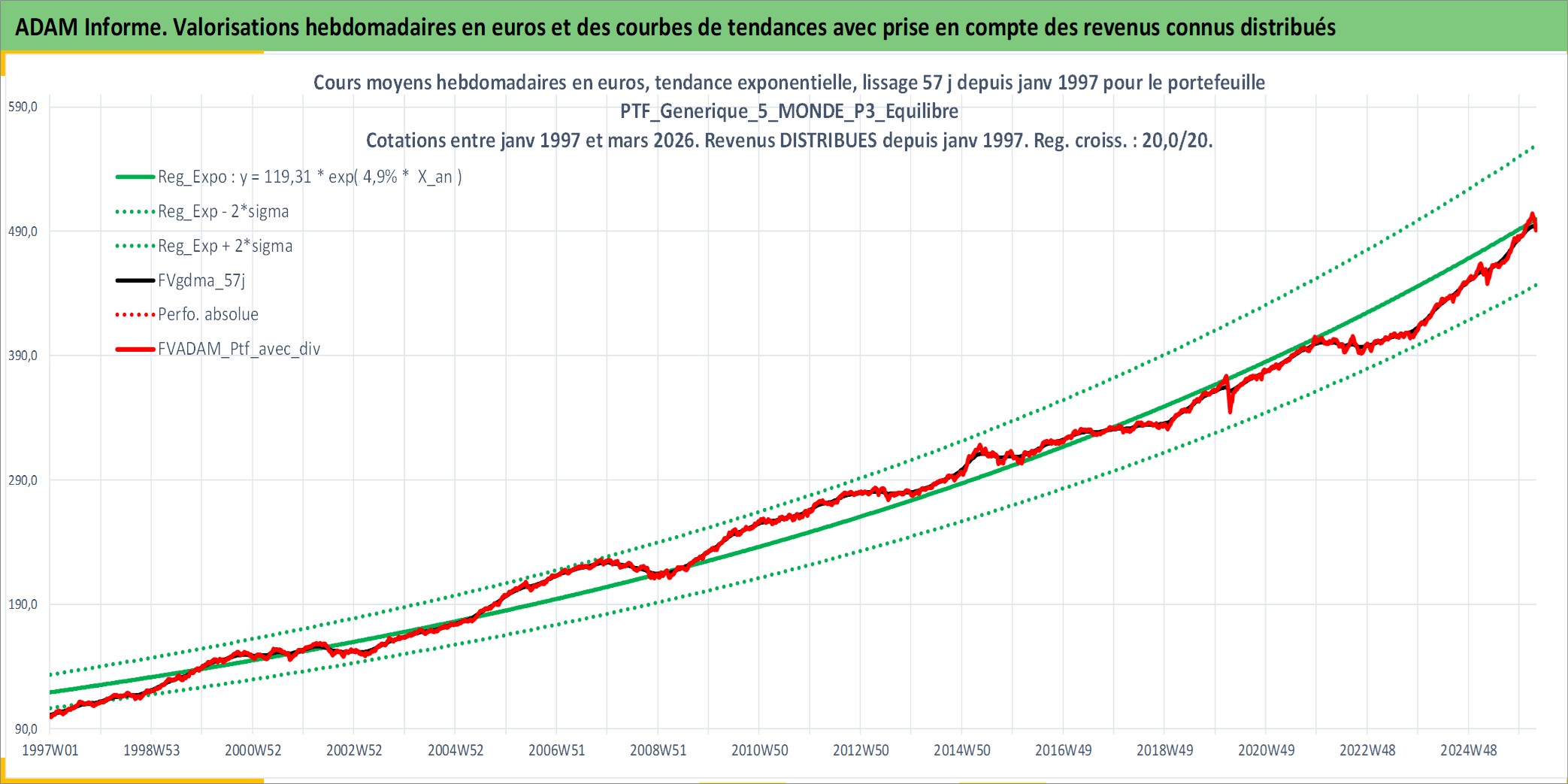 Site dédié aux investisseursPage dédiée sur site financeAnalyse des valorisations hebdomadaires du portefeuille PTF_Generique_5_MONDE_P3_Equilibre_12actifs avec un profil P3_Equilibre. Ce portefeuille est cote en EUR. Les valorisations couvrent les semaines 1997W01 a 2026W13. Les revenus de cet actif financier sont pris en compte depuis la semaine 1997W01. La note ESG de cet actif n'est pas connue.