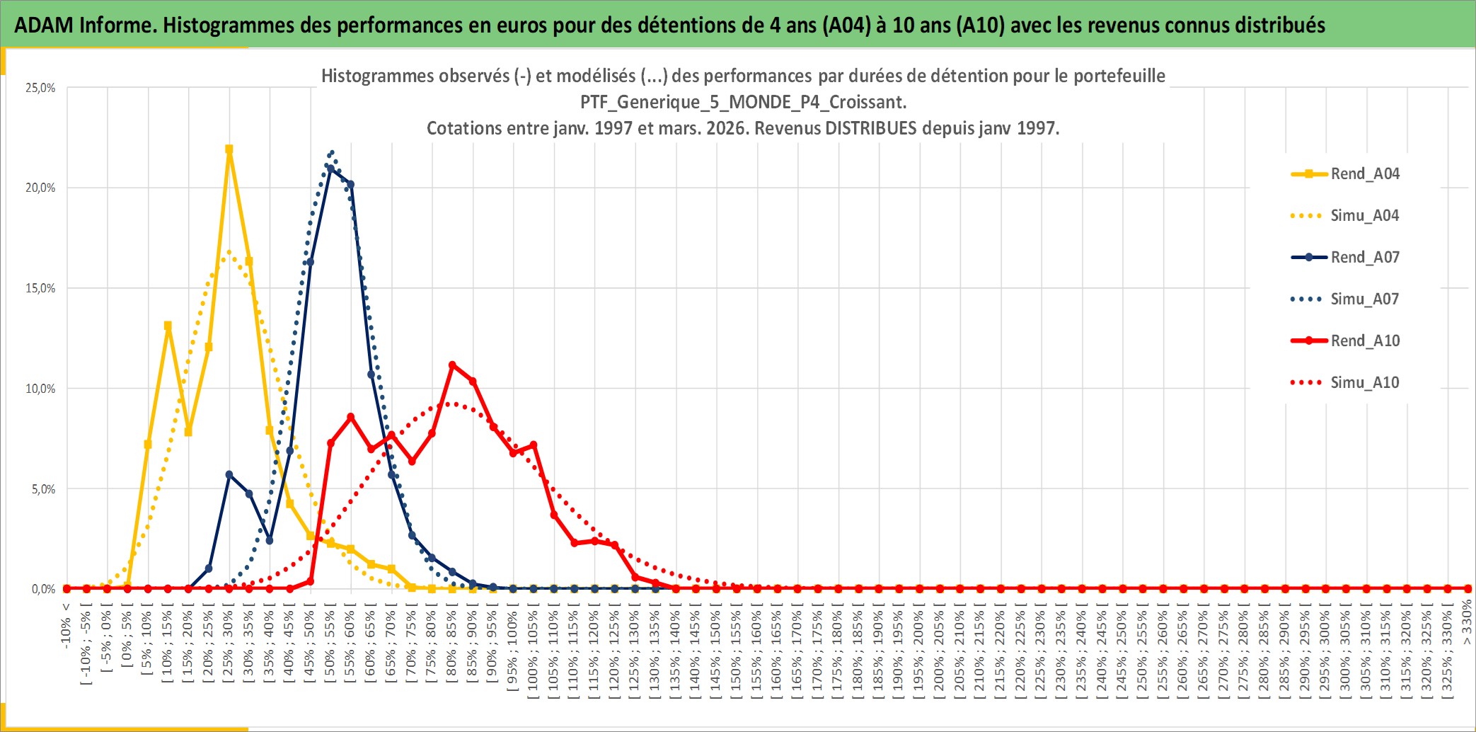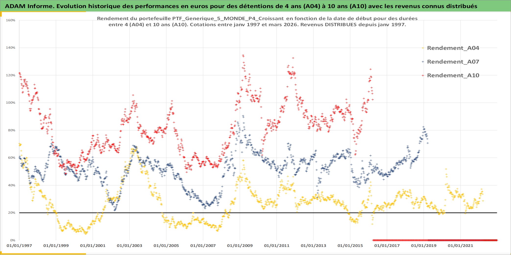 Site dédié aux investisseursPage dédiée sur site financeAnalyse des valorisations hebdomadaires du portefeuille PTF_Generique_5_MONDE_P4_Croissant_12actifs avec un profil P4_Croissant. Ce portefeuille est cote en EUR. Les valorisations couvrent les semaines 1997W01 a 2026W13. Les revenus de cet actif financier sont pris en compte depuis la semaine 1997W01. La note ESG de cet actif n'est pas connue.