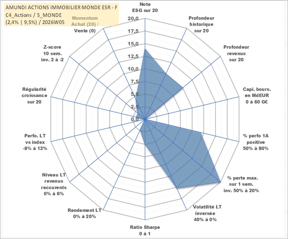 Site dédié aux investisseursPage dédiée sur site financeAnalyse des valorisations hebdomadaires du fonds AMUNDI ACTIONS IMMOBILIER MONDE ESR - F PEE_E2C Acc. Cet actif est cote en EUR. Les valorisations couvrent les semaines 2012W21 a 2026W05. Les revenus de cet actif financier sont pris en compte depuis la semaine 2012W21. La note globale ESG de cet actif est estimee a 14.0 (apres rebasage entre 0 et 20).