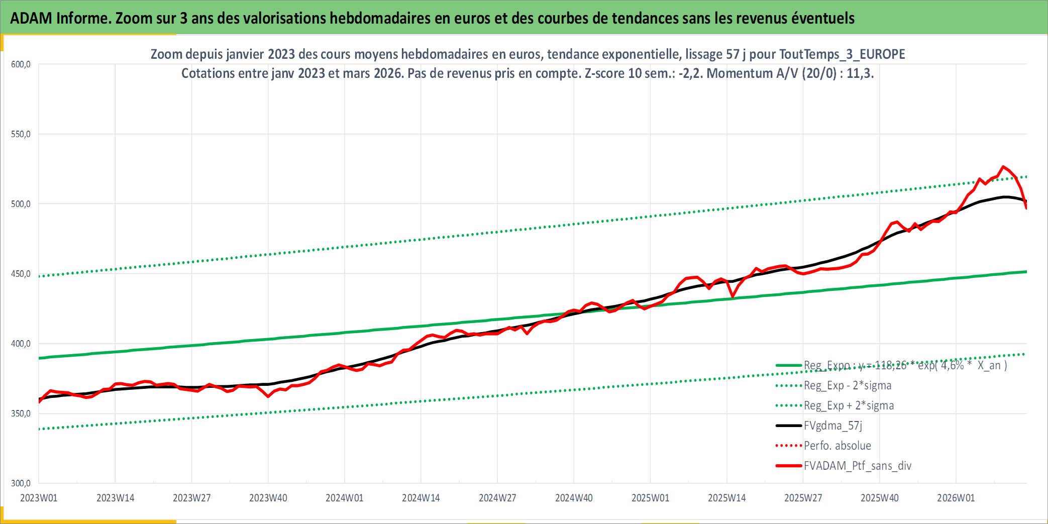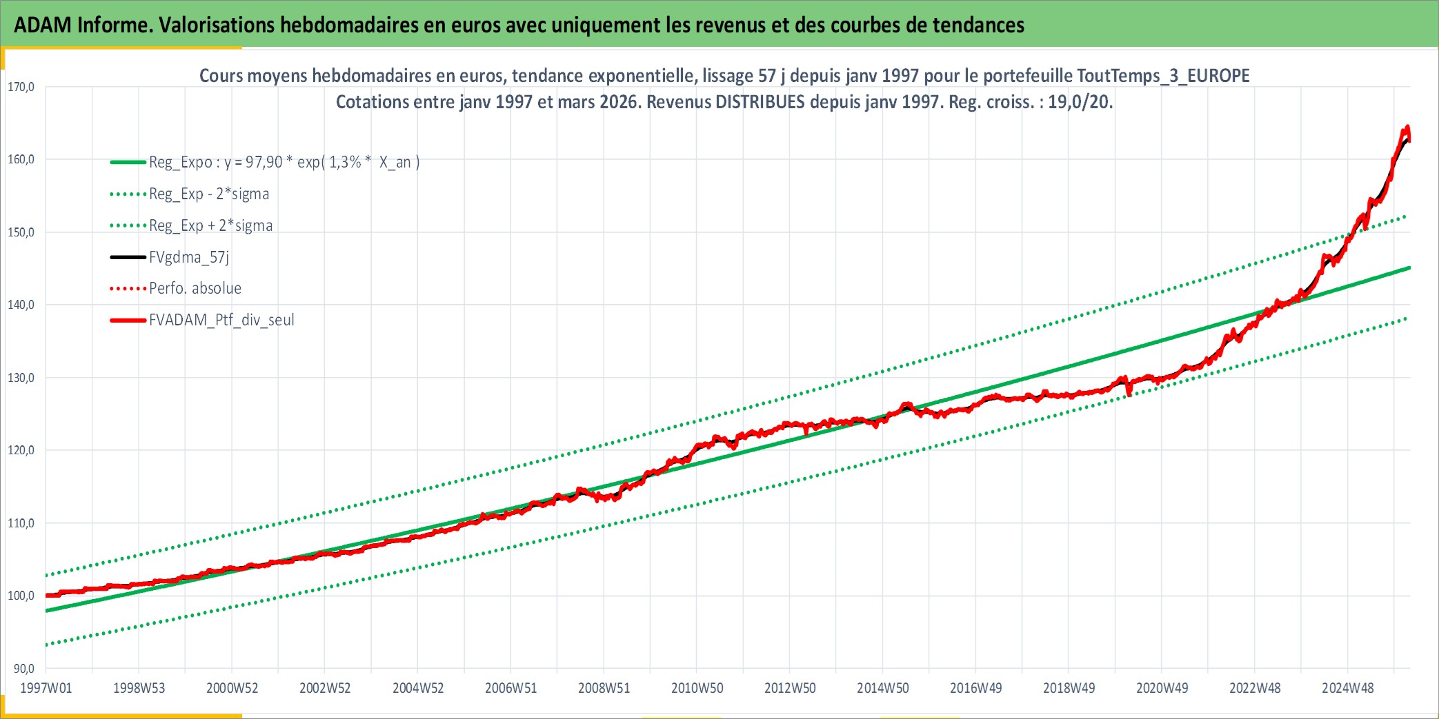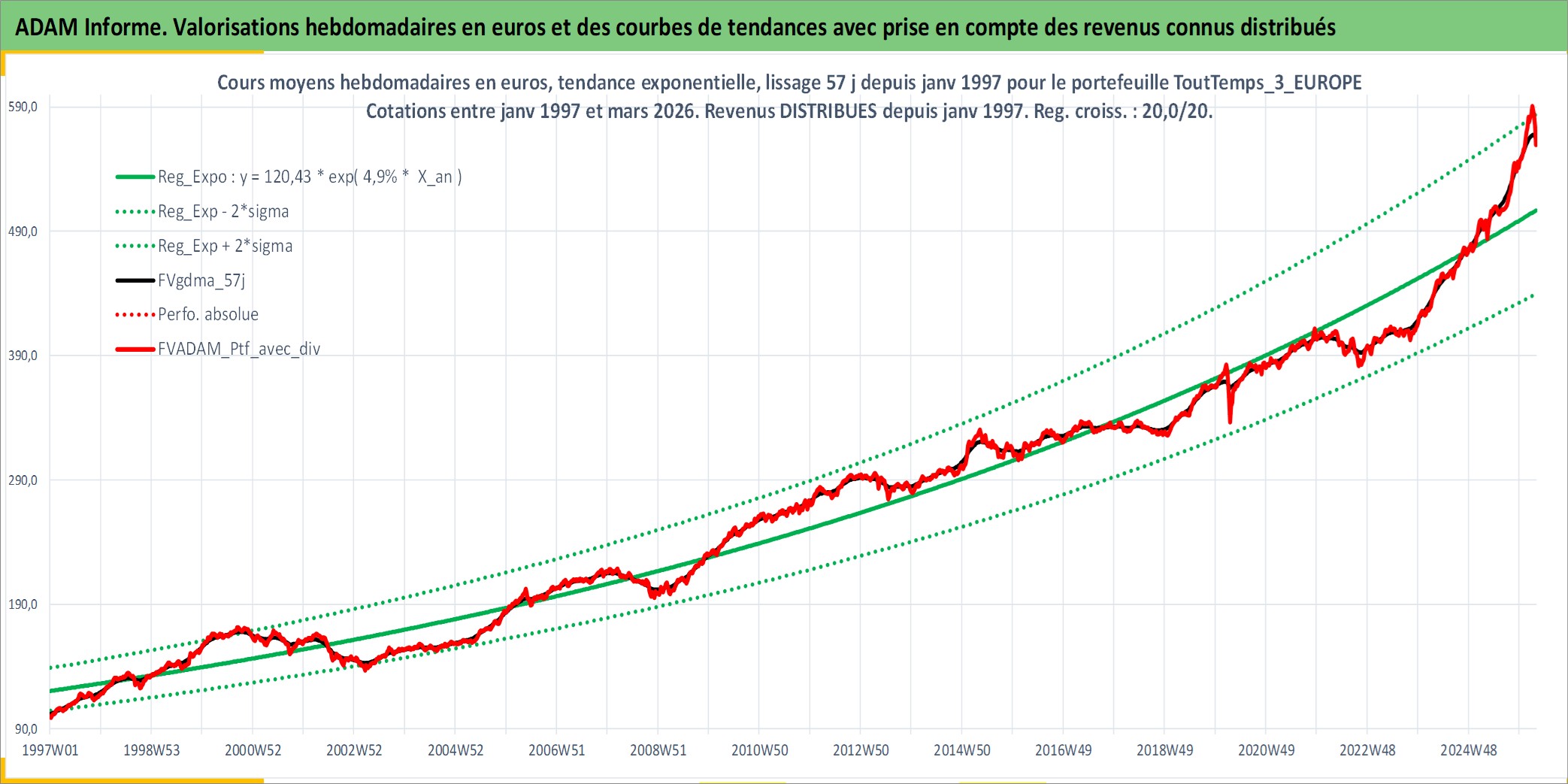 Site dédié aux investisseursPage dédiée sur site financeAnalyse des valorisations hebdomadaires du portefeuille ToutTemps_3_EUROPE_4actifs avec un profil P6_PurActions. Ce portefeuille est cote en EUR. Les valorisations couvrent les semaines 1997W01 a 2026W13. Les revenus de cet actif financier sont pris en compte depuis la semaine 1997W01. La note ESG de cet actif n'est pas connue.