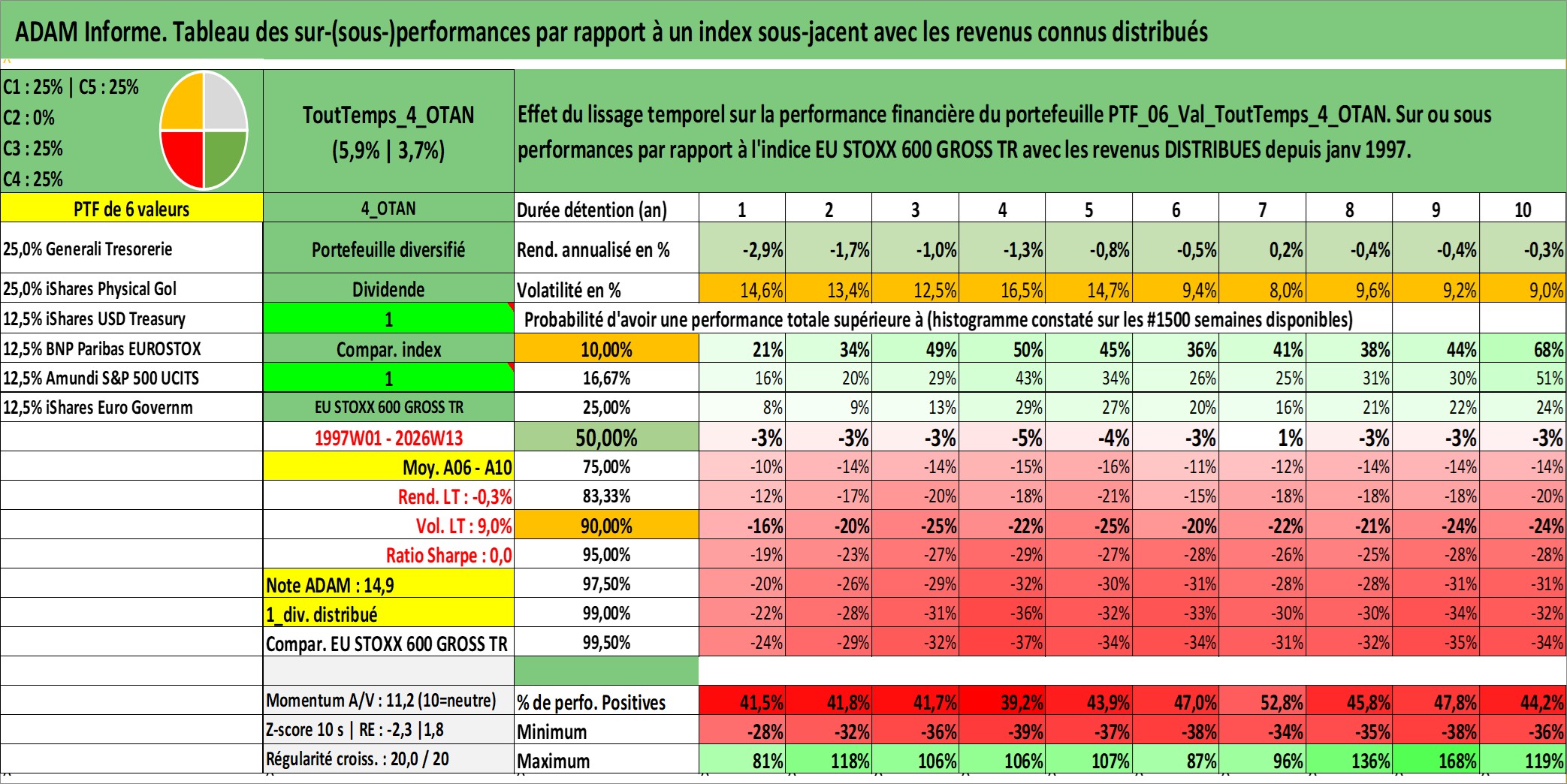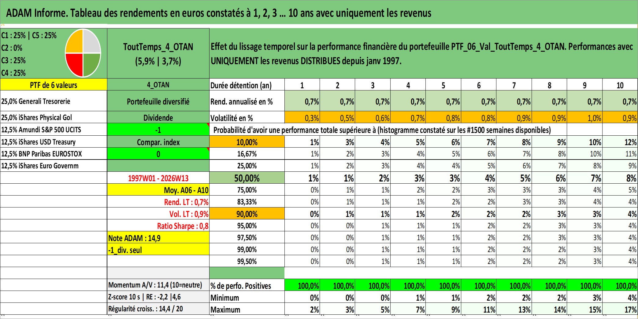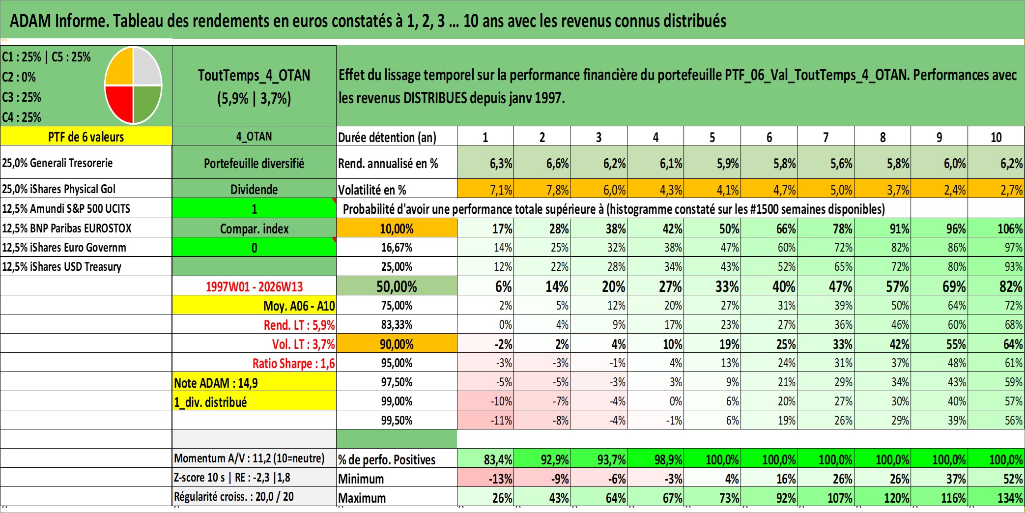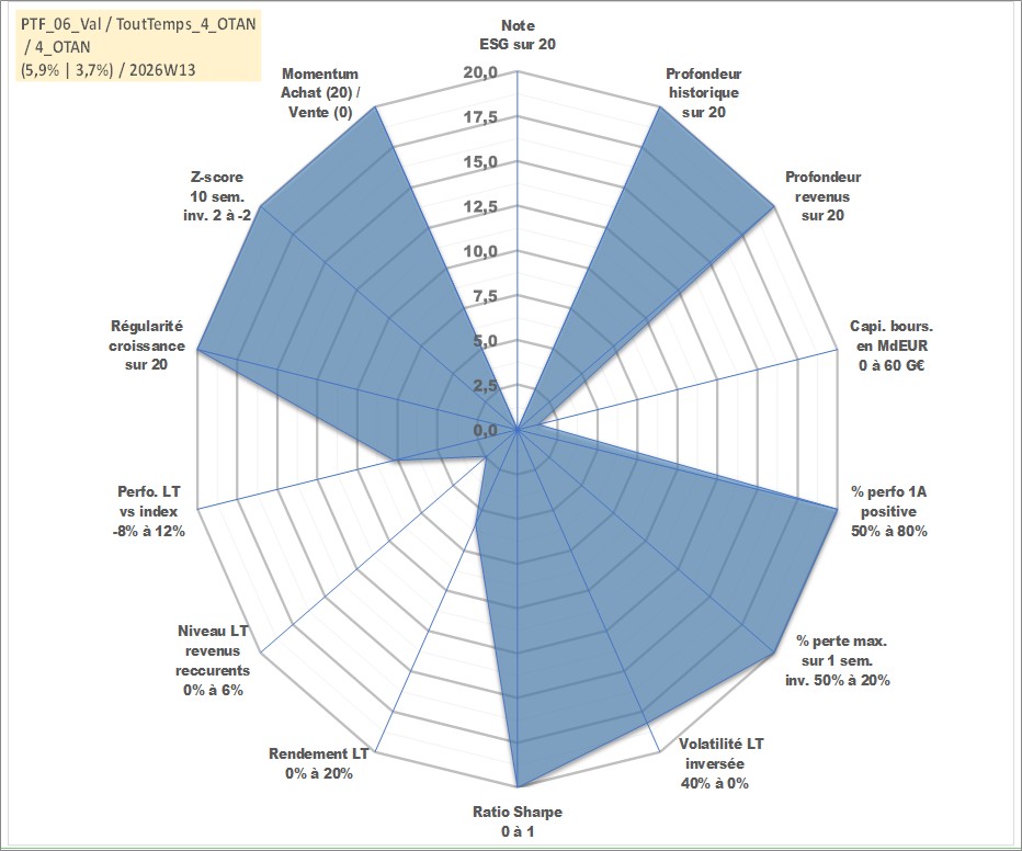 Site dédié aux investisseursPage dédiée sur site financeAnalyse des valorisations hebdomadaires du portefeuille ToutTemps_4_OTAN_6actifs avec un profil P6_PurActions. Ce portefeuille est cote en EUR. Les valorisations couvrent les semaines 1997W01 a 2026W13. Les revenus de cet actif financier sont pris en compte depuis la semaine 1997W01. La note ESG de cet actif n'est pas connue.