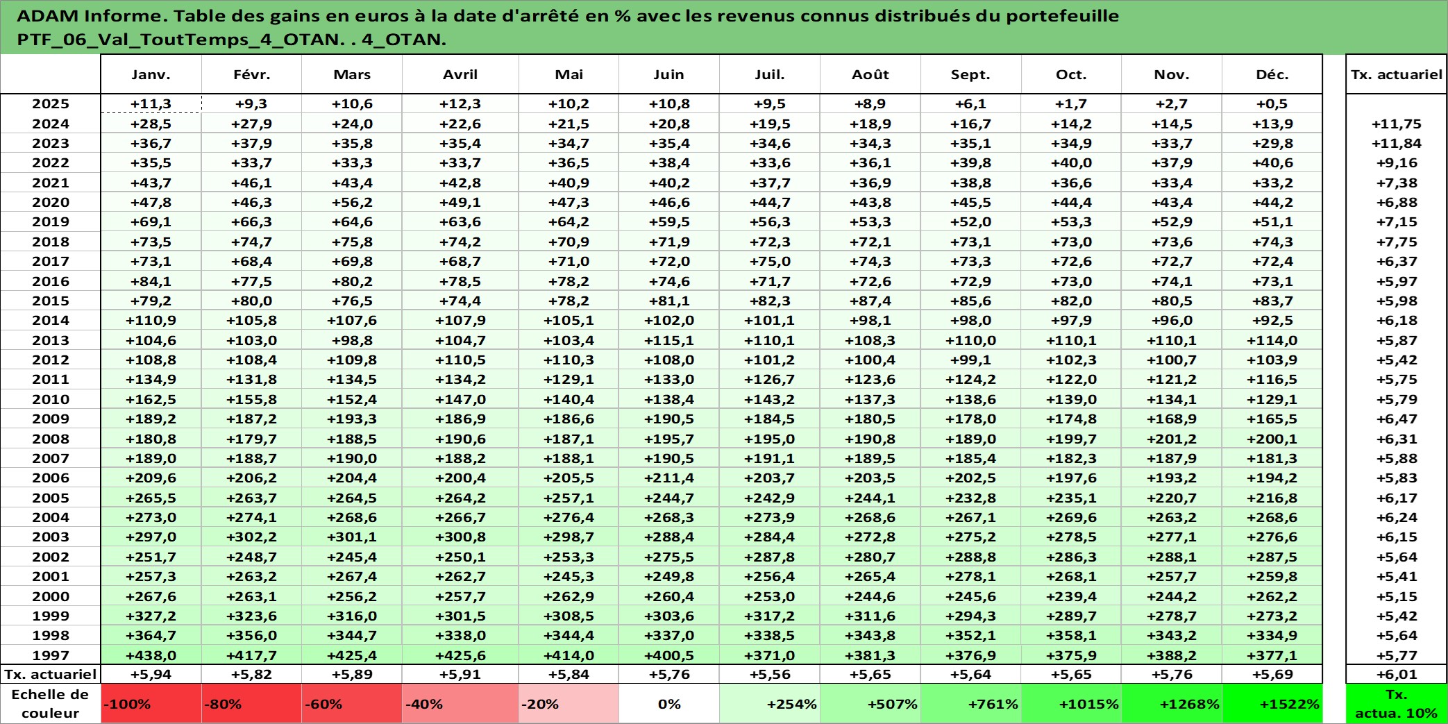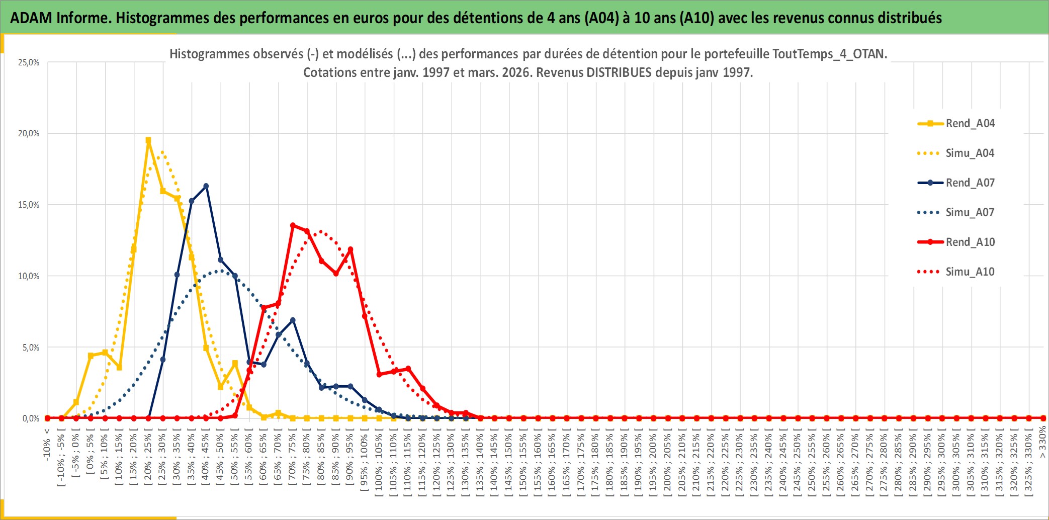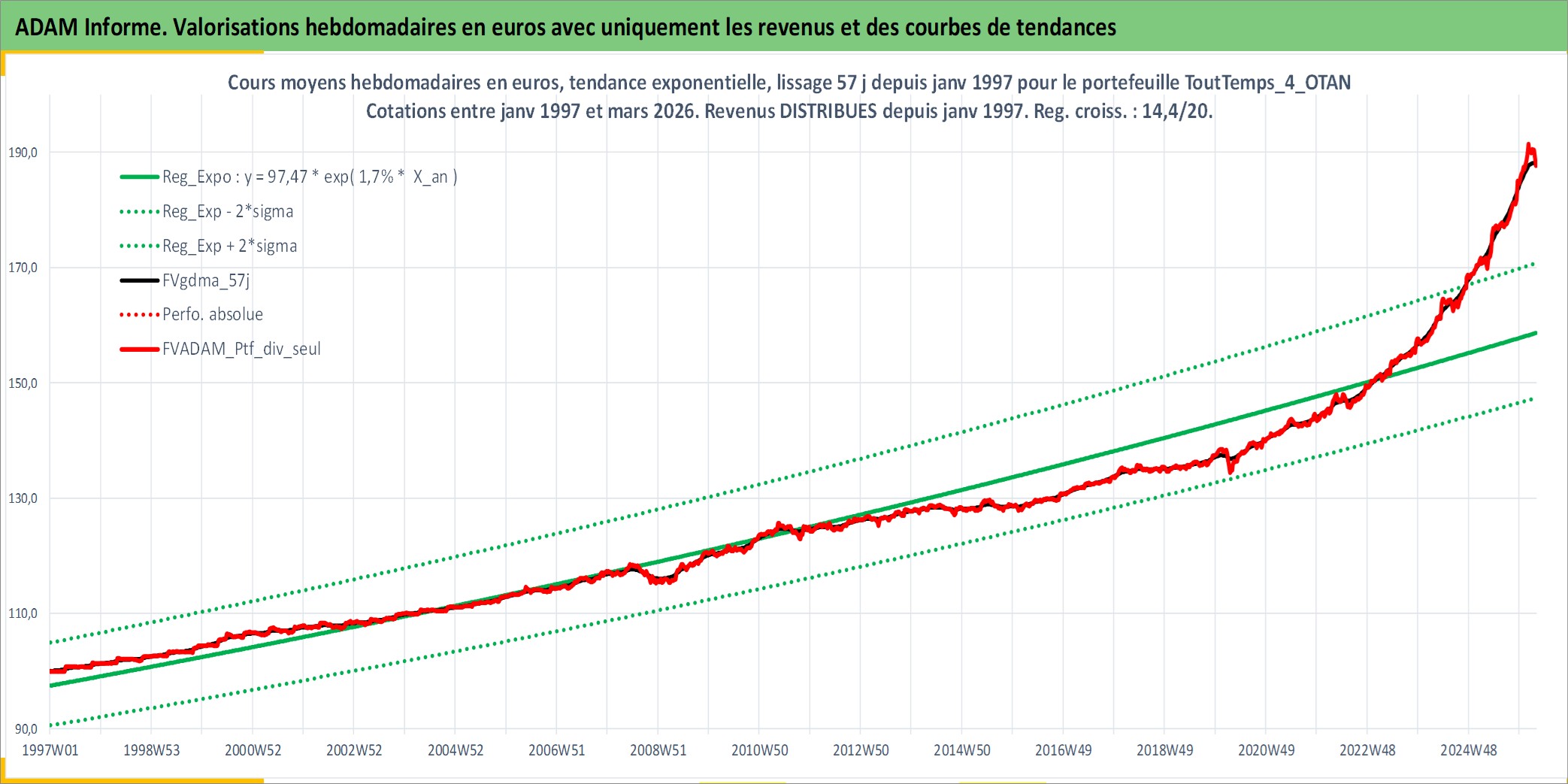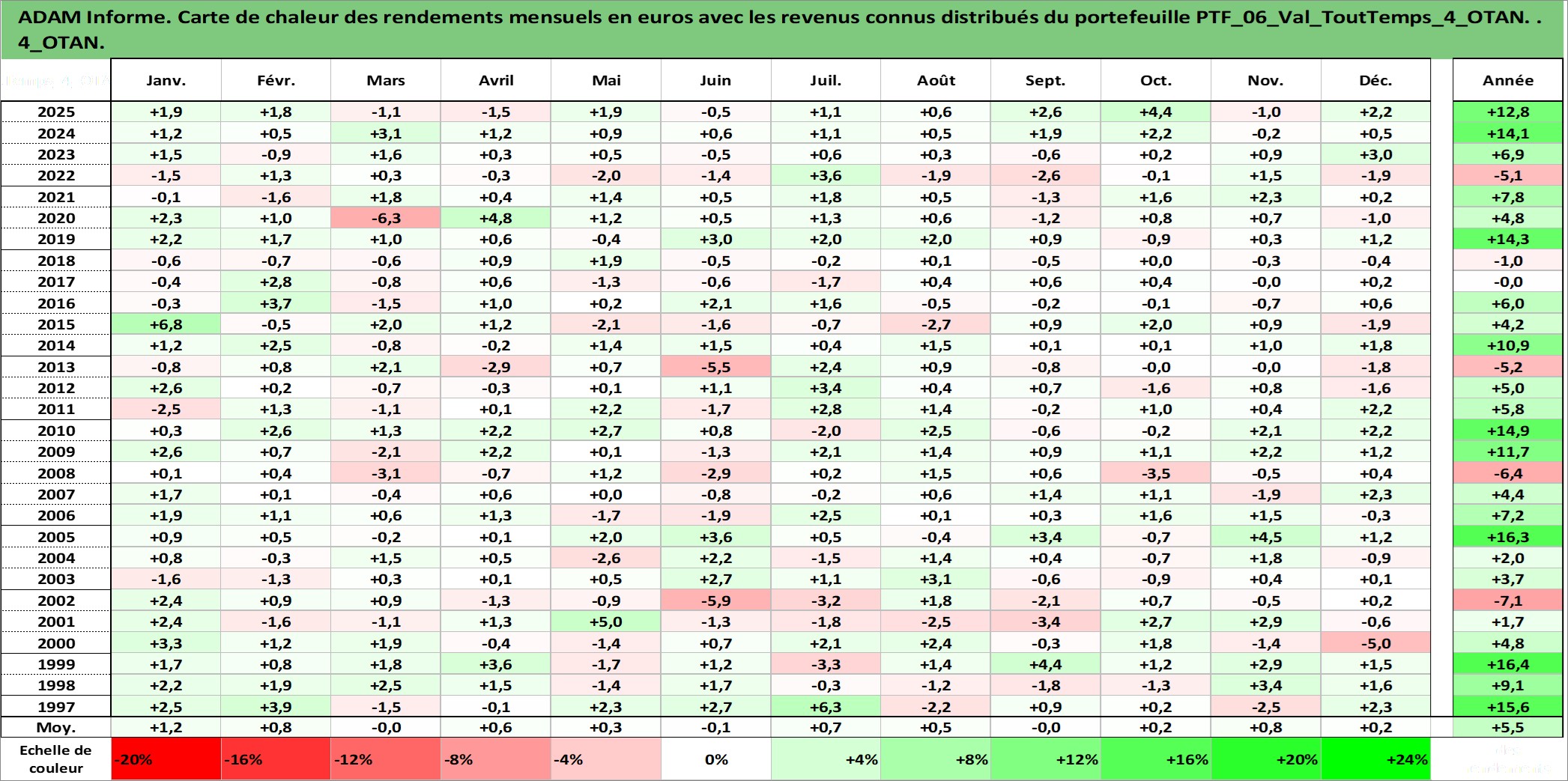 Site dédié aux investisseursPage dédiée sur site financeAnalyse des valorisations hebdomadaires du portefeuille ToutTemps_4_OTAN_6actifs avec un profil P6_PurActions. Ce portefeuille est cote en EUR. Les valorisations couvrent les semaines 1997W01 a 2026W13. Les revenus de cet actif financier sont pris en compte depuis la semaine 1997W01. La note ESG de cet actif n'est pas connue.