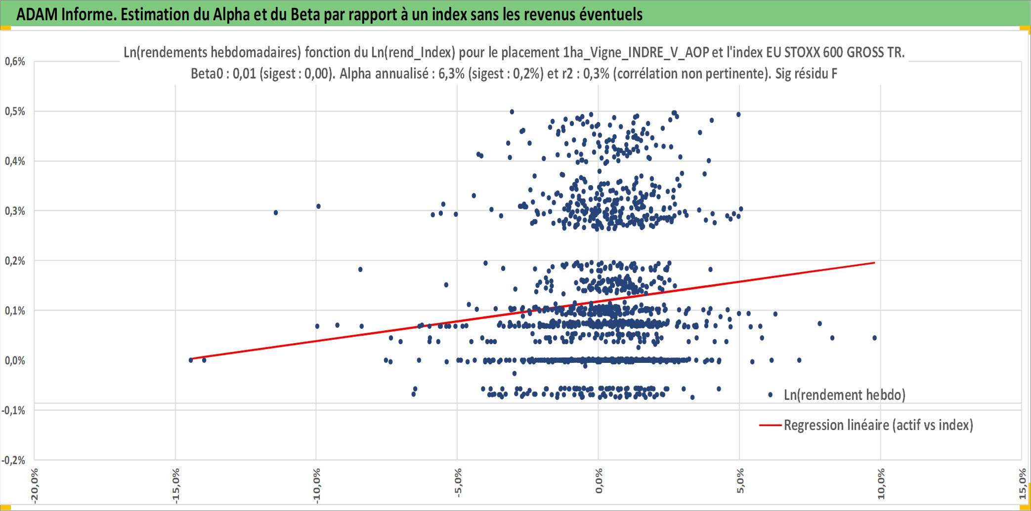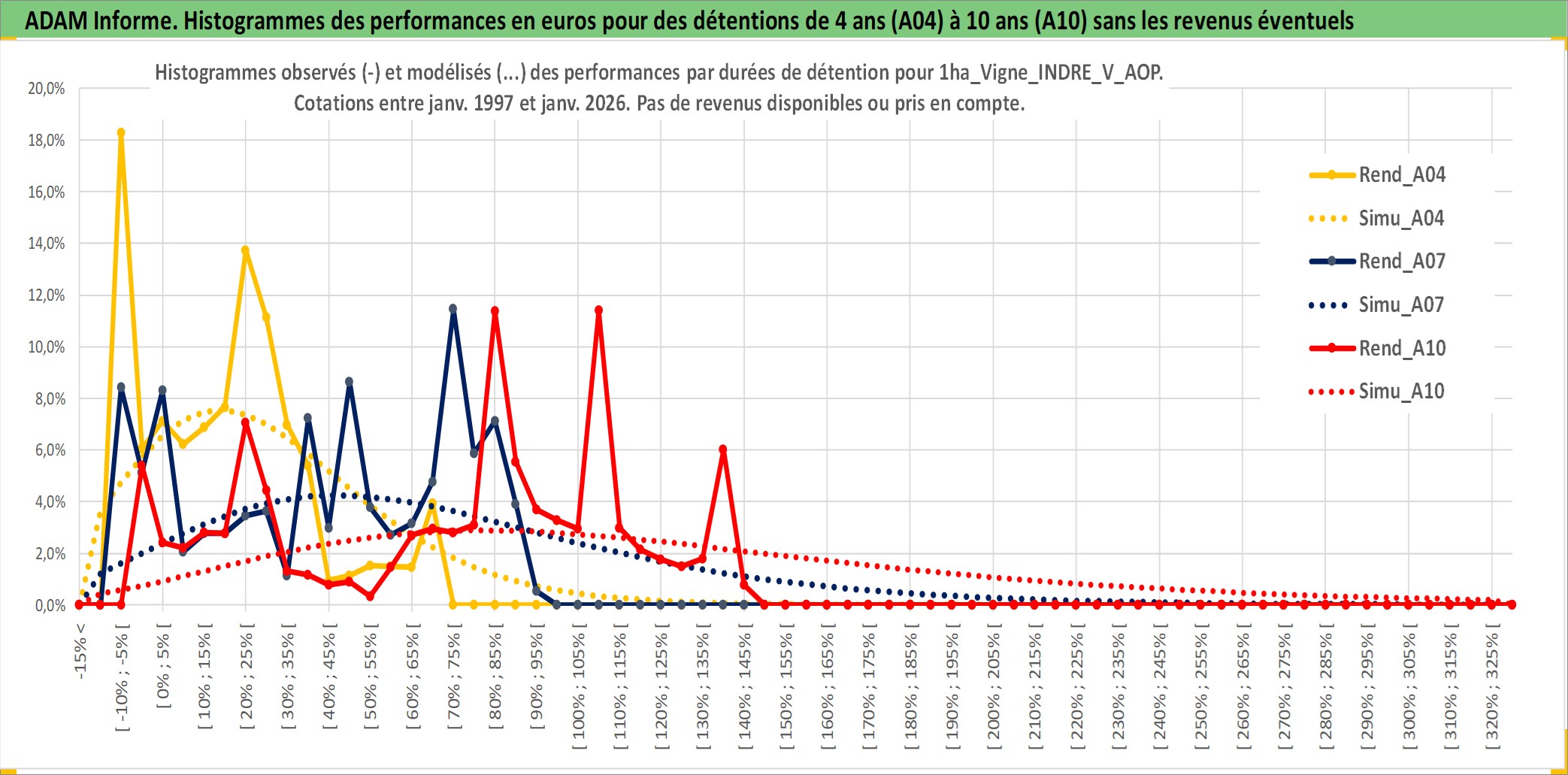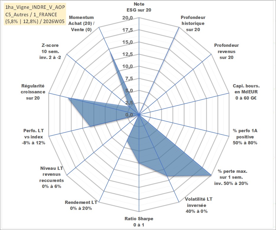 Site dédié aux investisseursPage dédiée sur site financeAnalyse des valorisations hebdomadaires de l'actif 1ha_Vigne_INDRE_V_AOP. Cet actif est cote en EUR. Les valorisations couvrent les semaines 1997W01 a 2026W05. Les fermages de ce bien foncier sont pris egaux a 2,5% annuels de la valeur venale du bien.