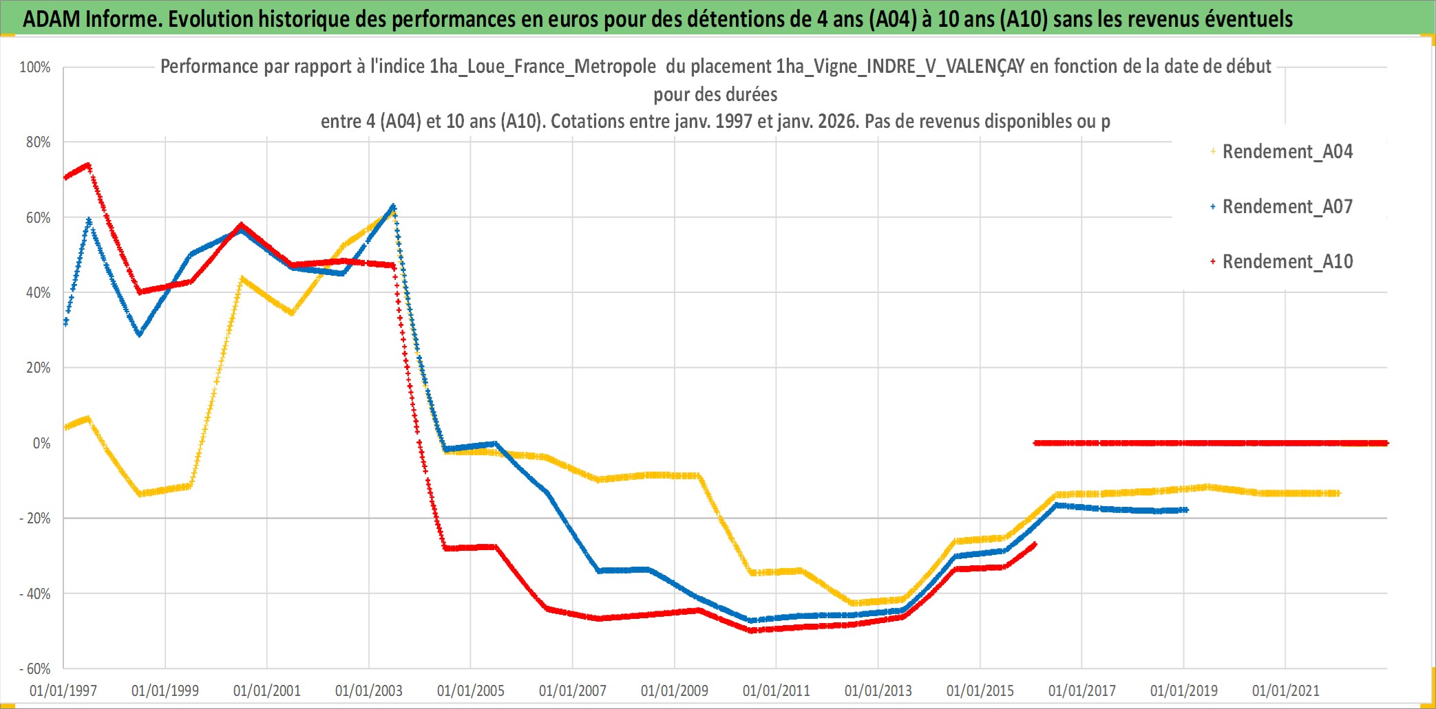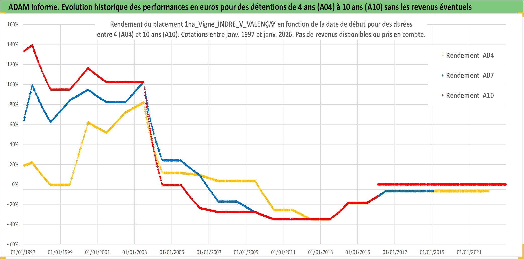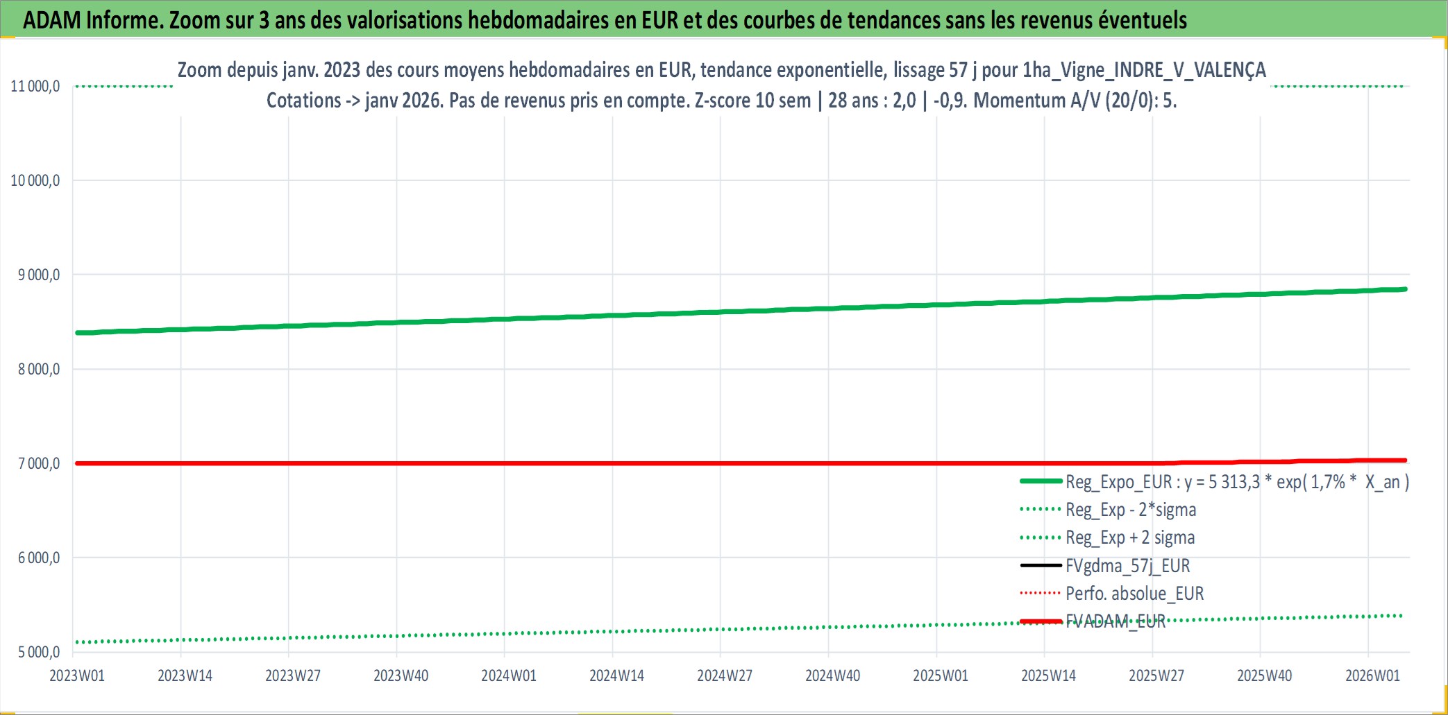 Site dédié aux investisseursPage dédiée sur site financeAnalyse des valorisations hebdomadaires de l'actif 1ha_Vigne_INDRE_V_VALENÇAY. Cet actif est cote en EUR. Les valorisations couvrent les semaines 1997W01 a 2026W05. Les fermages de ce bien foncier sont pris egaux a 2,5% annuels de la valeur venale du bien.