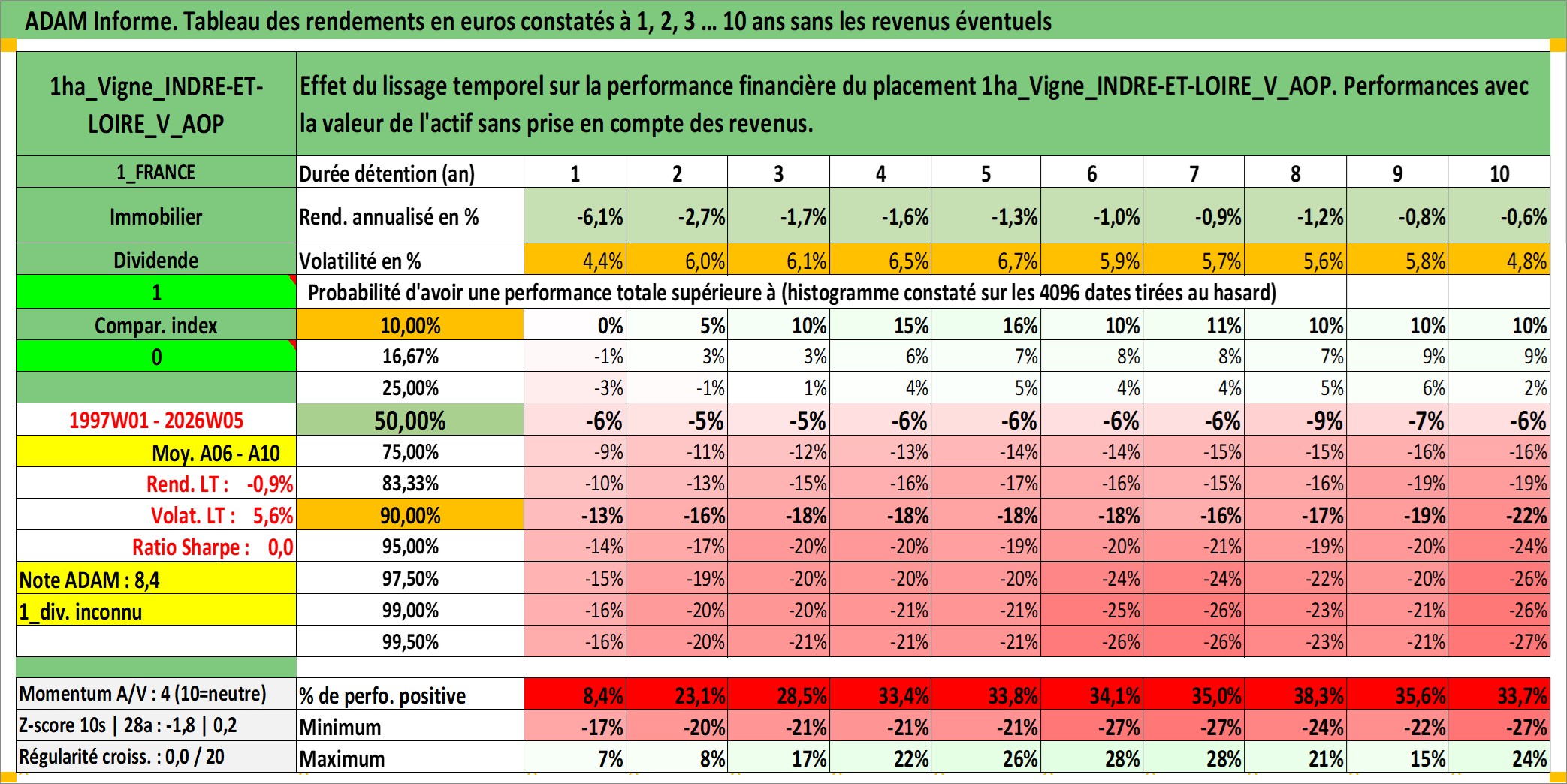 Site dédié aux investisseursPage dédiée sur site financeAnalyse des valorisations hebdomadaires de l'actif 1ha_Vigne_INDRE-ET-LOIRE_V_AOP. Cet actif est cote en EUR. Les valorisations couvrent les semaines 1997W01 a 2026W05. Les fermages de ce bien foncier sont pris egaux a 2,5% annuels de la valeur venale du bien.