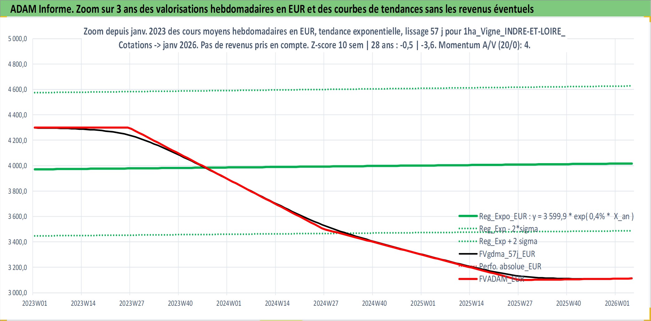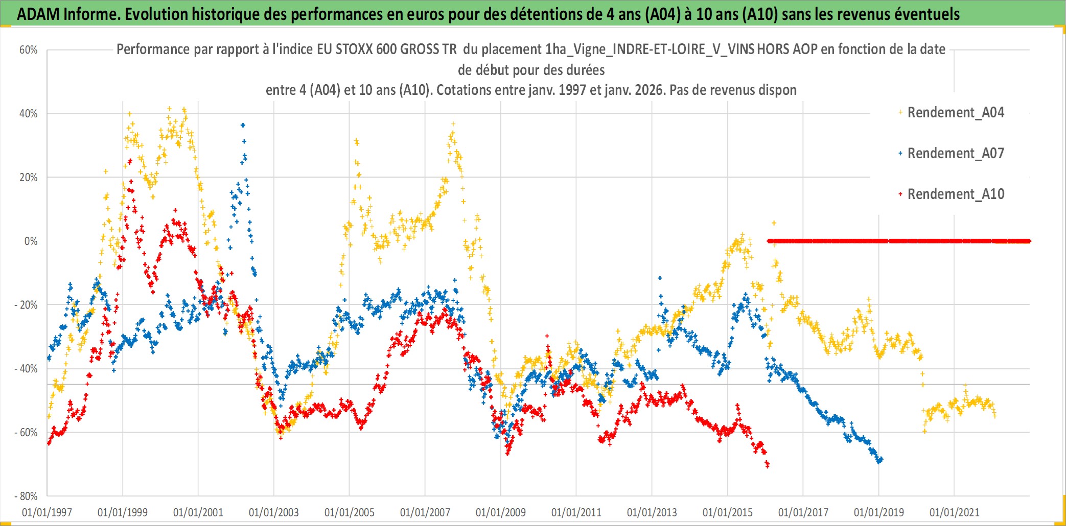 Site dédié aux investisseursPage dédiée sur site financeAnalyse des valorisations hebdomadaires de l'actif 1ha_Vigne_INDRE-ET-LOIRE_V_VINS HORS AOP. Cet actif est cote en EUR. Les valorisations couvrent les semaines 1997W01 a 2026W05. Les fermages de ce bien foncier sont pris egaux a 2,5% annuels de la valeur venale du bien.