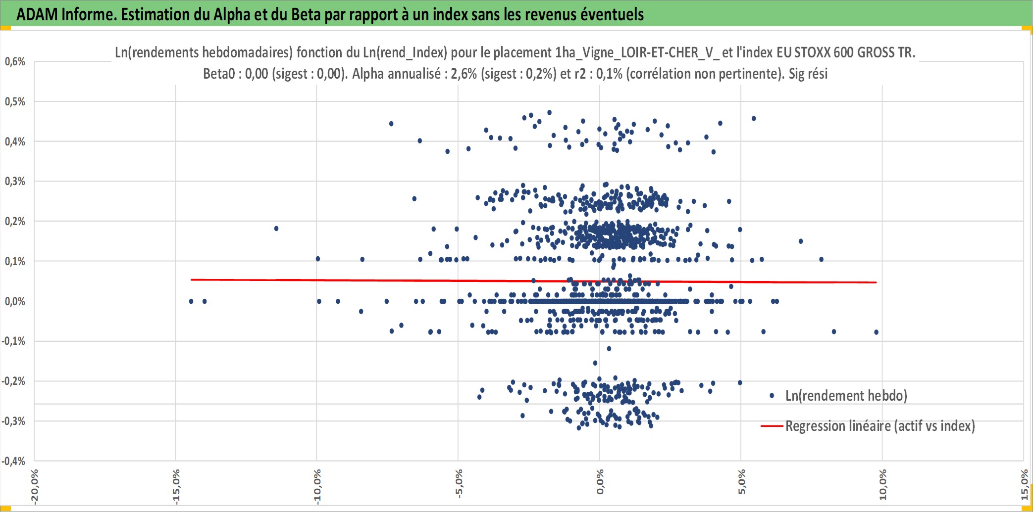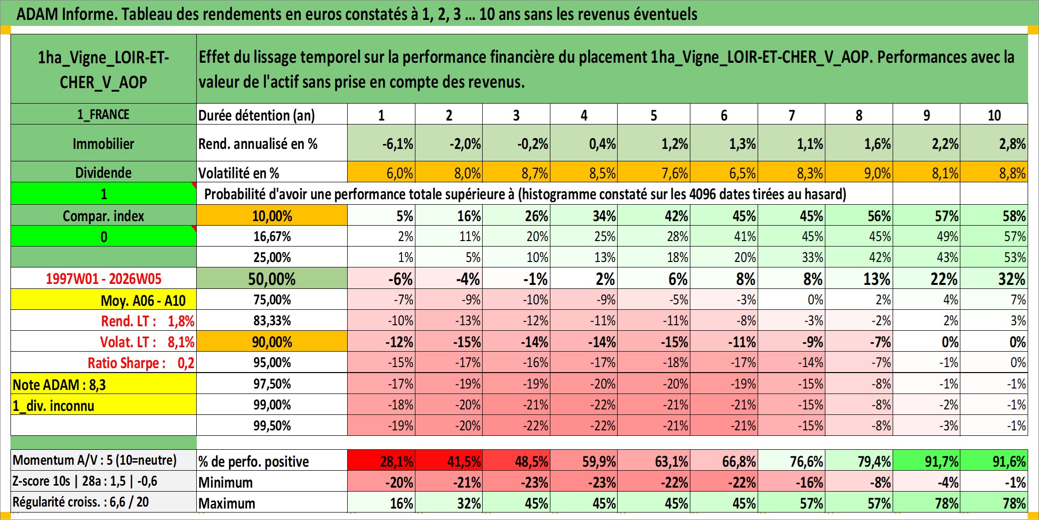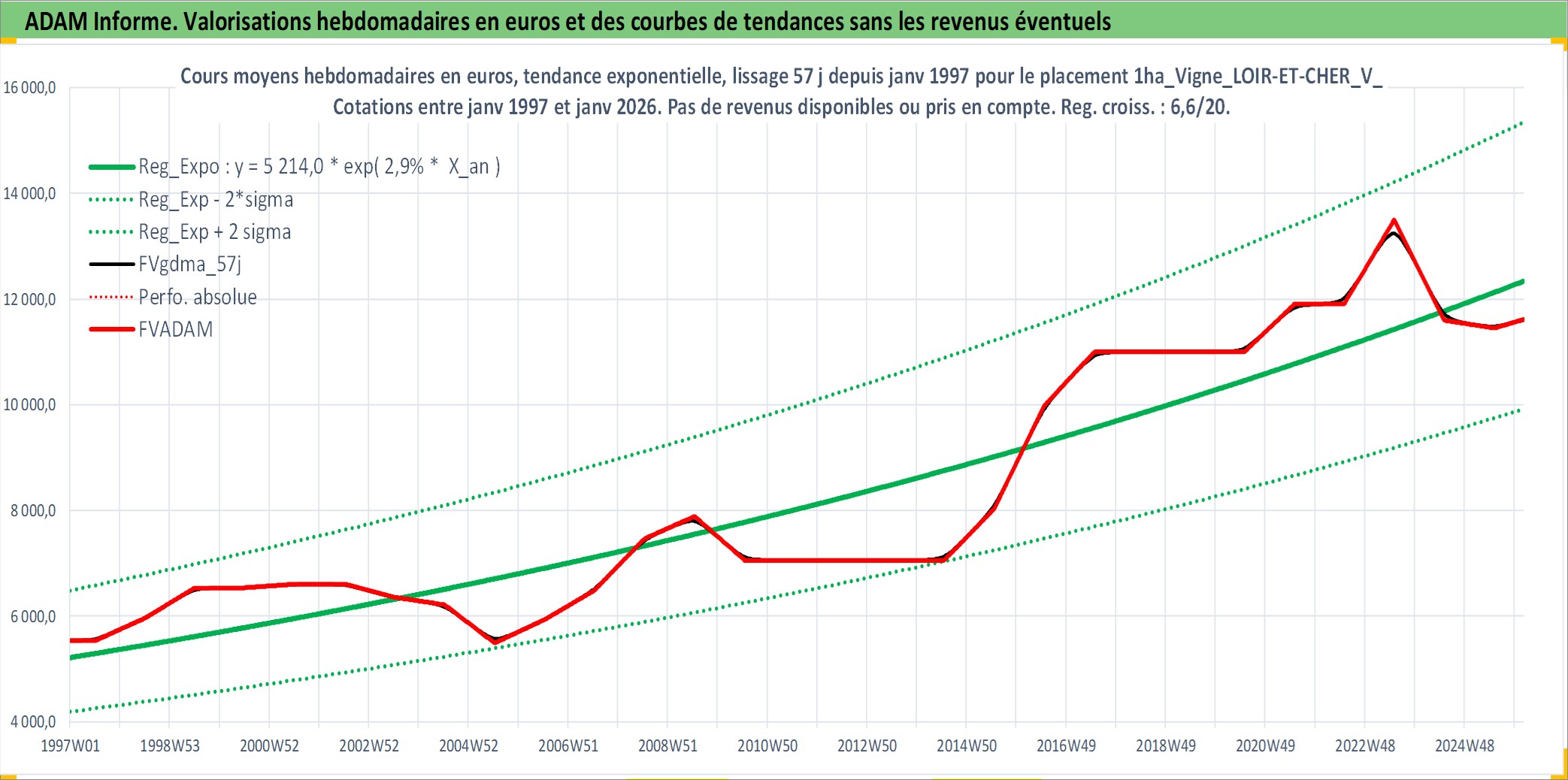 Site dédié aux investisseursPage dédiée sur site financeAnalyse des valorisations hebdomadaires de l'actif 1ha_Vigne_LOIR-ET-CHER_V_AOP. Cet actif est cote en EUR. Les valorisations couvrent les semaines 1997W01 a 2026W05. Les fermages de ce bien foncier sont pris egaux a 2,5% annuels de la valeur venale du bien.