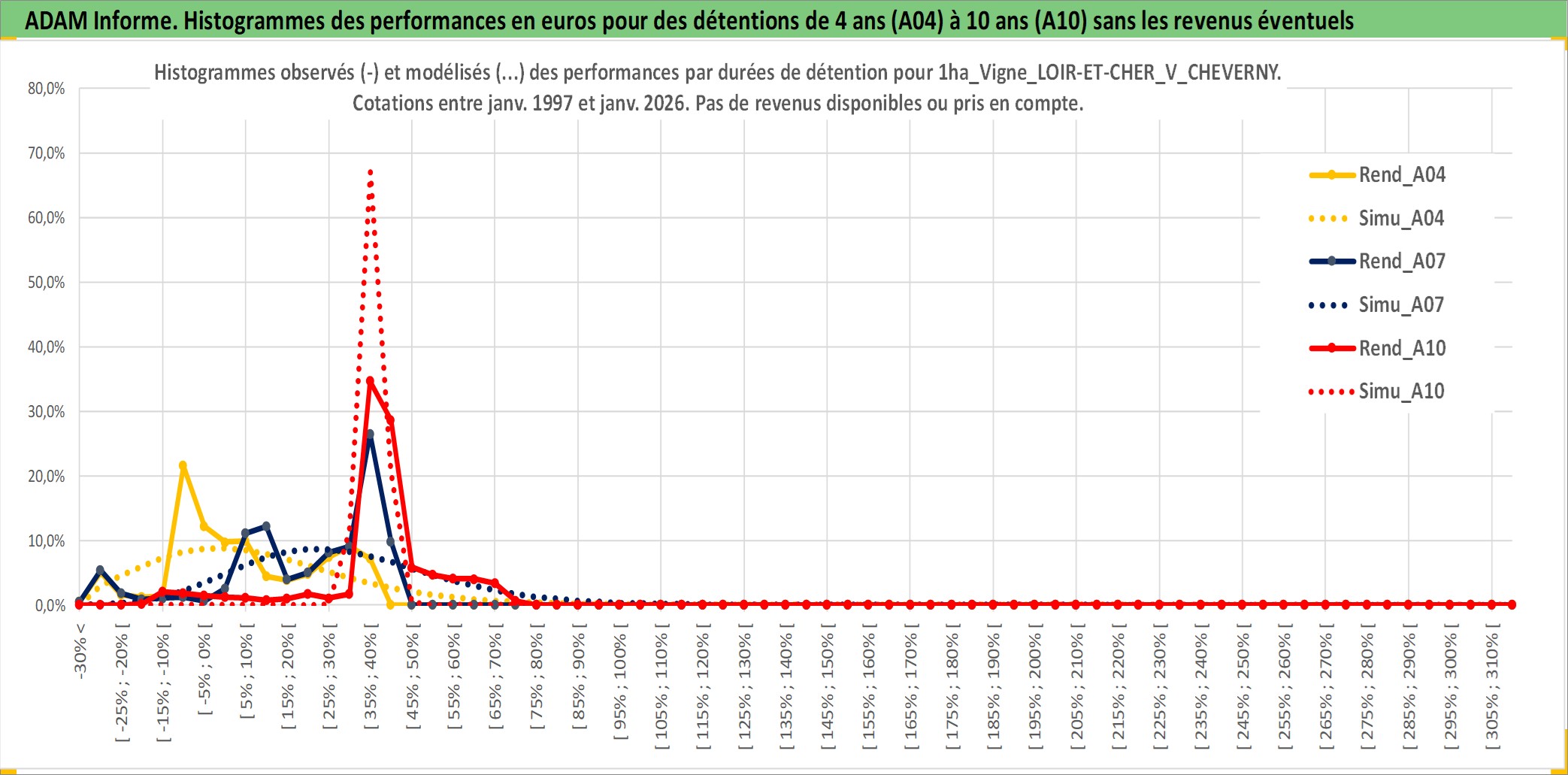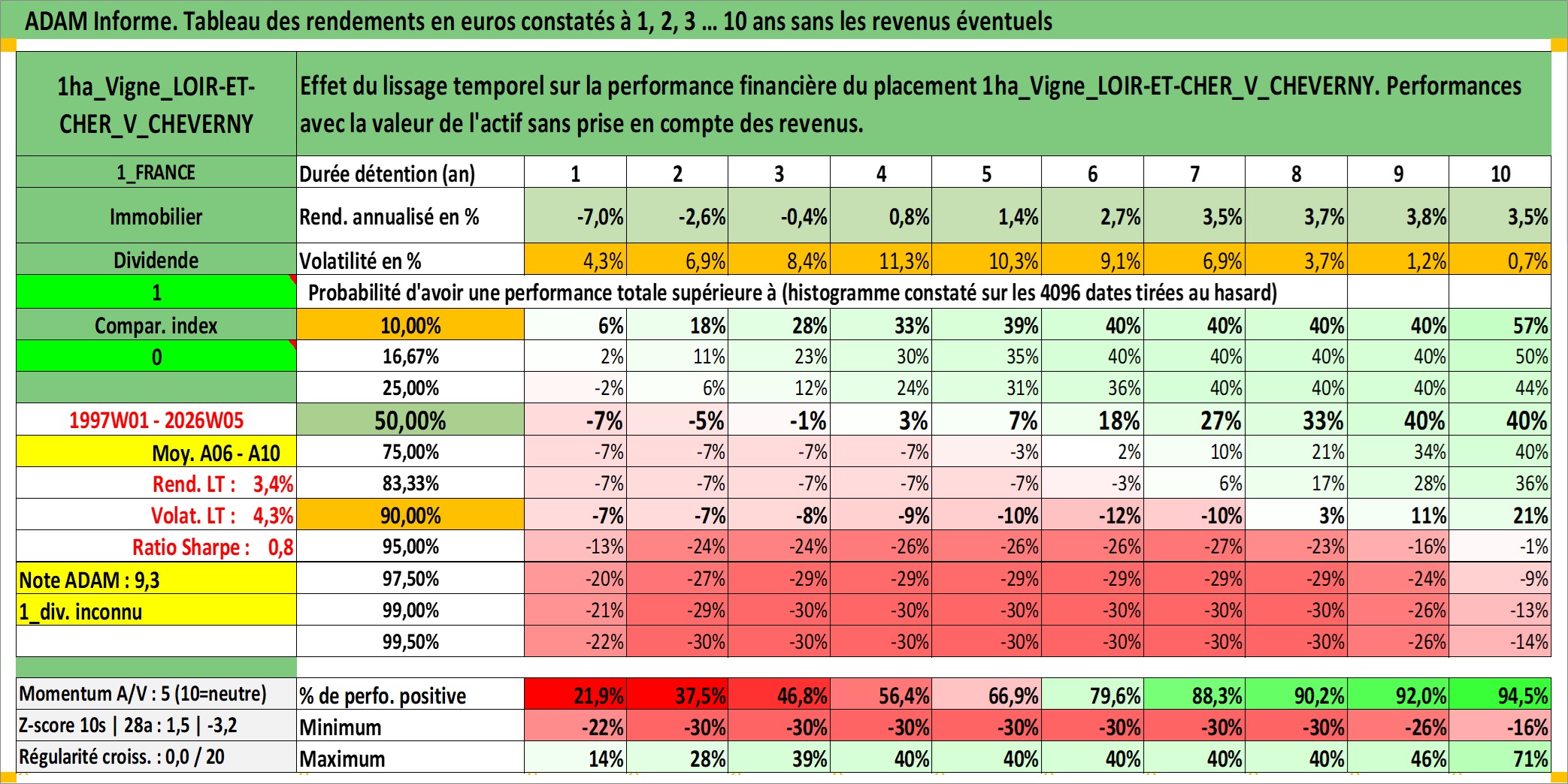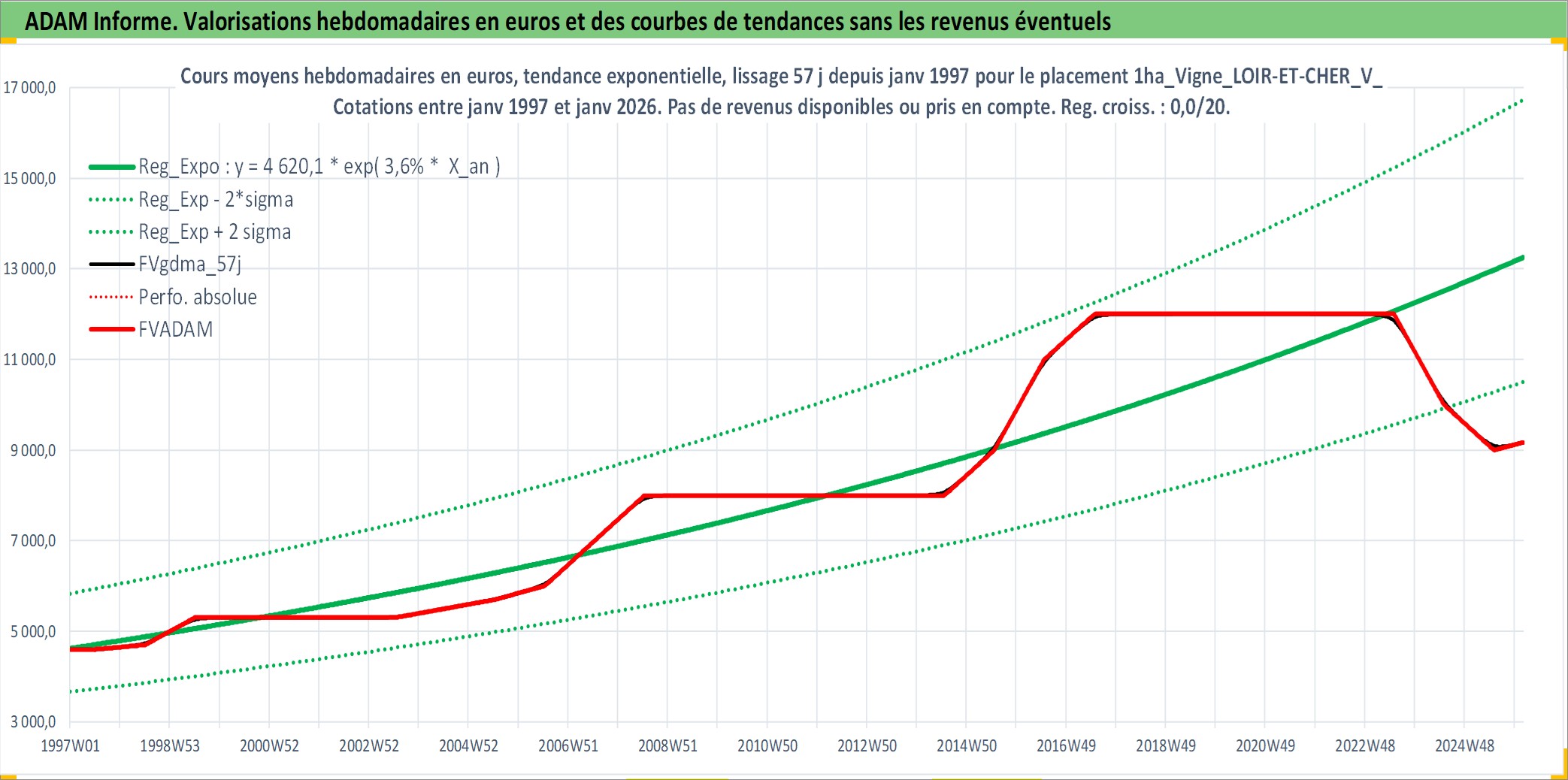 Site dédié aux investisseursPage dédiée sur site financeAnalyse des valorisations hebdomadaires de l'actif 1ha_Vigne_LOIR-ET-CHER_V_CHEVERNY. Cet actif est cote en EUR. Les valorisations couvrent les semaines 1997W01 a 2026W05. Les fermages de ce bien foncier sont pris egaux a 2,5% annuels de la valeur venale du bien.