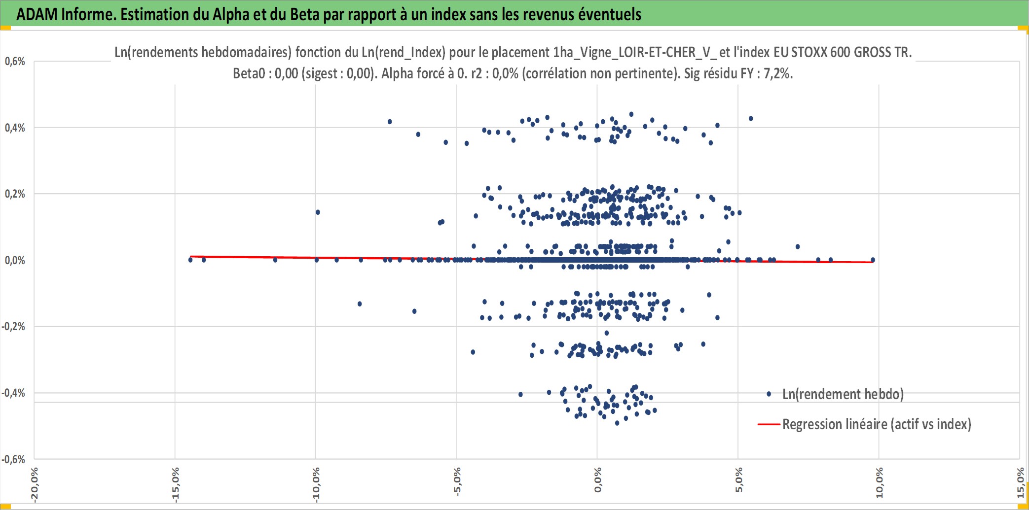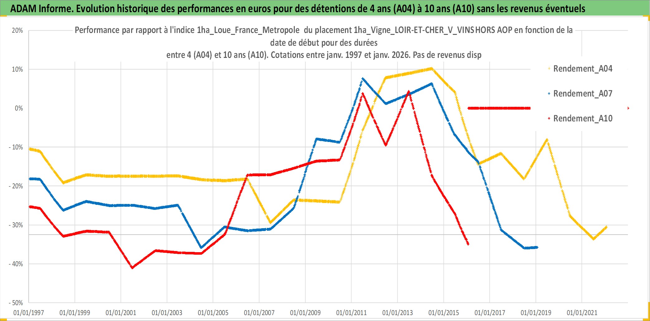 Site dédié aux investisseursPage dédiée sur site financeAnalyse des valorisations hebdomadaires de l'actif 1ha_Vigne_LOIR-ET-CHER_V_VINS HORS AOP. Cet actif est cote en EUR. Les valorisations couvrent les semaines 1997W01 a 2026W05. Les fermages de ce bien foncier sont pris egaux a 2,5% annuels de la valeur venale du bien.