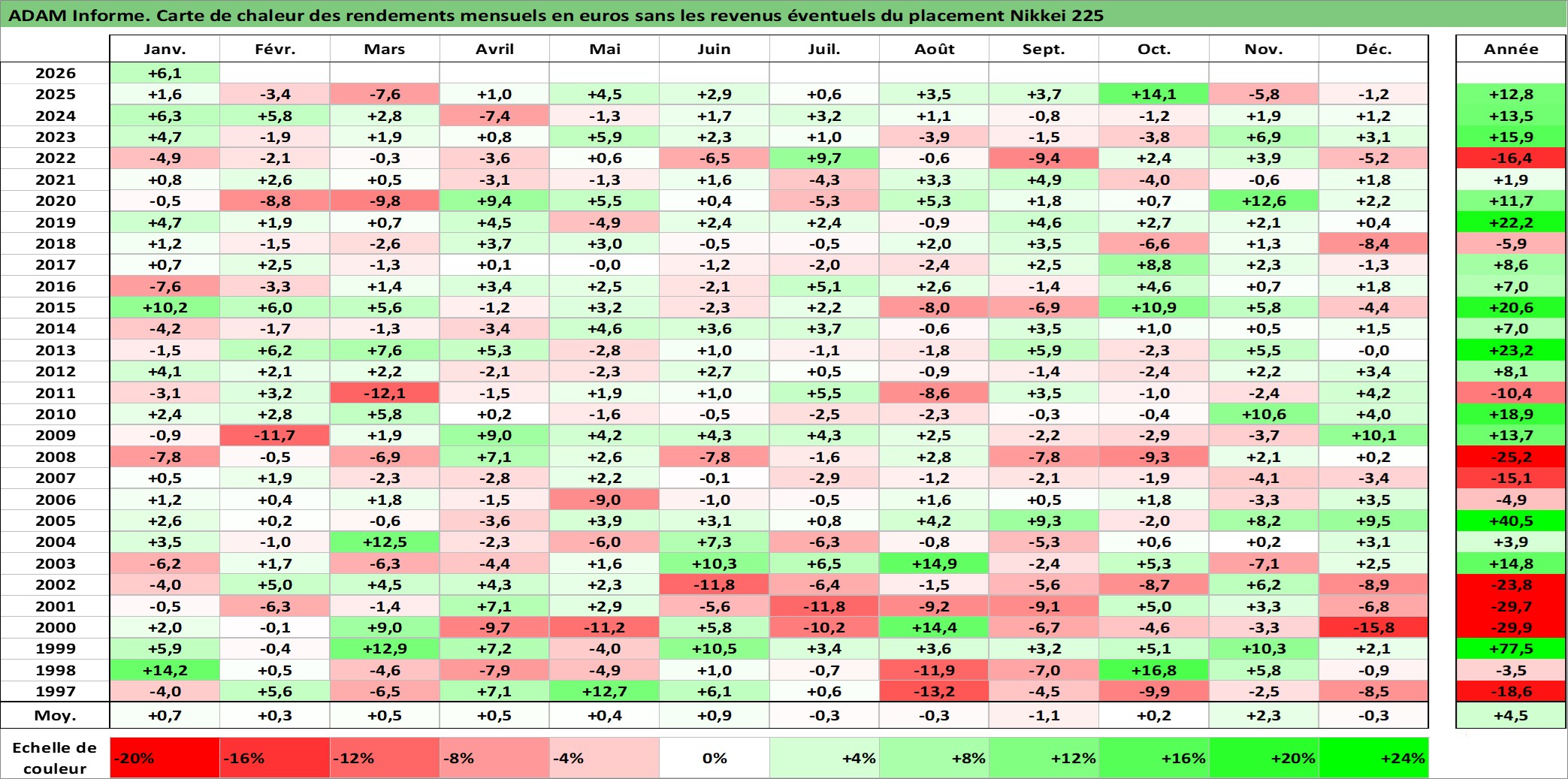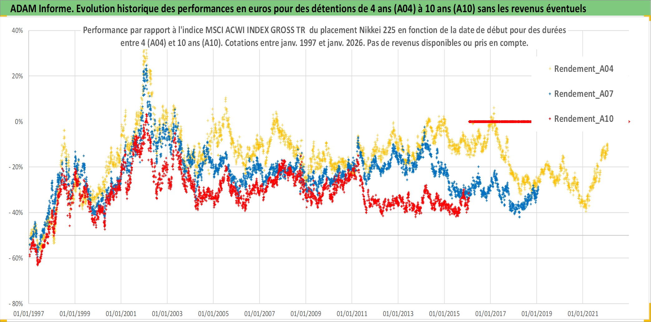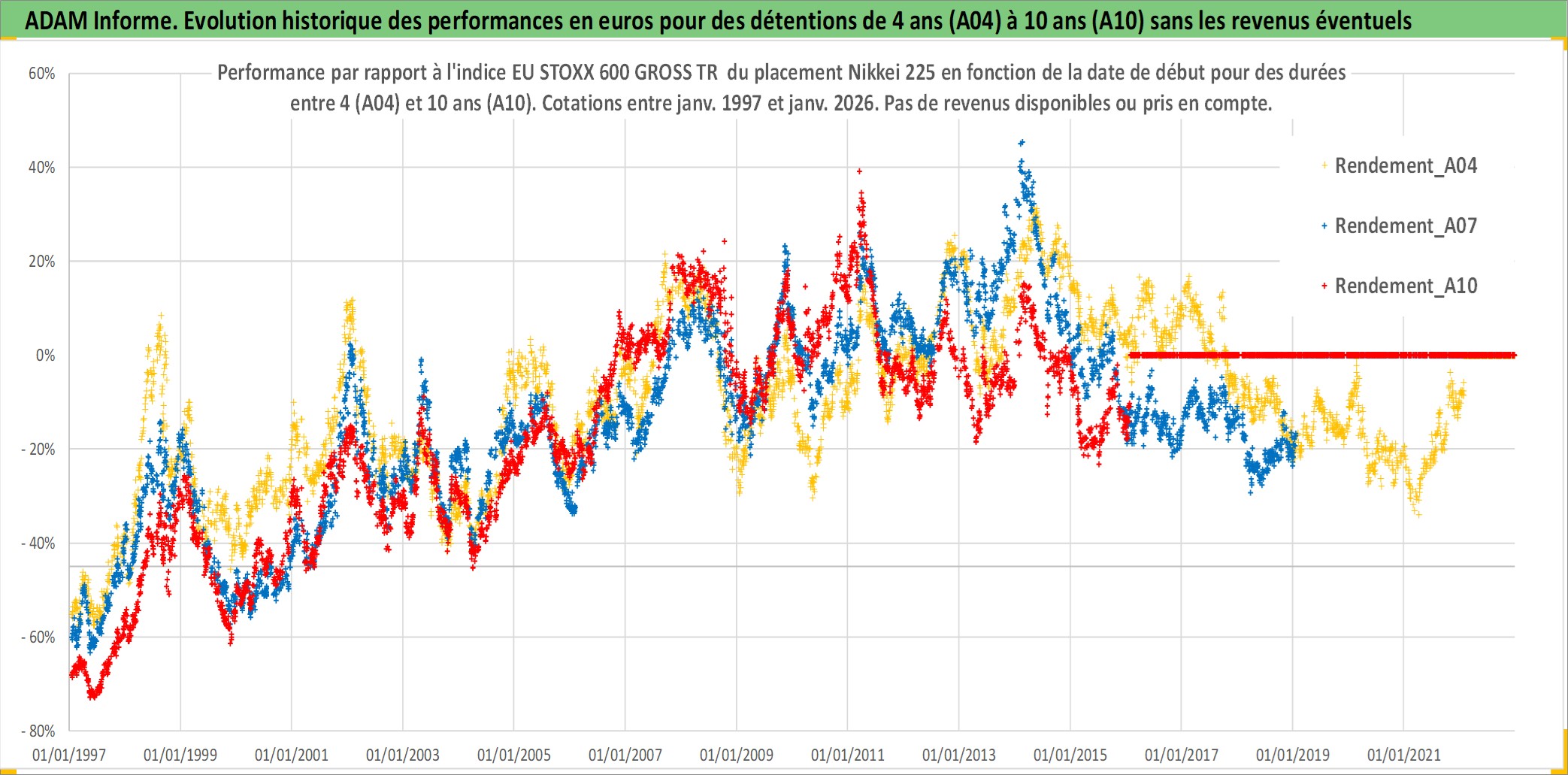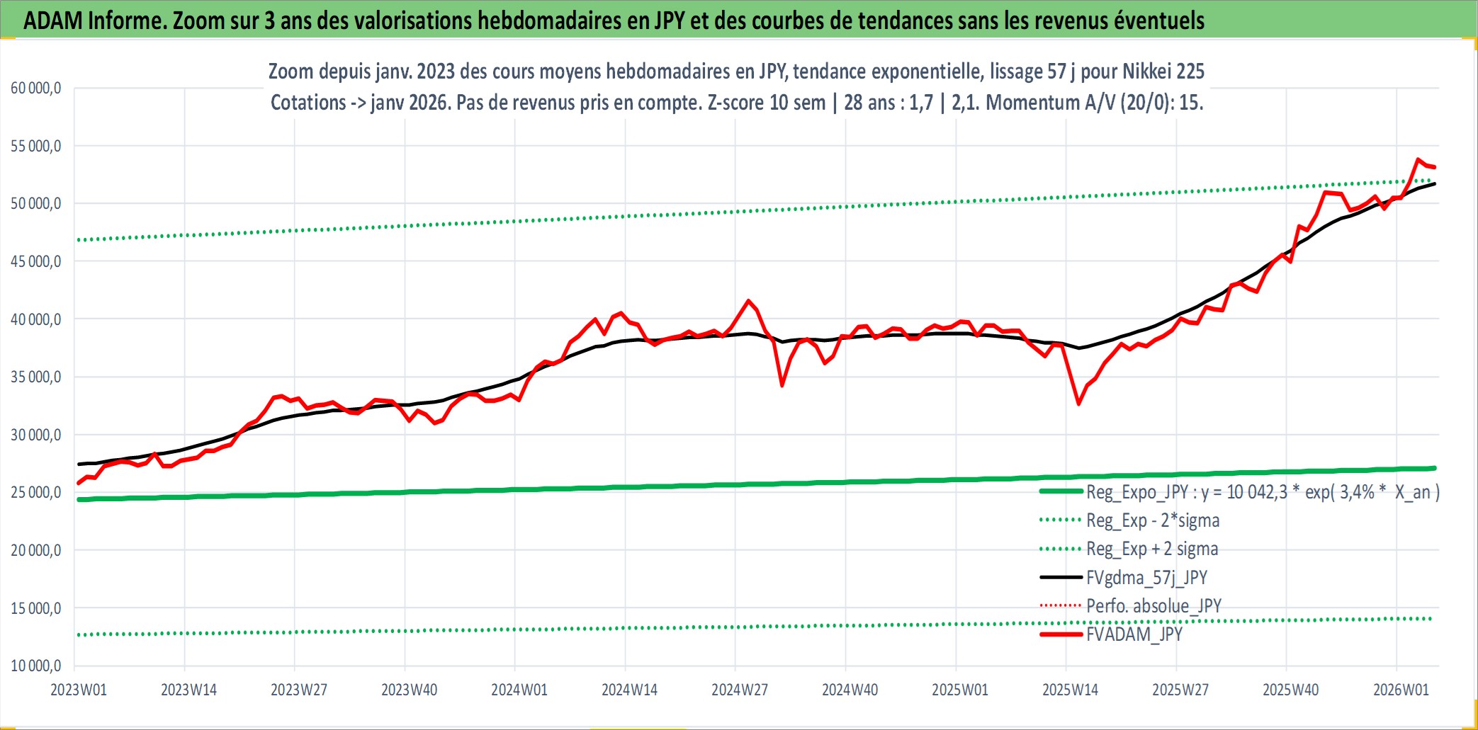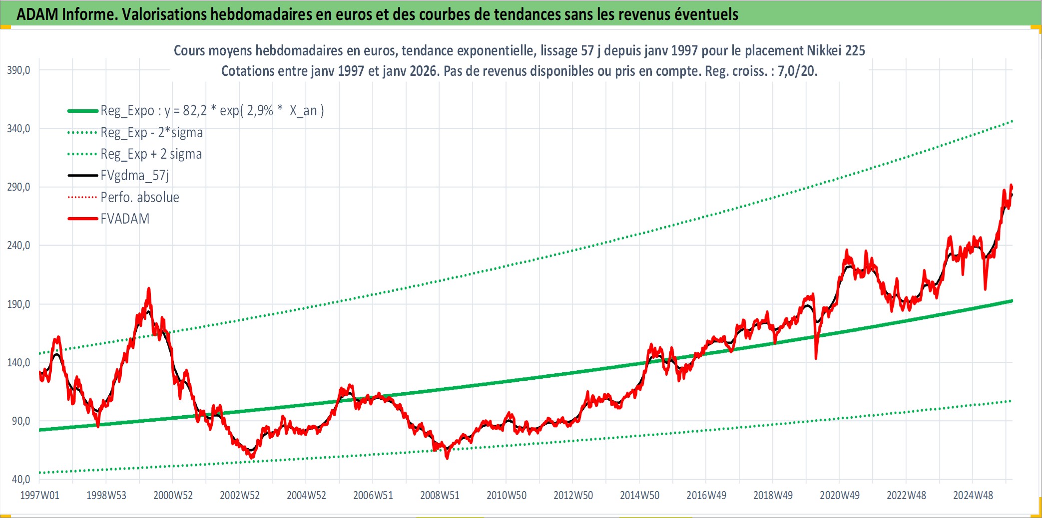 Site dédié aux investisseursPage dédiée sur site financeAnalyse des valorisations hebdomadaires de l'actif Nikkei 225. Cet actif est cote en JPY. Les valorisations sont en contrevaleur EURO et couvrent les semaines 1997W01 a 2026W05. Les revenus de cet actif financier ne sont pas connus car non existants ou non disponibles sur le site Yahoo Finance. La note ESG de cet actif n'est pas connue.