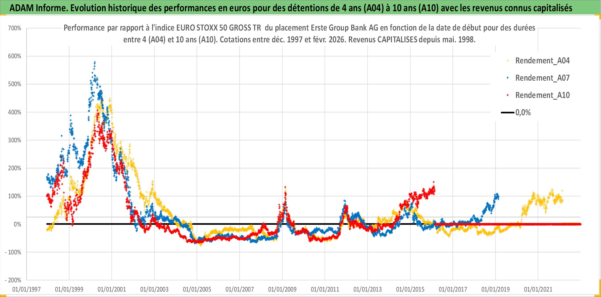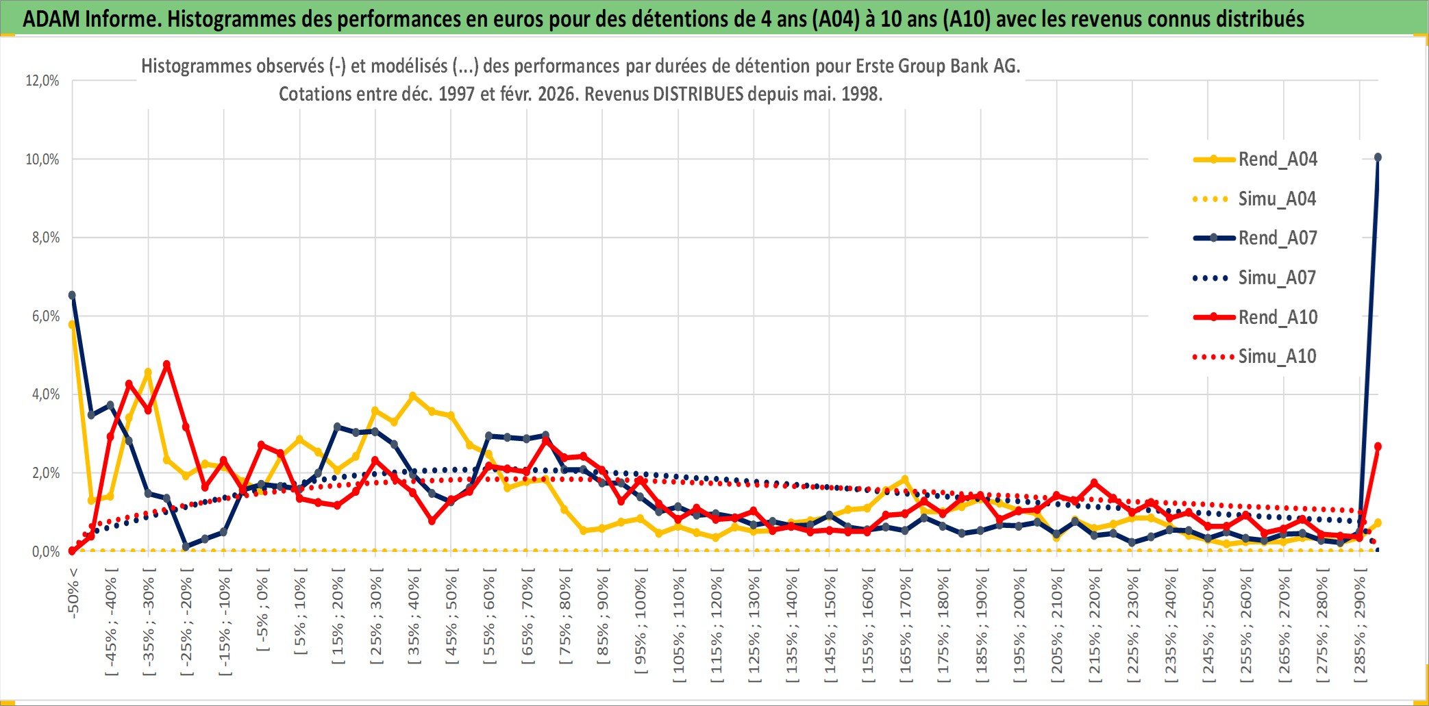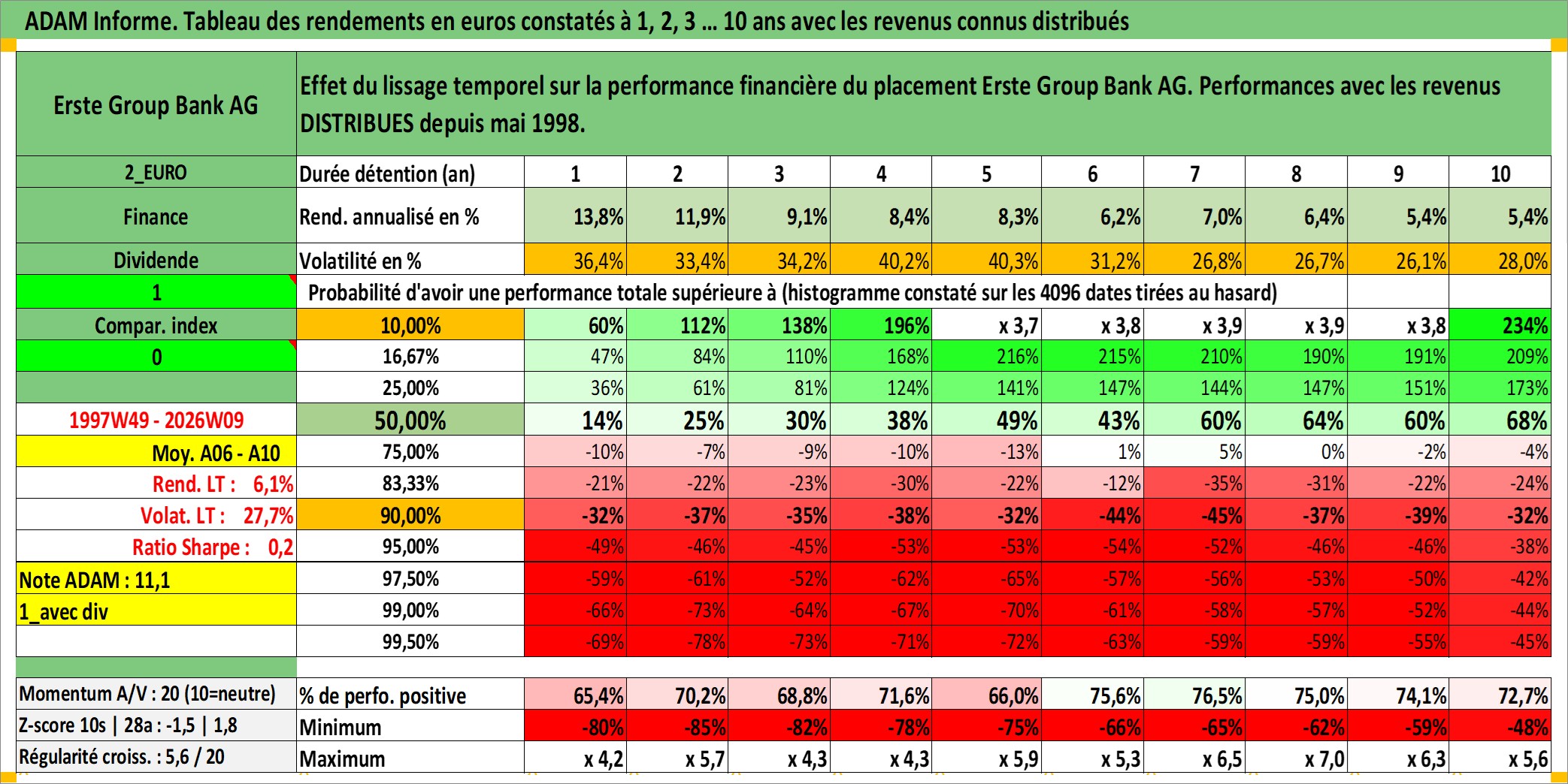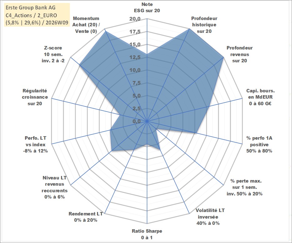 Site dédié aux investisseursPage dédiée sur site financeAnalyse des valorisations hebdomadaires de l'action Erste Group Bank AG. Cet actif est cote en EUR. Les valorisations couvrent les semaines 1997W49 a 2026W09. Les revenus de cet actif financier sont pris en compte depuis la semaine 1998W22. La note globale ESG de cet actif est estimee a 13.0 (apres rebasage entre 0 et 20).