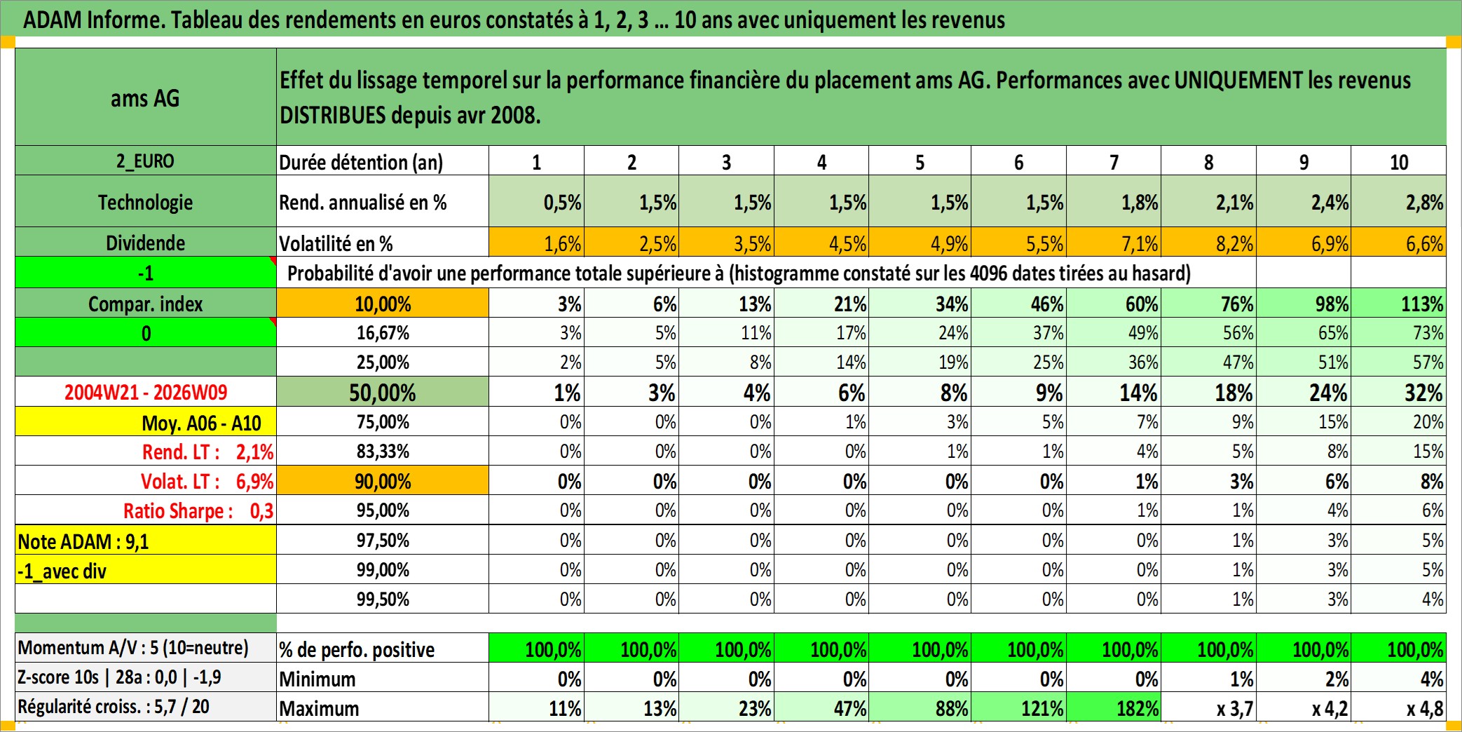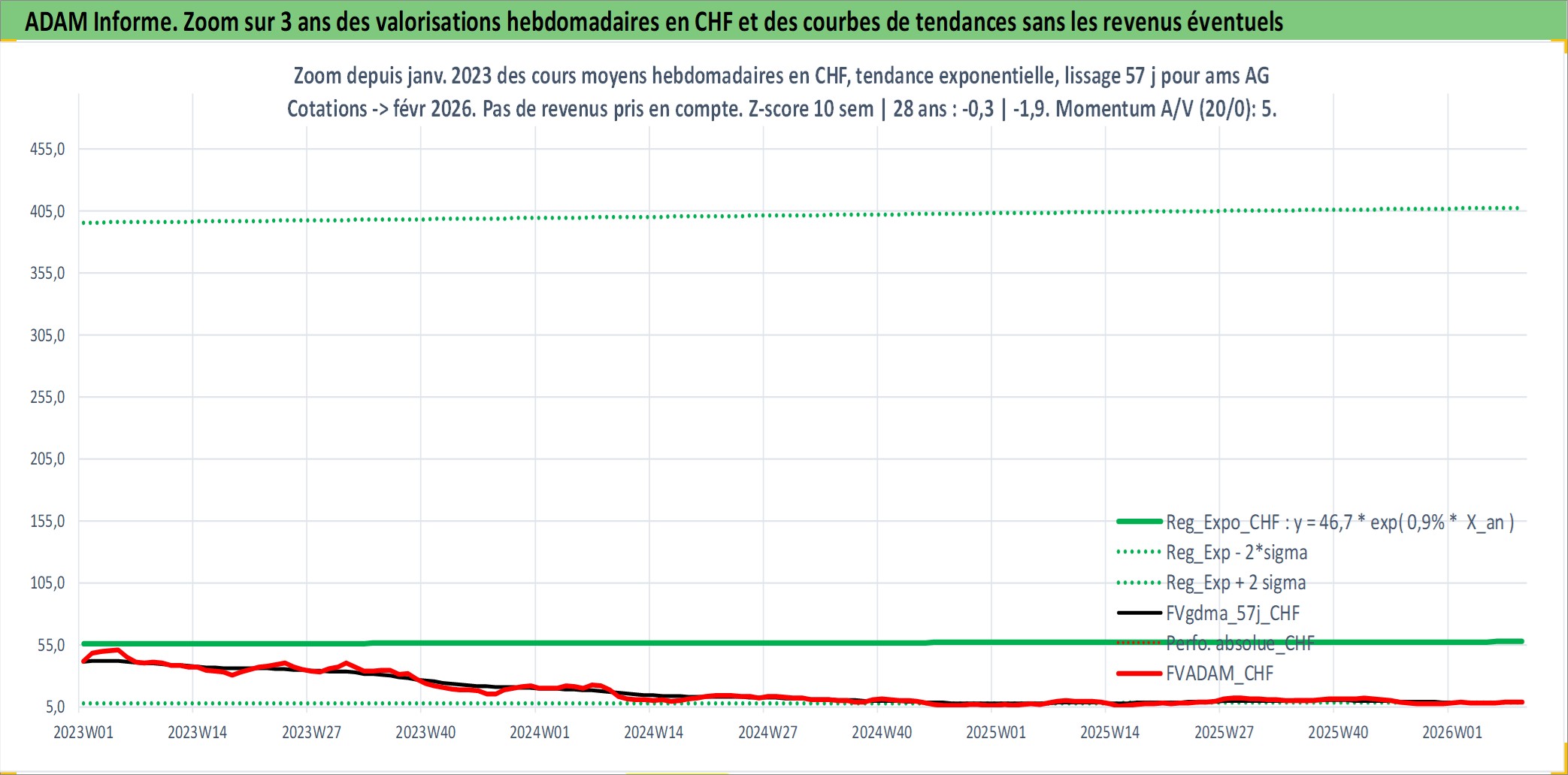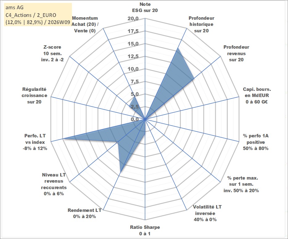 Site dédié aux investisseursPage dédiée sur site financeAnalyse des valorisations hebdomadaires de l'action ams AG. Cet actif est cote en CHF. Les valorisations sont en contrevaleur EURO et couvrent les semaines 2004W21 a 2026W09. Les revenus de cet actif financier sont pris en compte depuis la semaine 2008W14. La note ESG de cet actif n'est pas connue.