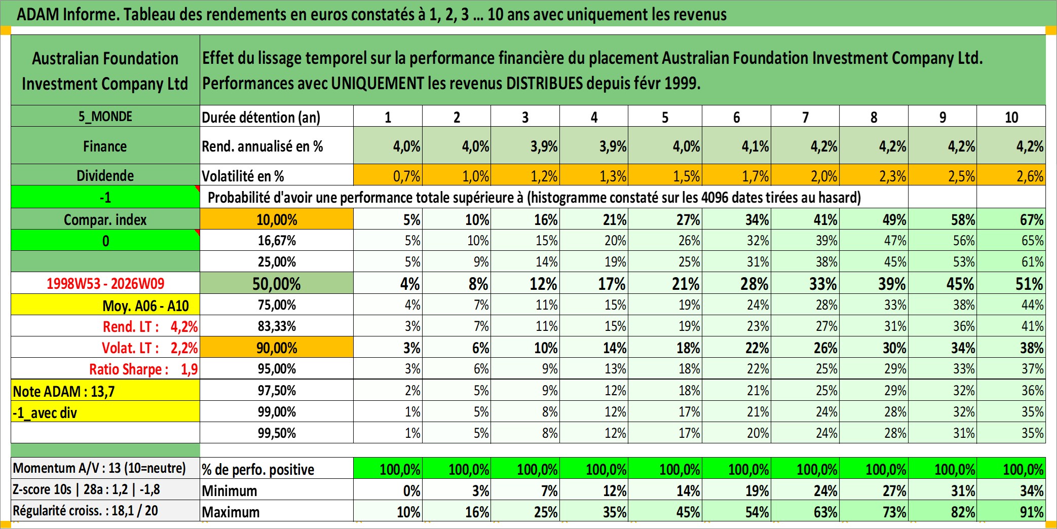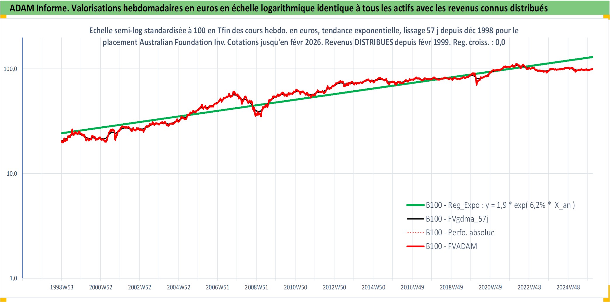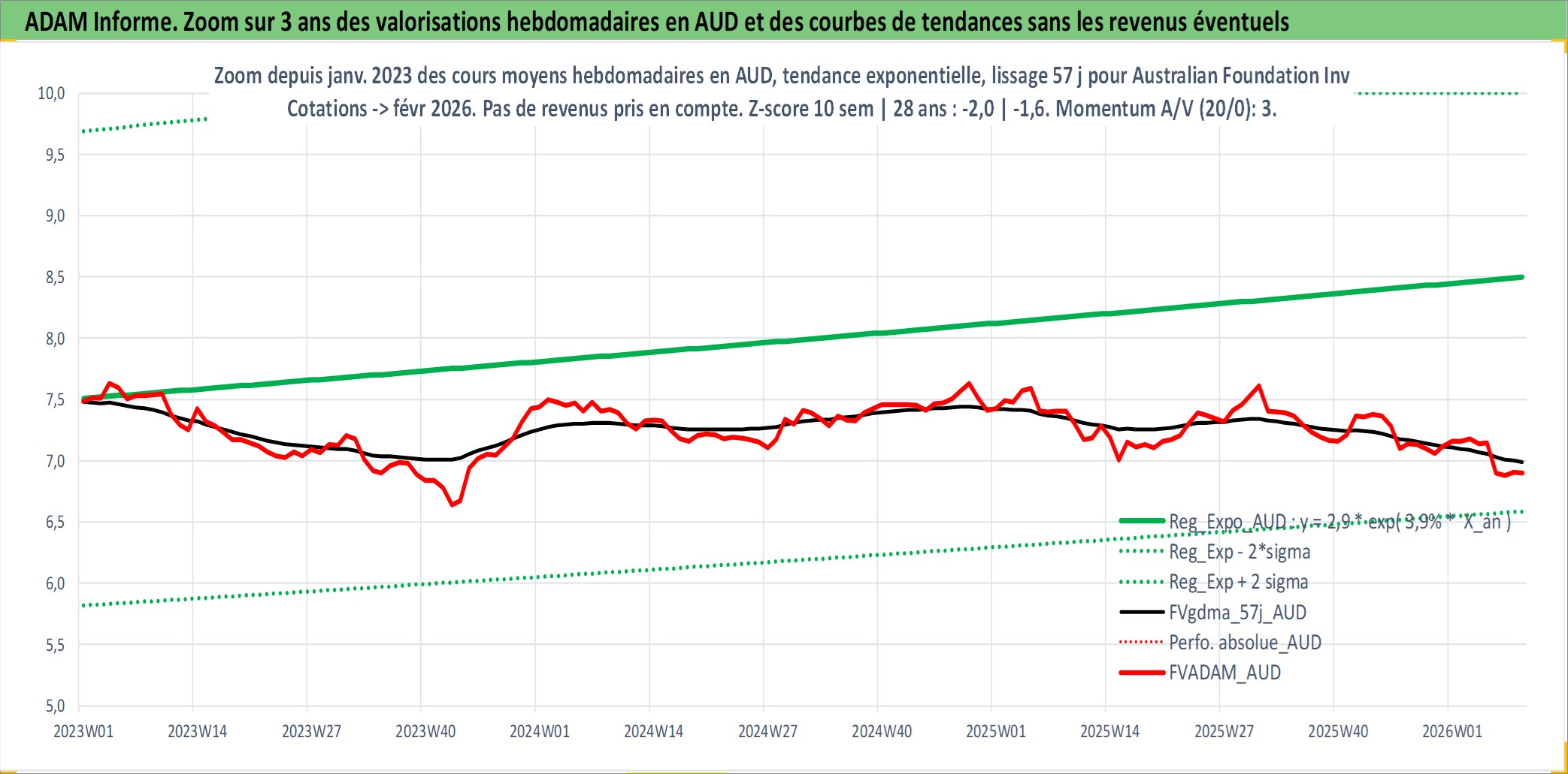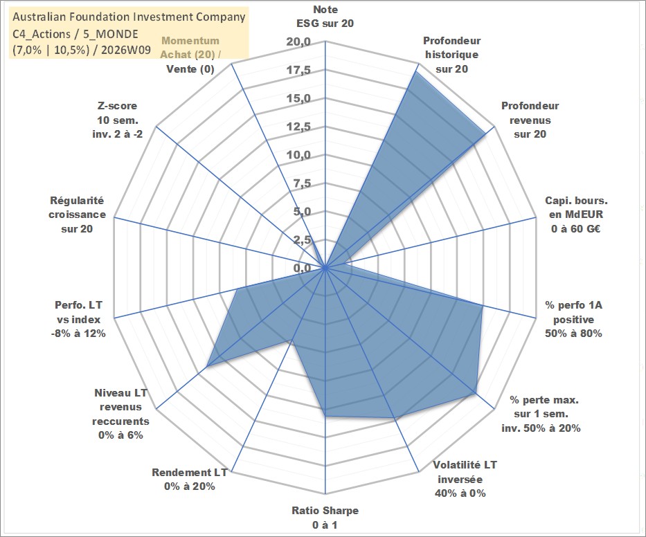 Site dédié aux investisseursPage dédiée sur site financeAnalyse des valorisations hebdomadaires de l'action Australian Foundation Investment Company Ltd. Cet actif est cote en AUD. Les valorisations sont en contrevaleur EURO et couvrent les semaines 1998W53 a 2026W09. Les revenus de cet actif financier sont pris en compte depuis la semaine 1999W07. La note ESG de cet actif n'est pas connue.