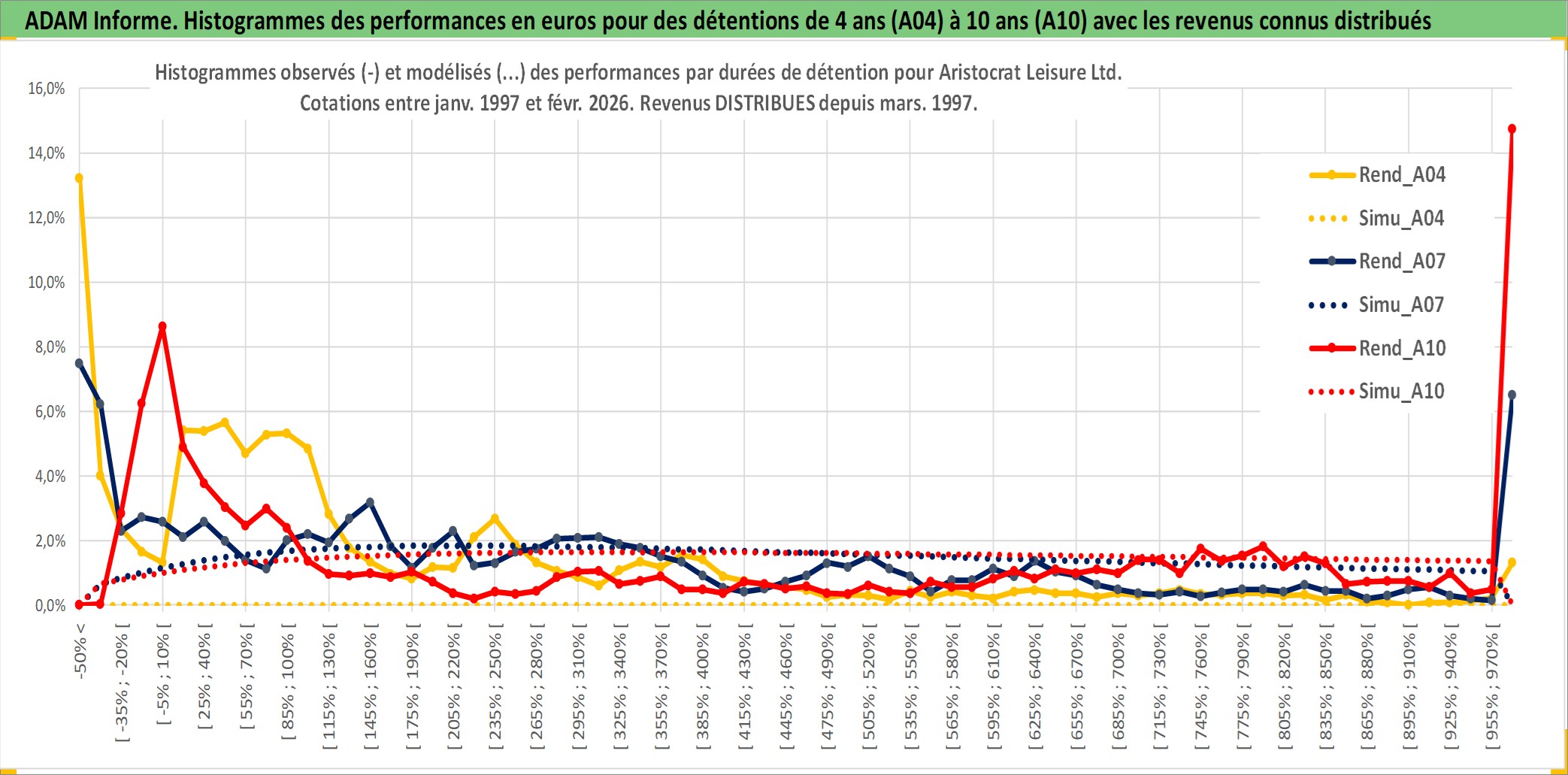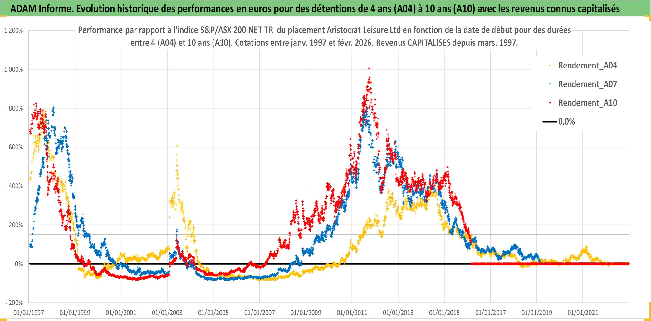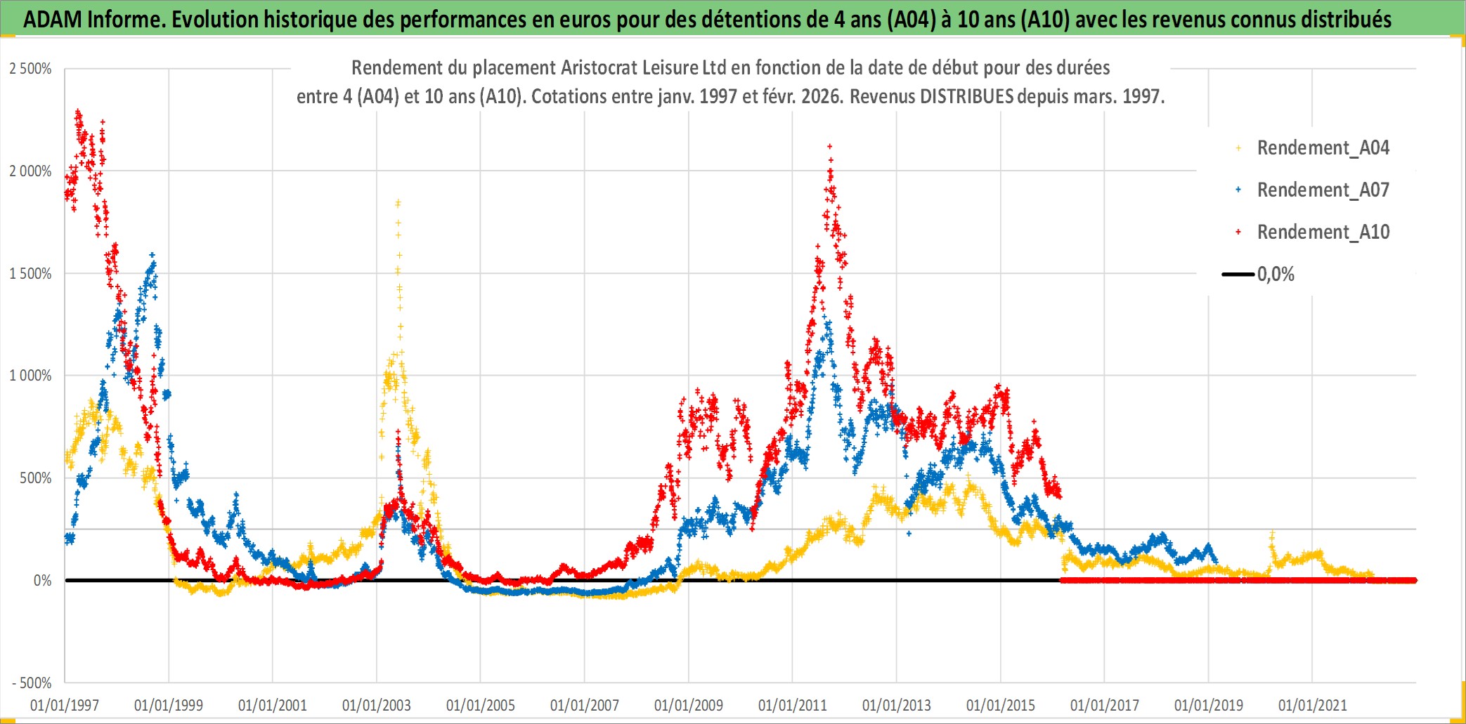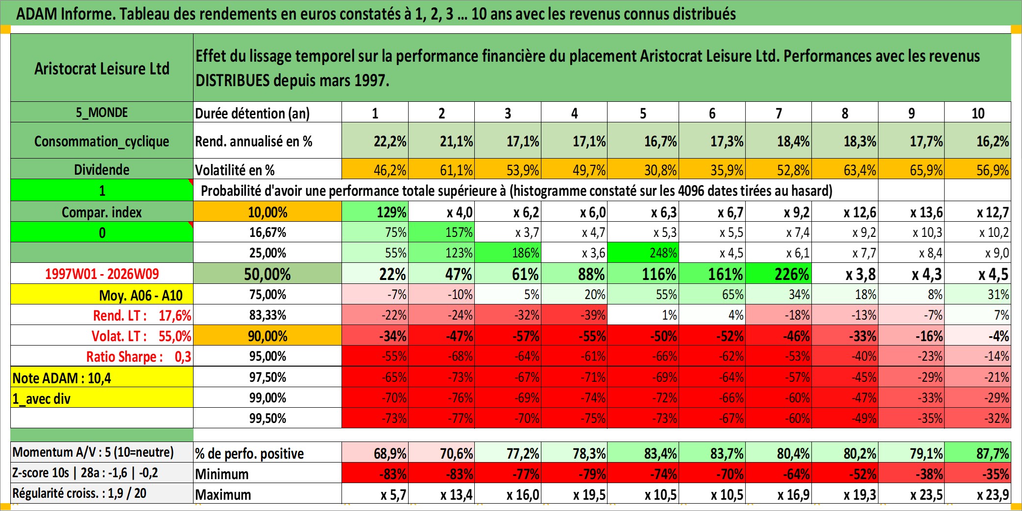 Site dédié aux investisseursPage dédiée sur site financeAnalyse des valorisations hebdomadaires de l'action Aristocrat Leisure Ltd. Cet actif est cote en AUD. Les valorisations sont en contrevaleur EURO et couvrent les semaines 1997W01 a 2026W09. Les revenus de cet actif financier sont pris en compte depuis la semaine 1997W10. La note globale ESG de cet actif est estimee a 9.0 (apres rebasage entre 0 et 20).