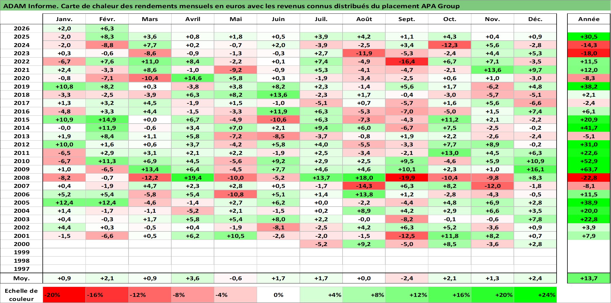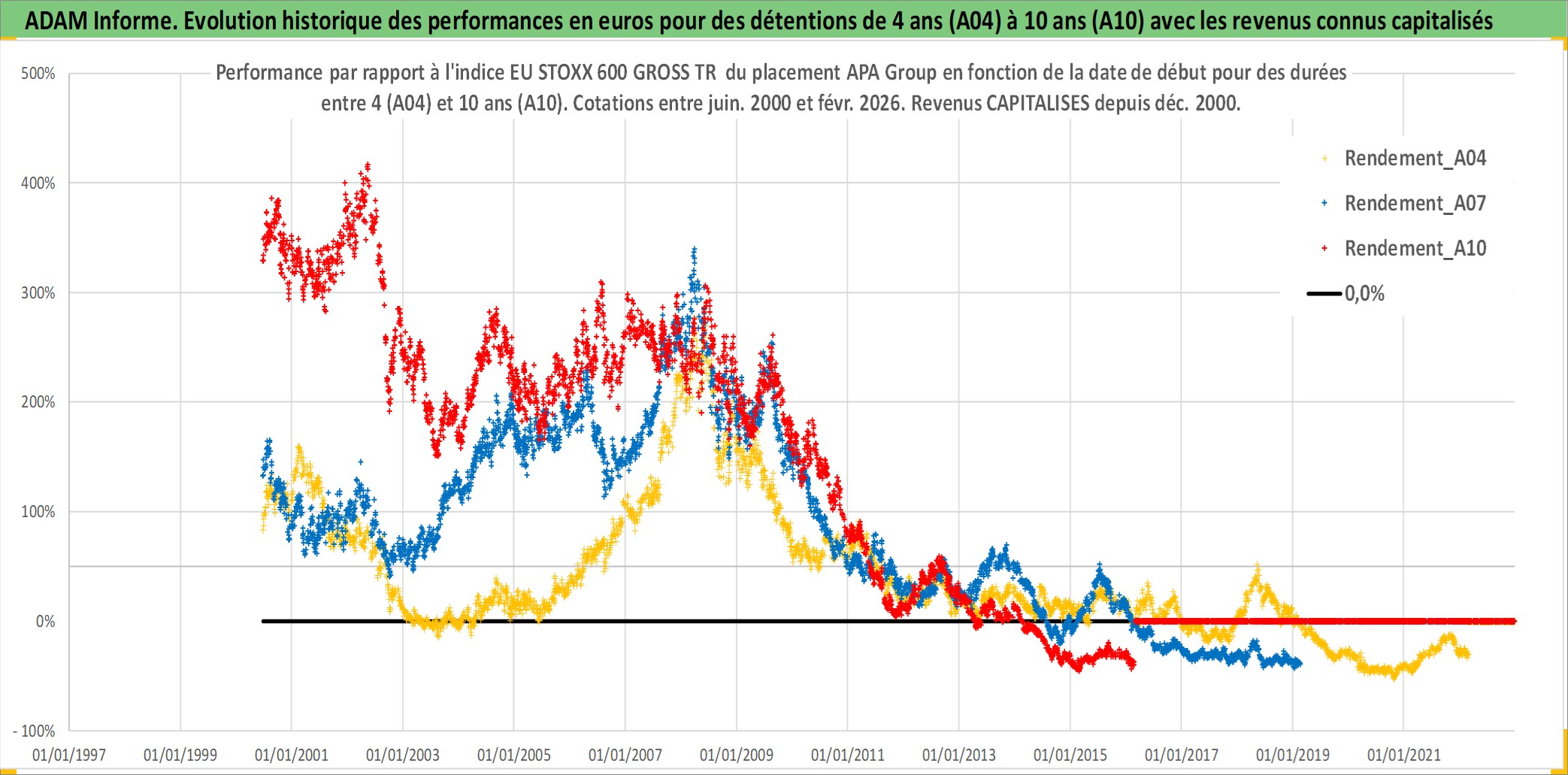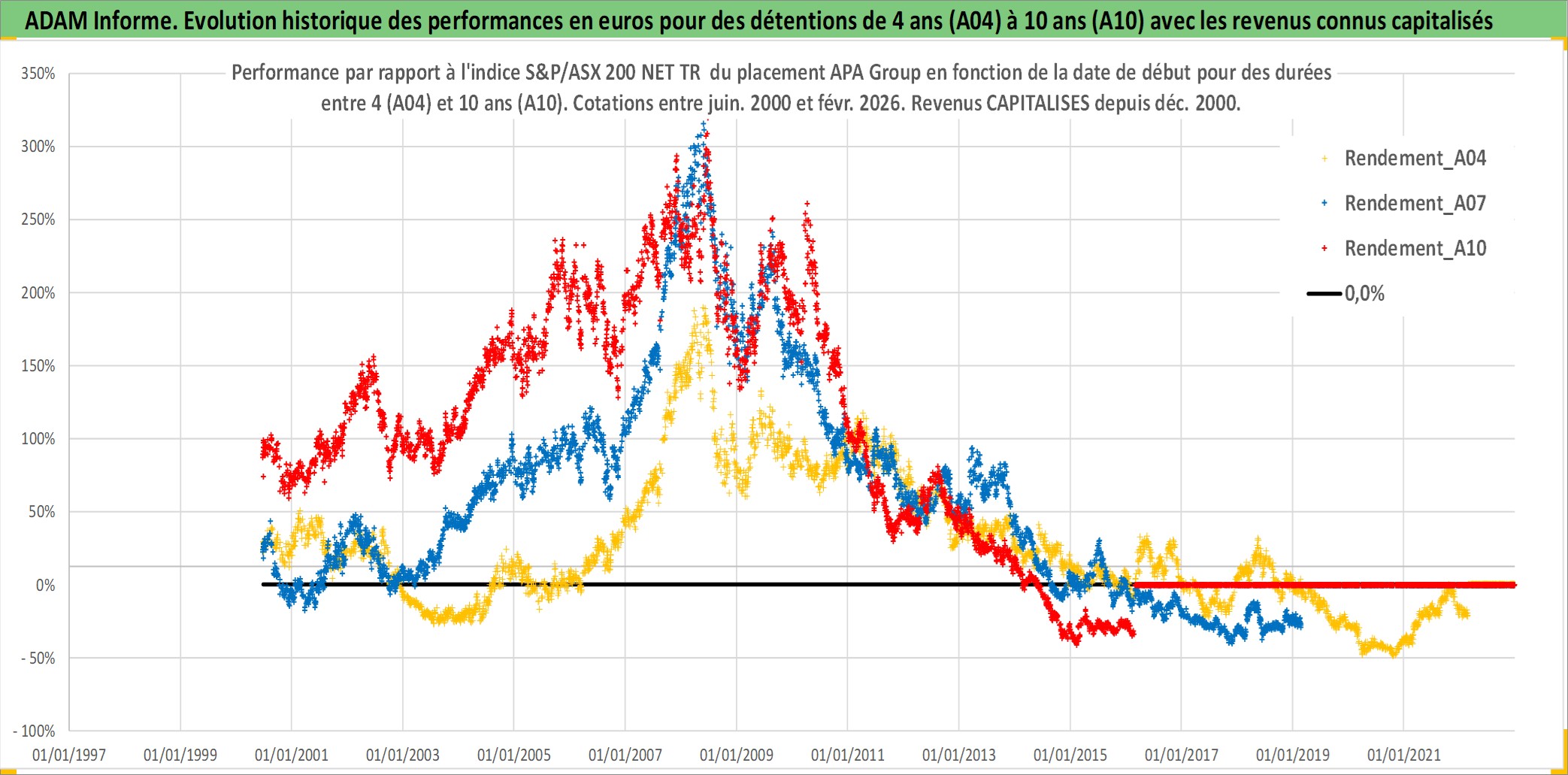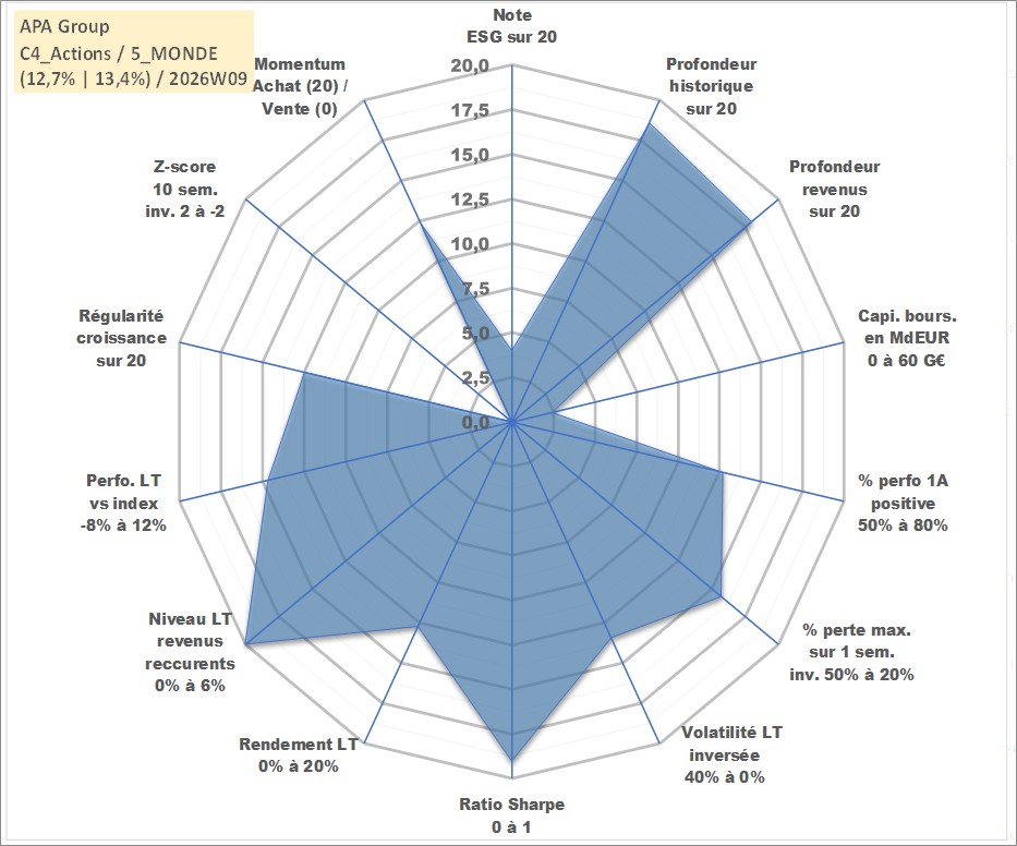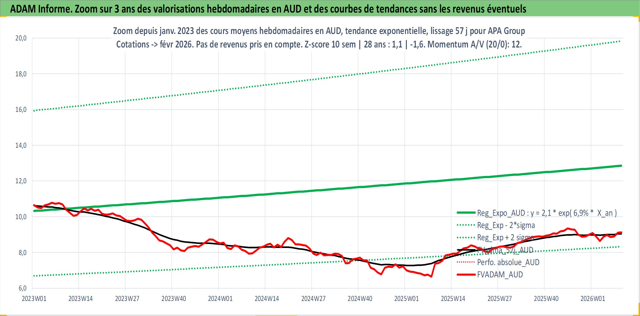 Site dédié aux investisseursPage dédiée sur site financeAnalyse des valorisations hebdomadaires de l'action APA Group. Cet actif est cote en AUD. Les valorisations sont en contrevaleur EURO et couvrent les semaines 2000W24 a 2026W09. Les revenus de cet actif financier sont pris en compte depuis la semaine 2000W48. La note globale ESG de cet actif est estimee a 4.0 (apres rebasage entre 0 et 20).