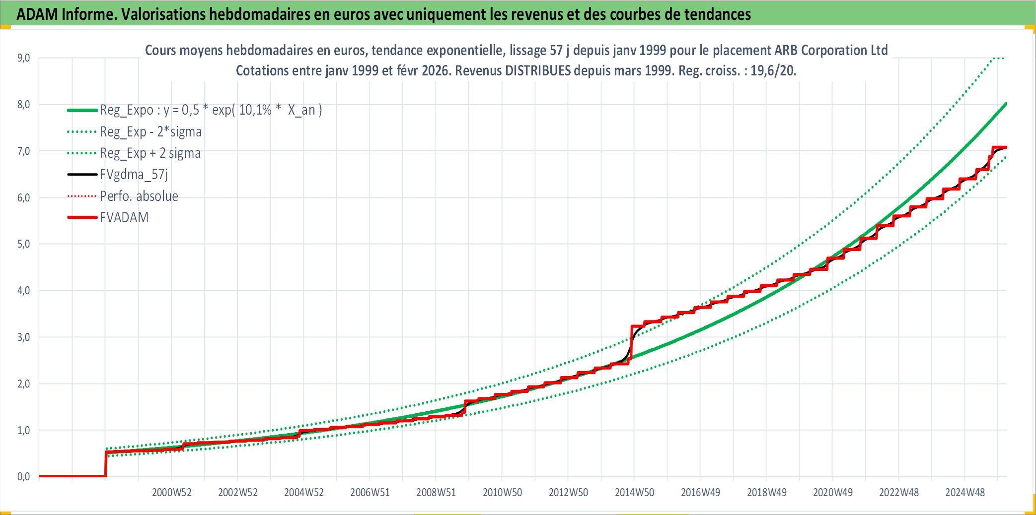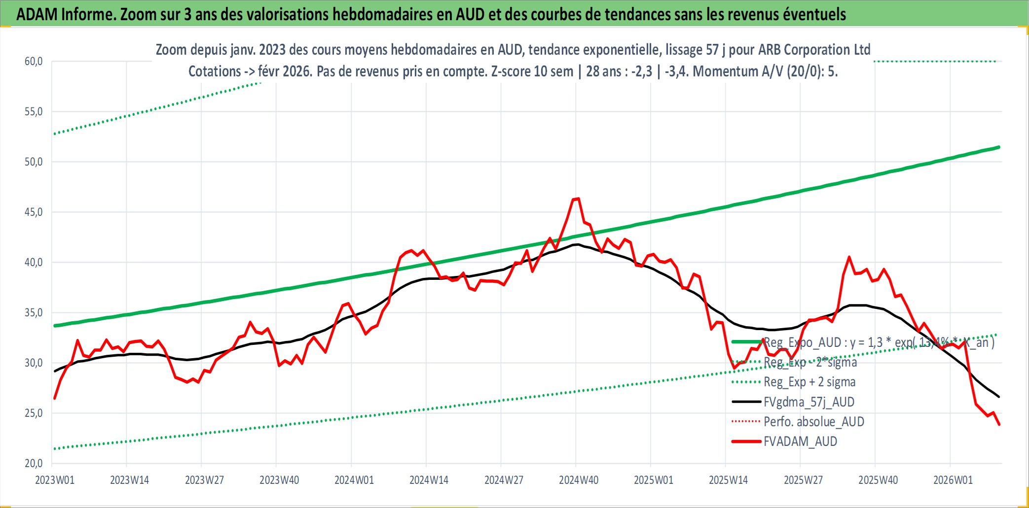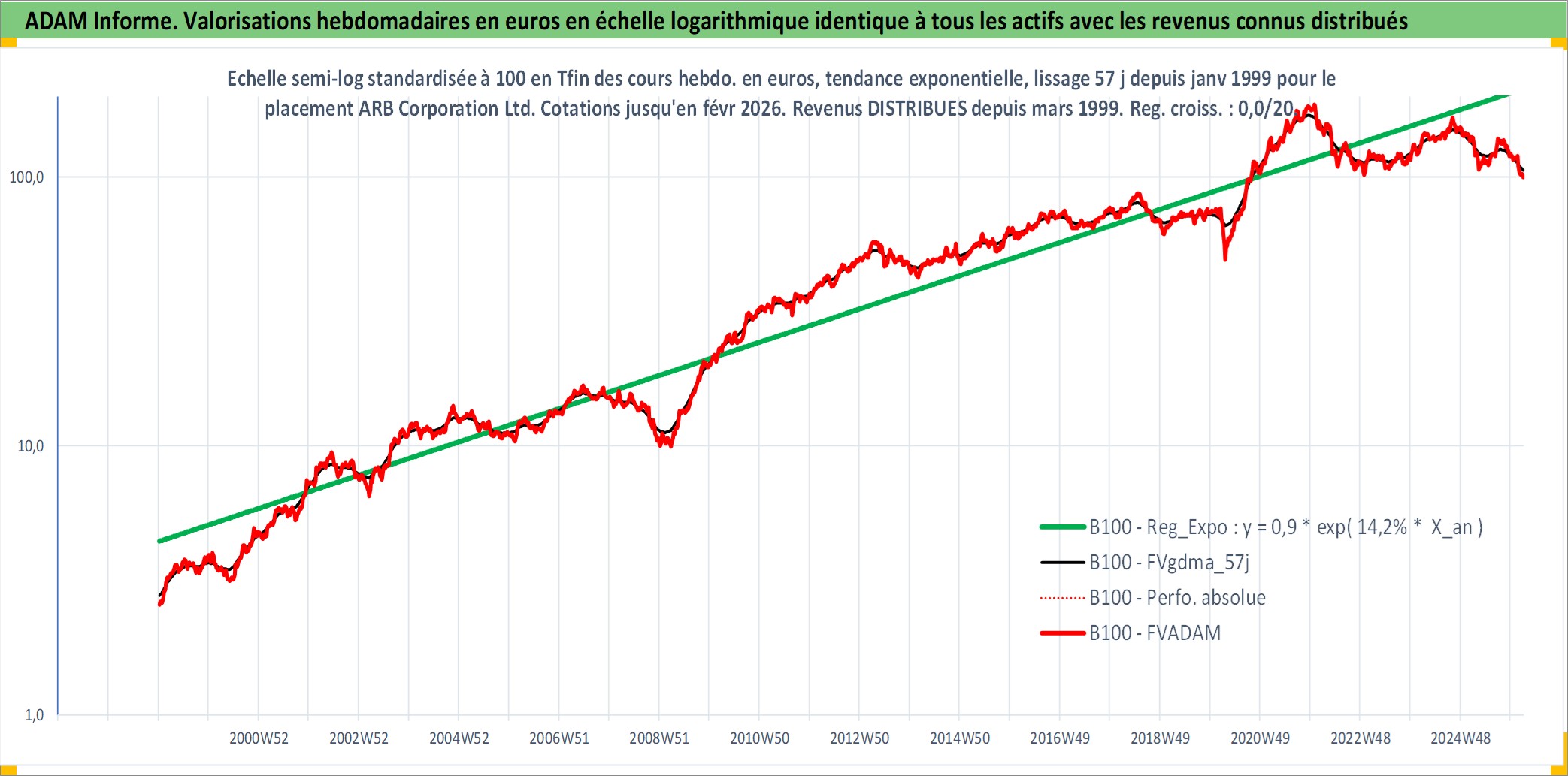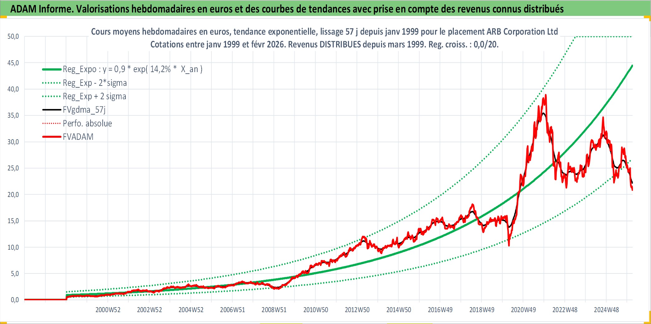 Site dédié aux investisseursPage dédiée sur site financeAnalyse des valorisations hebdomadaires de l'action ARB Corporation Ltd. Cet actif est cote en AUD. Les valorisations sont en contrevaleur EURO et couvrent les semaines 1999W01 a 2026W09. Les revenus de cet actif financier sont pris en compte depuis la semaine 1999W13. La note ESG de cet actif n'est pas connue.