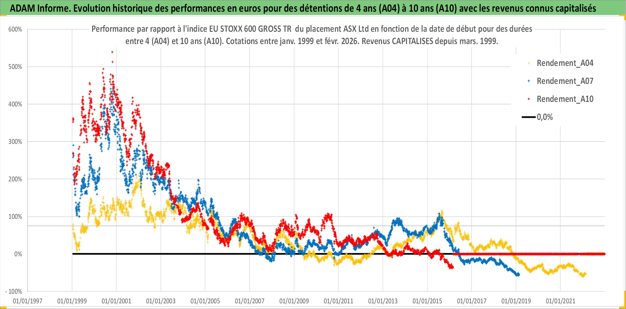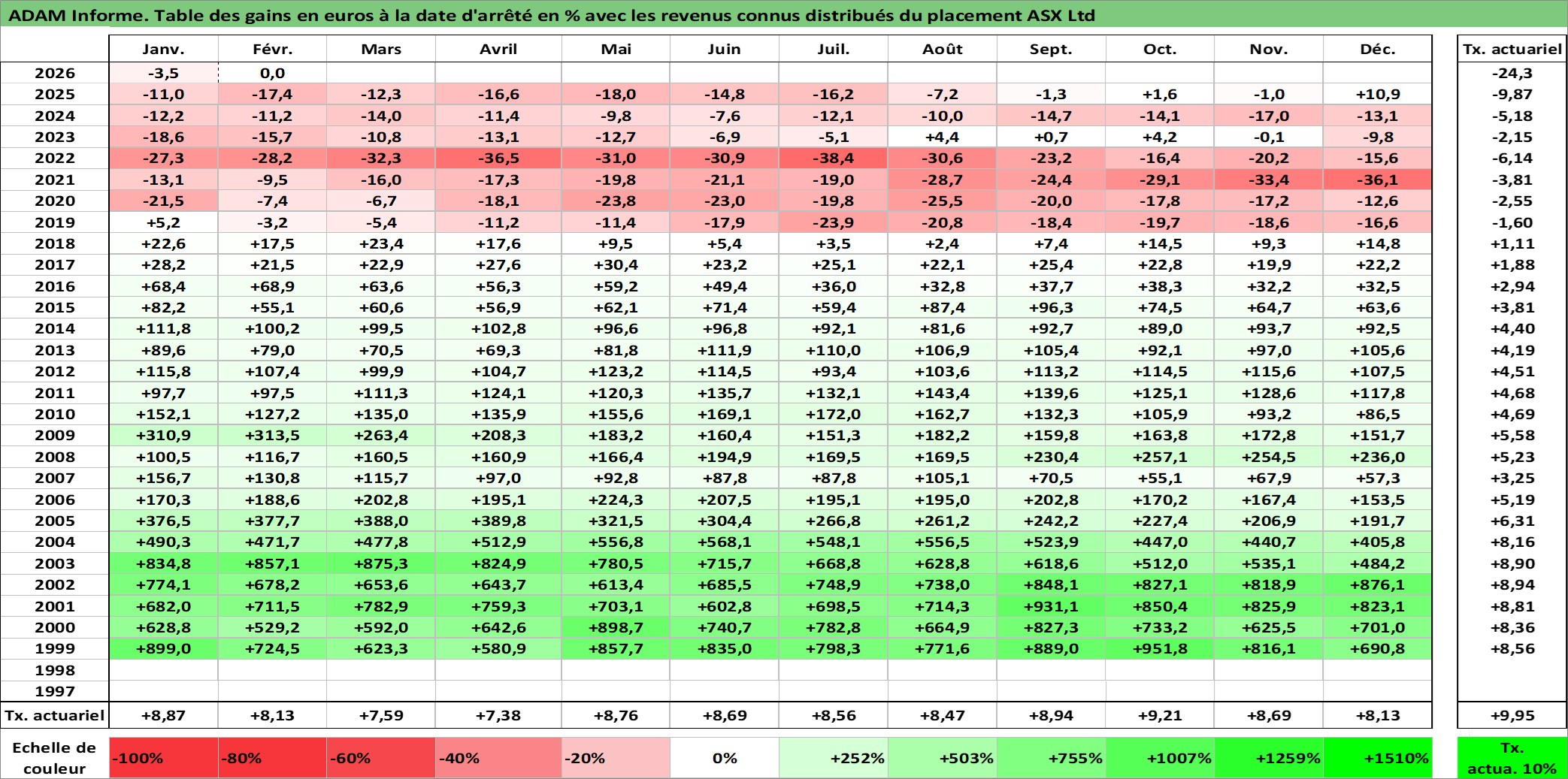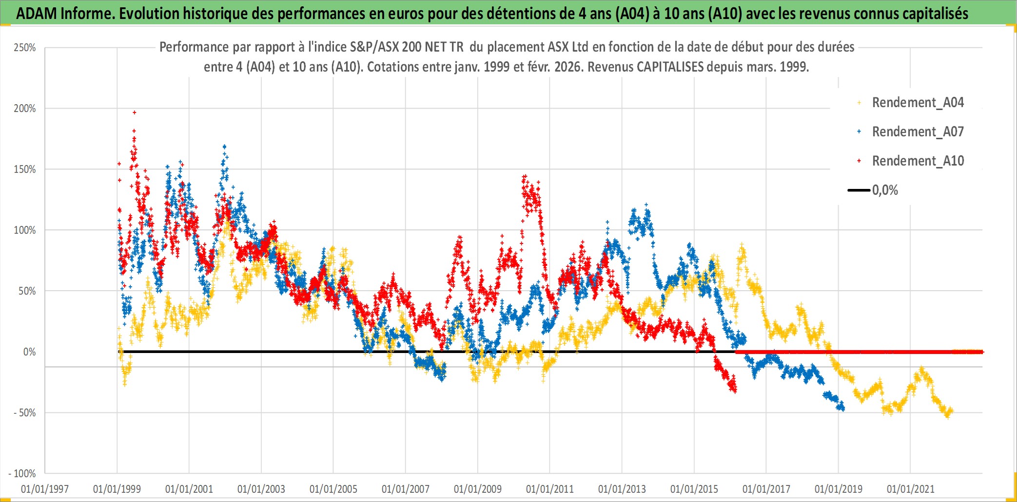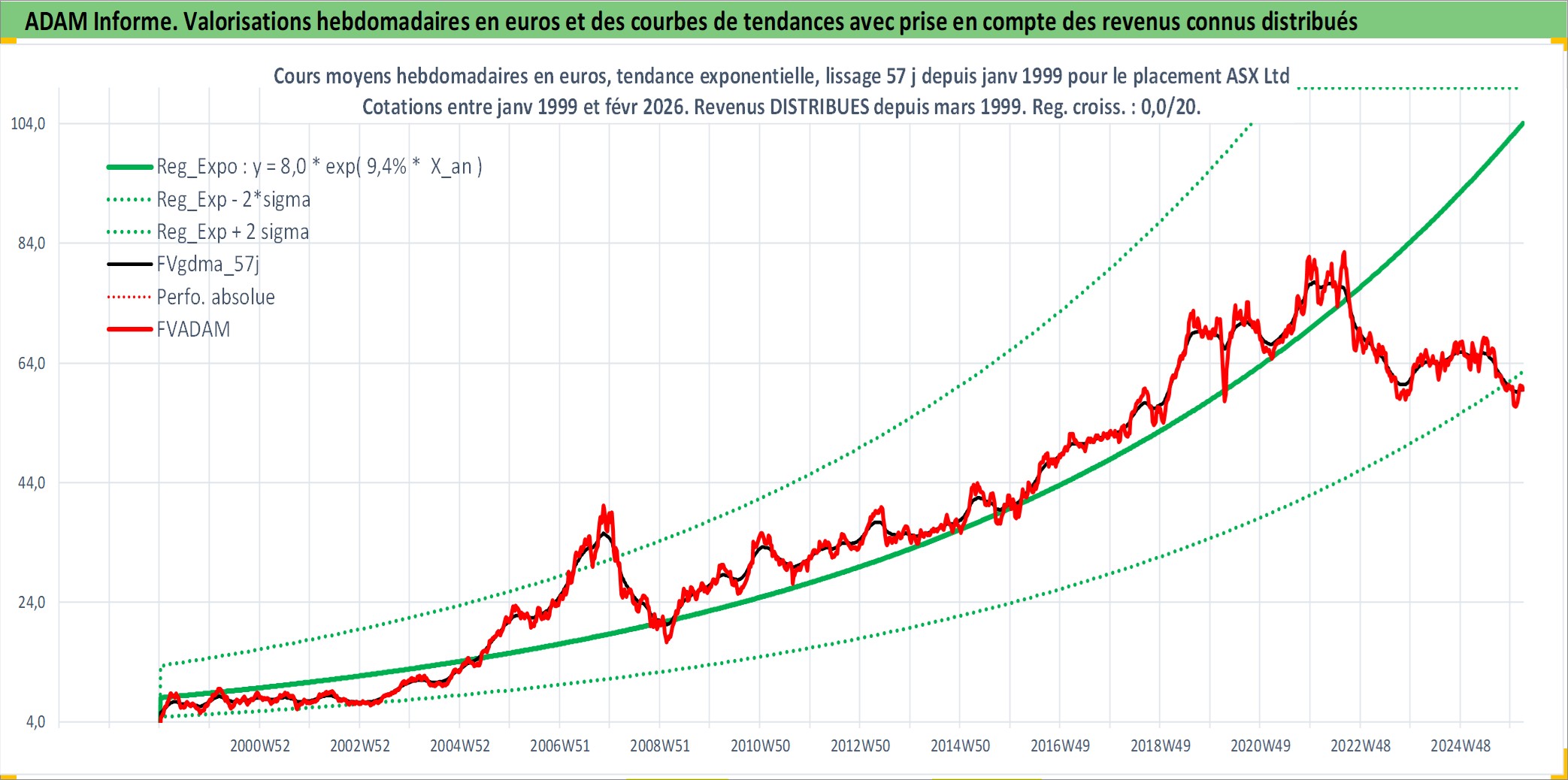 Site dédié aux investisseursPage dédiée sur site financeAnalyse des valorisations hebdomadaires de l'action ASX Ltd. Cet actif est cote en AUD. Les valorisations sont en contrevaleur EURO et couvrent les semaines 1999W01 a 2026W09. Les revenus de cet actif financier sont pris en compte depuis la semaine 1999W10. La note globale ESG de cet actif est estimee a 10.0 (apres rebasage entre 0 et 20).