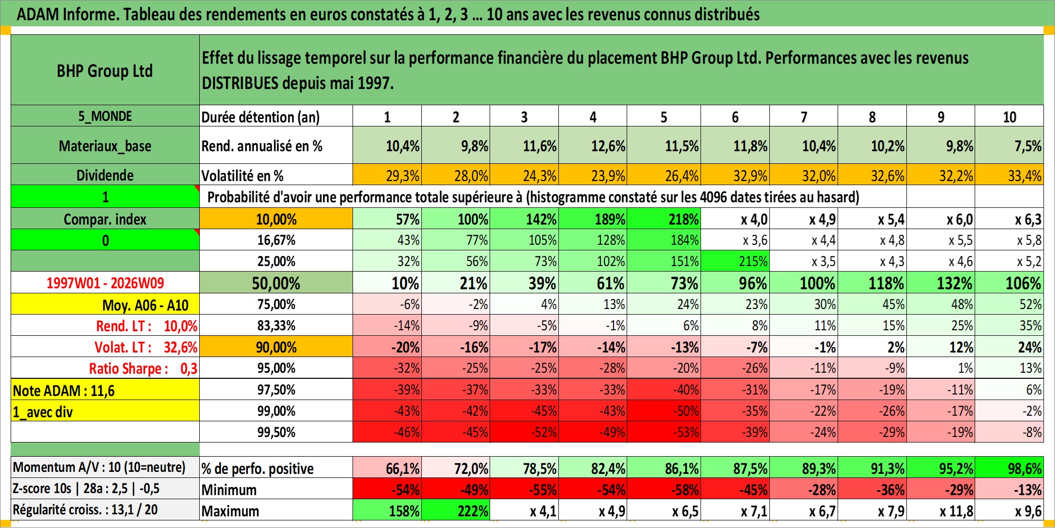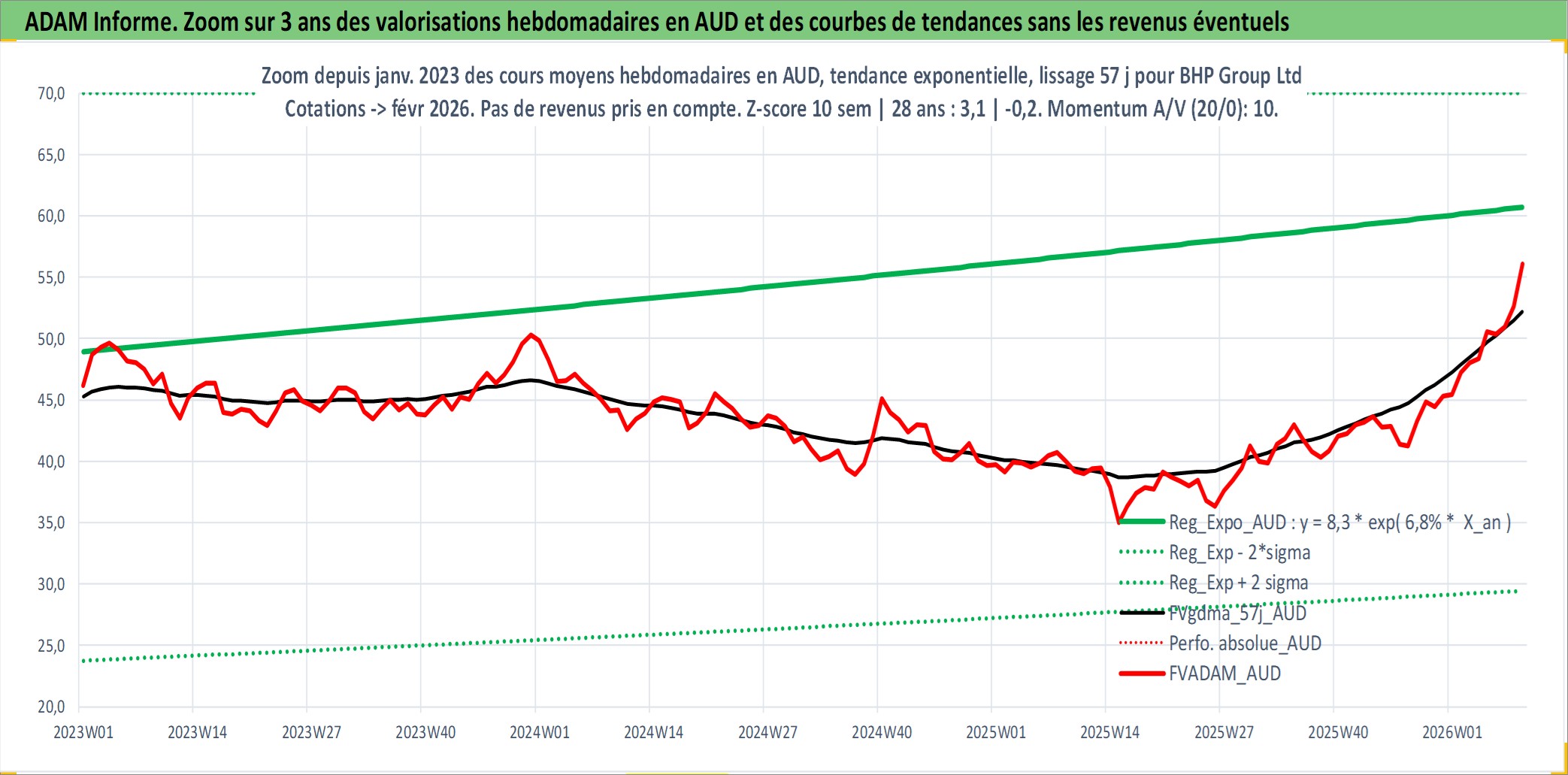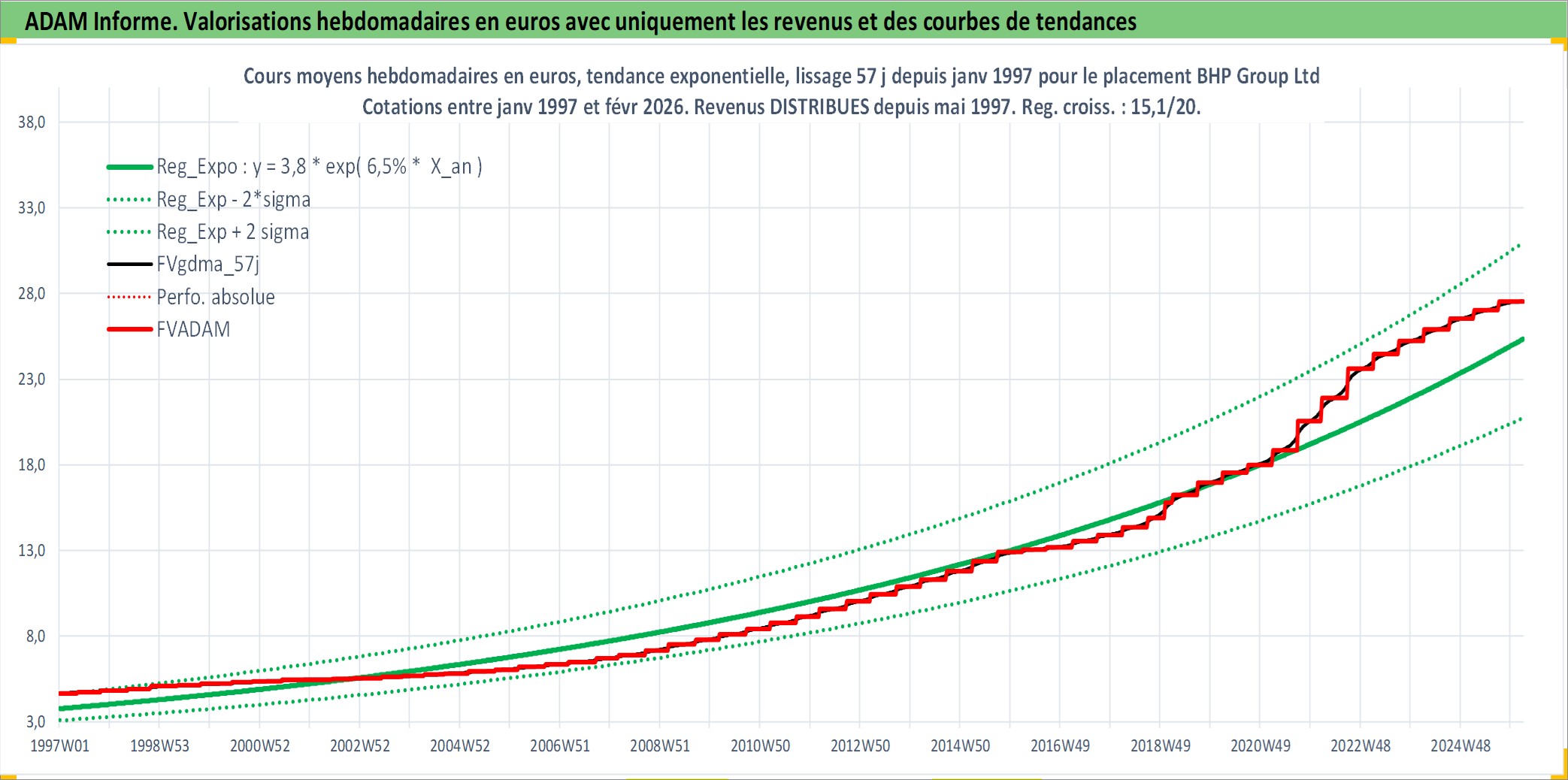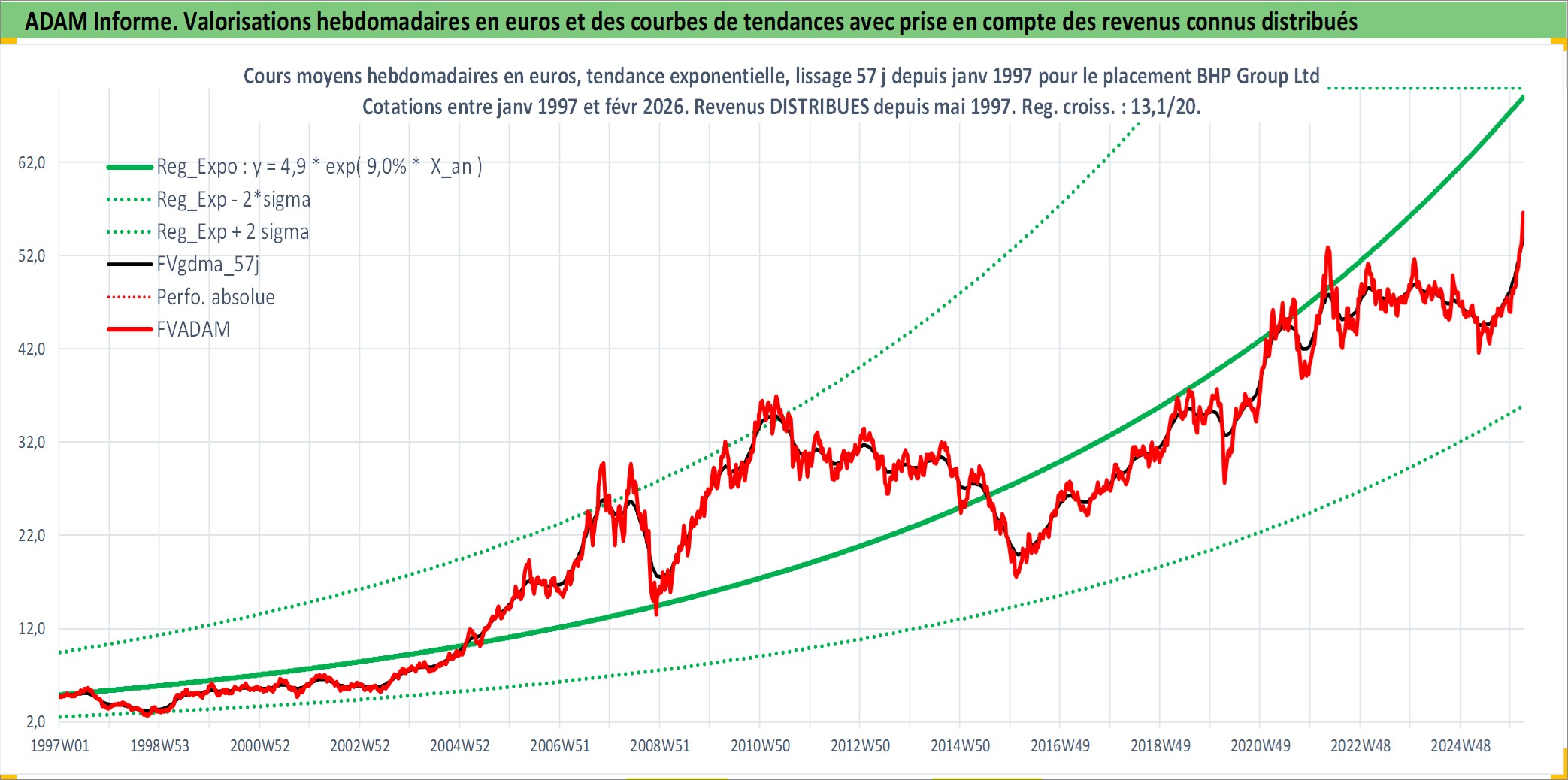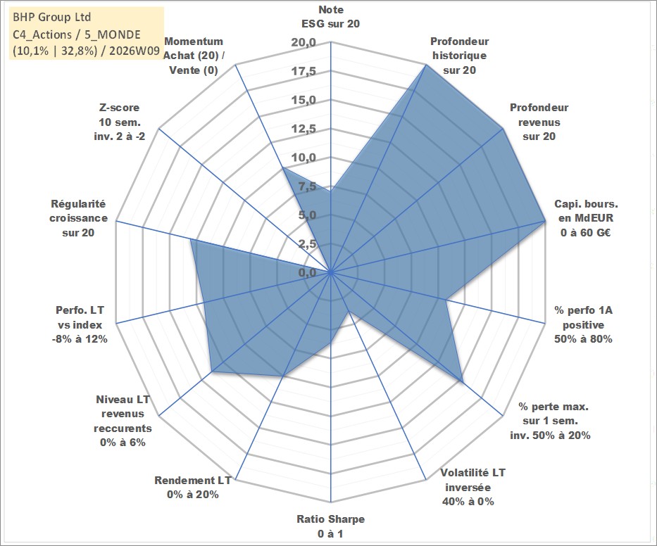 Site dédié aux investisseursPage dédiée sur site financeAnalyse des valorisations hebdomadaires de l'action BHP Group Ltd. Cet actif est cote en AUD. Les valorisations sont en contrevaleur EURO et couvrent les semaines 1997W01 a 2026W09. Les revenus de cet actif financier sont pris en compte depuis la semaine 1997W20. La note globale ESG de cet actif est estimee a 7.0 (apres rebasage entre 0 et 20).