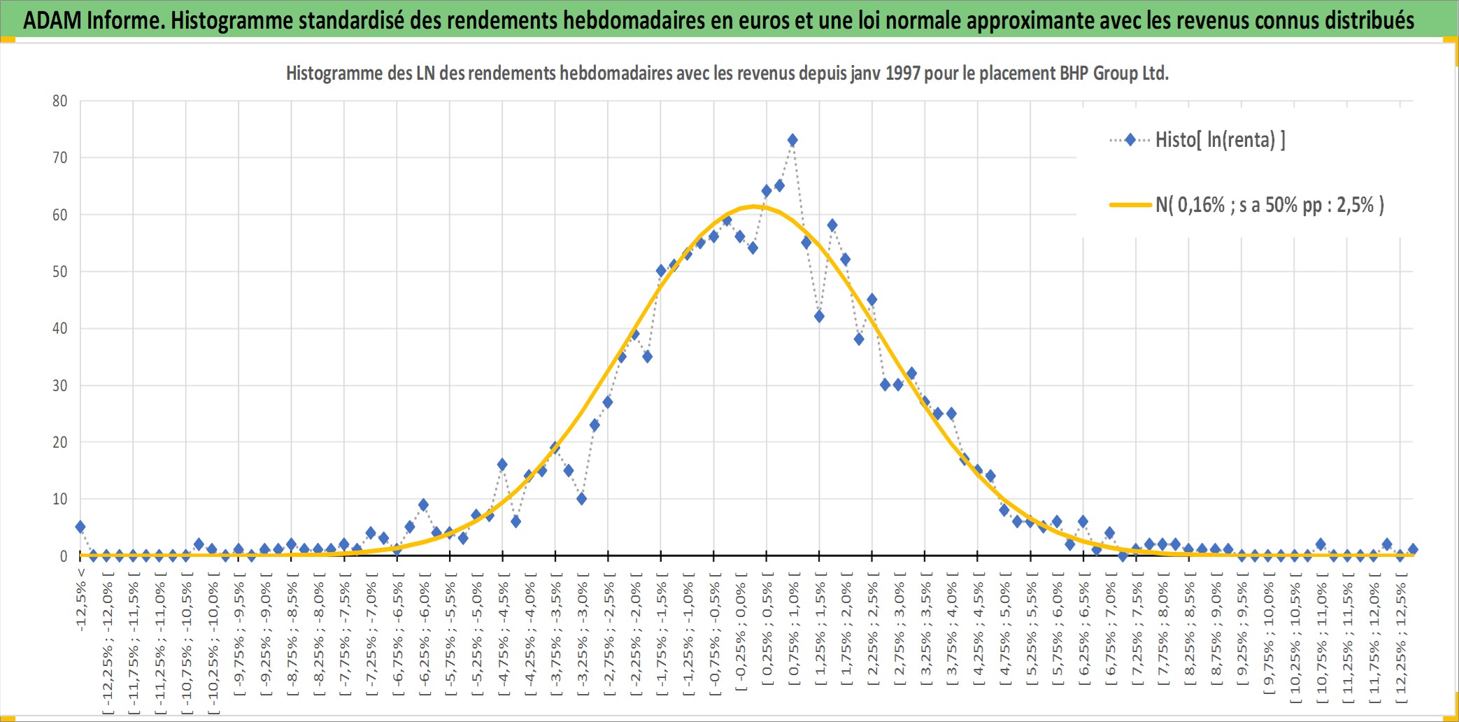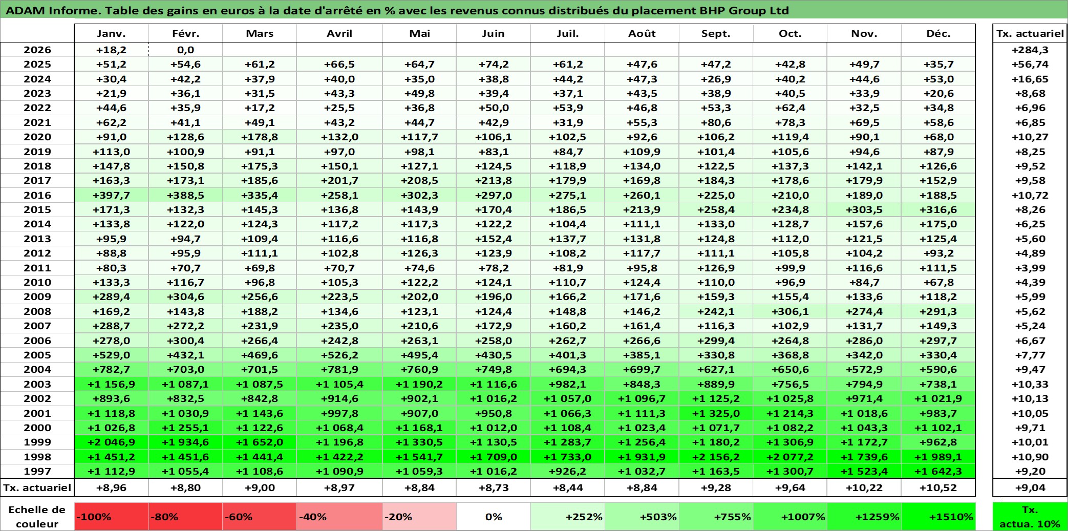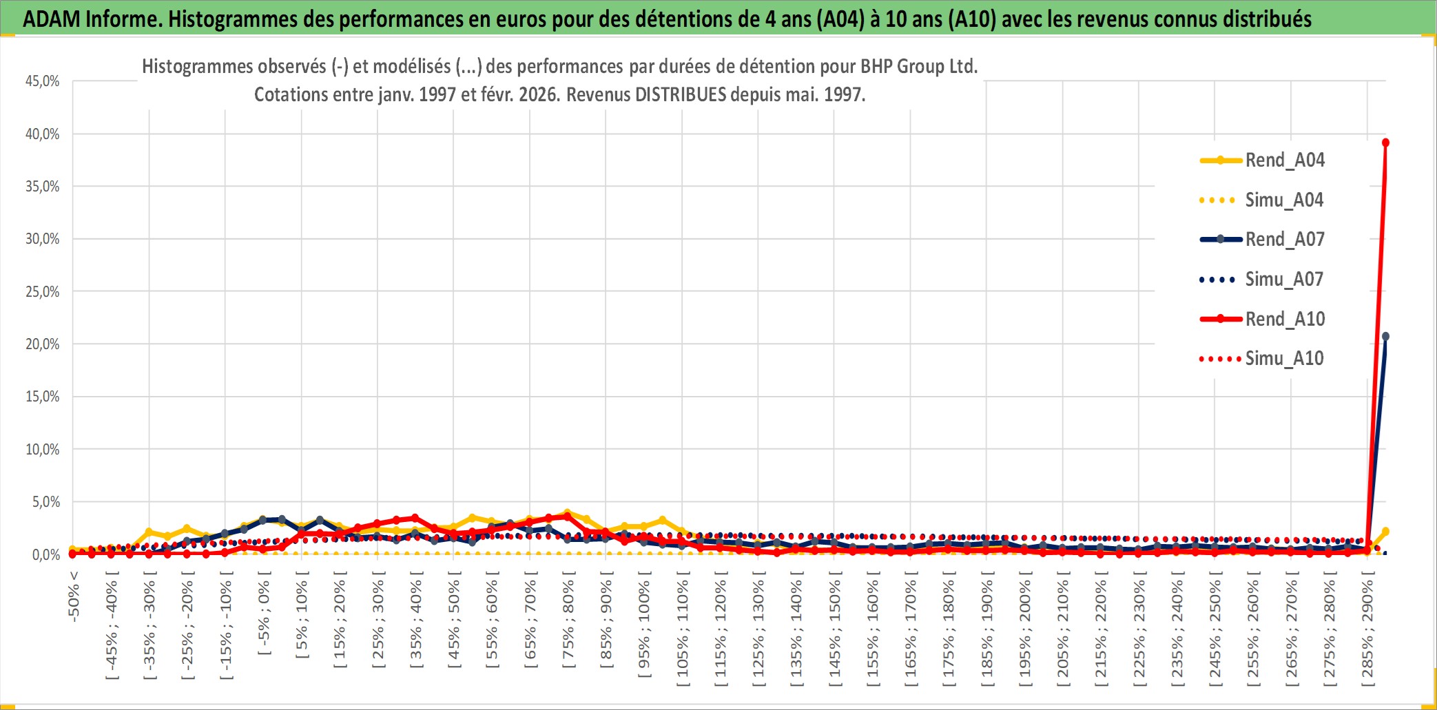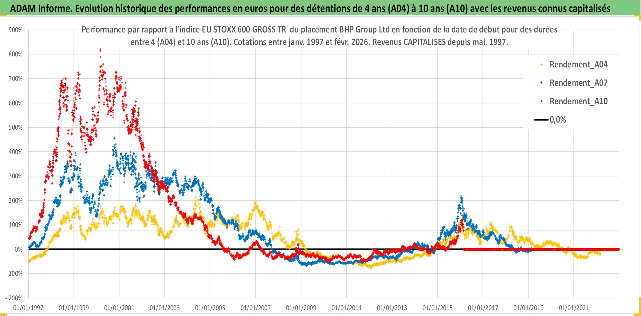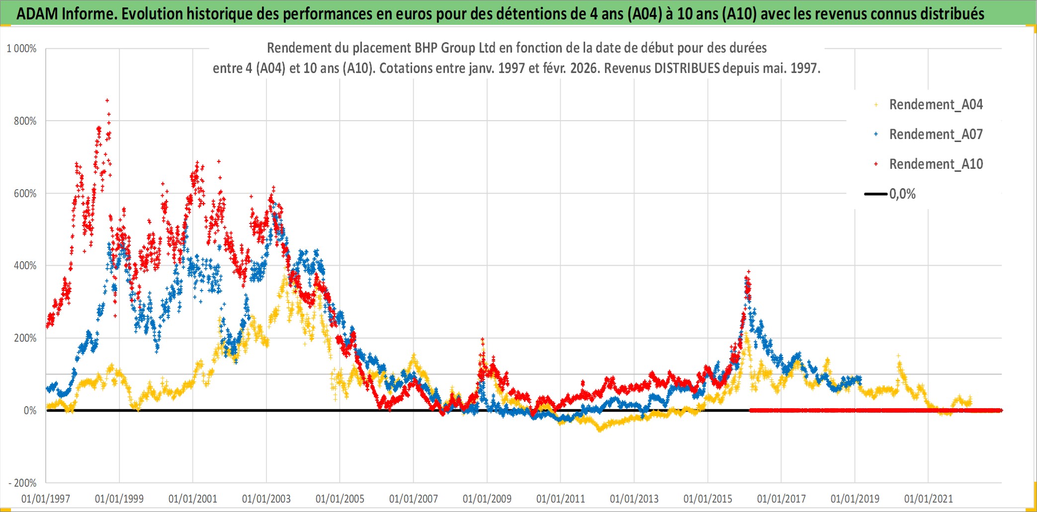 Site dédié aux investisseursPage dédiée sur site financeAnalyse des valorisations hebdomadaires de l'action BHP Group Ltd. Cet actif est cote en AUD. Les valorisations sont en contrevaleur EURO et couvrent les semaines 1997W01 a 2026W09. Les revenus de cet actif financier sont pris en compte depuis la semaine 1997W20. La note globale ESG de cet actif est estimee a 7.0 (apres rebasage entre 0 et 20).