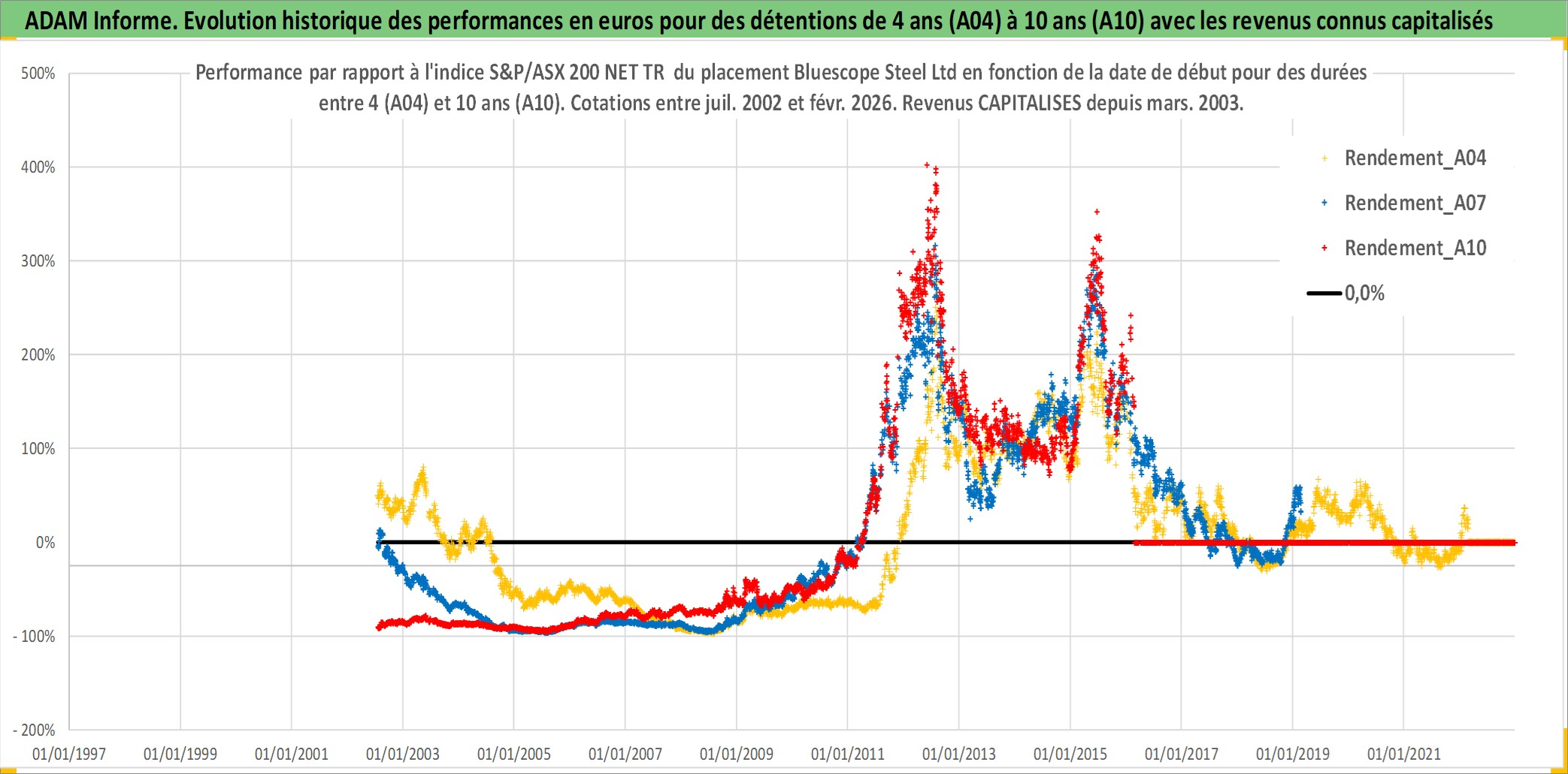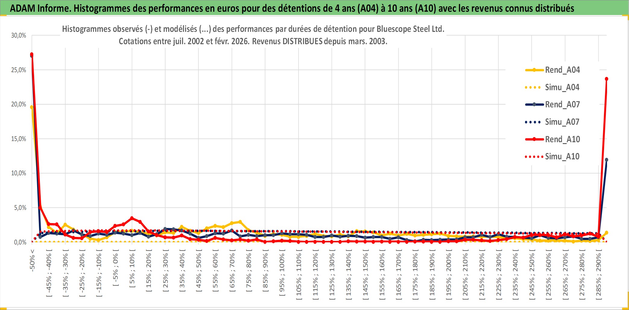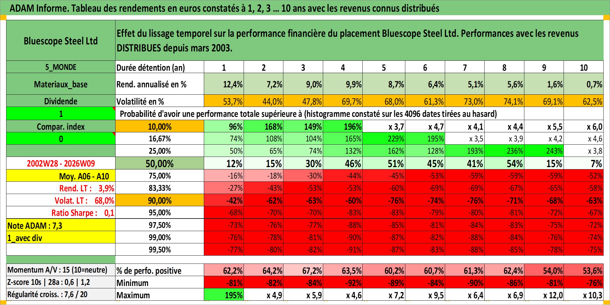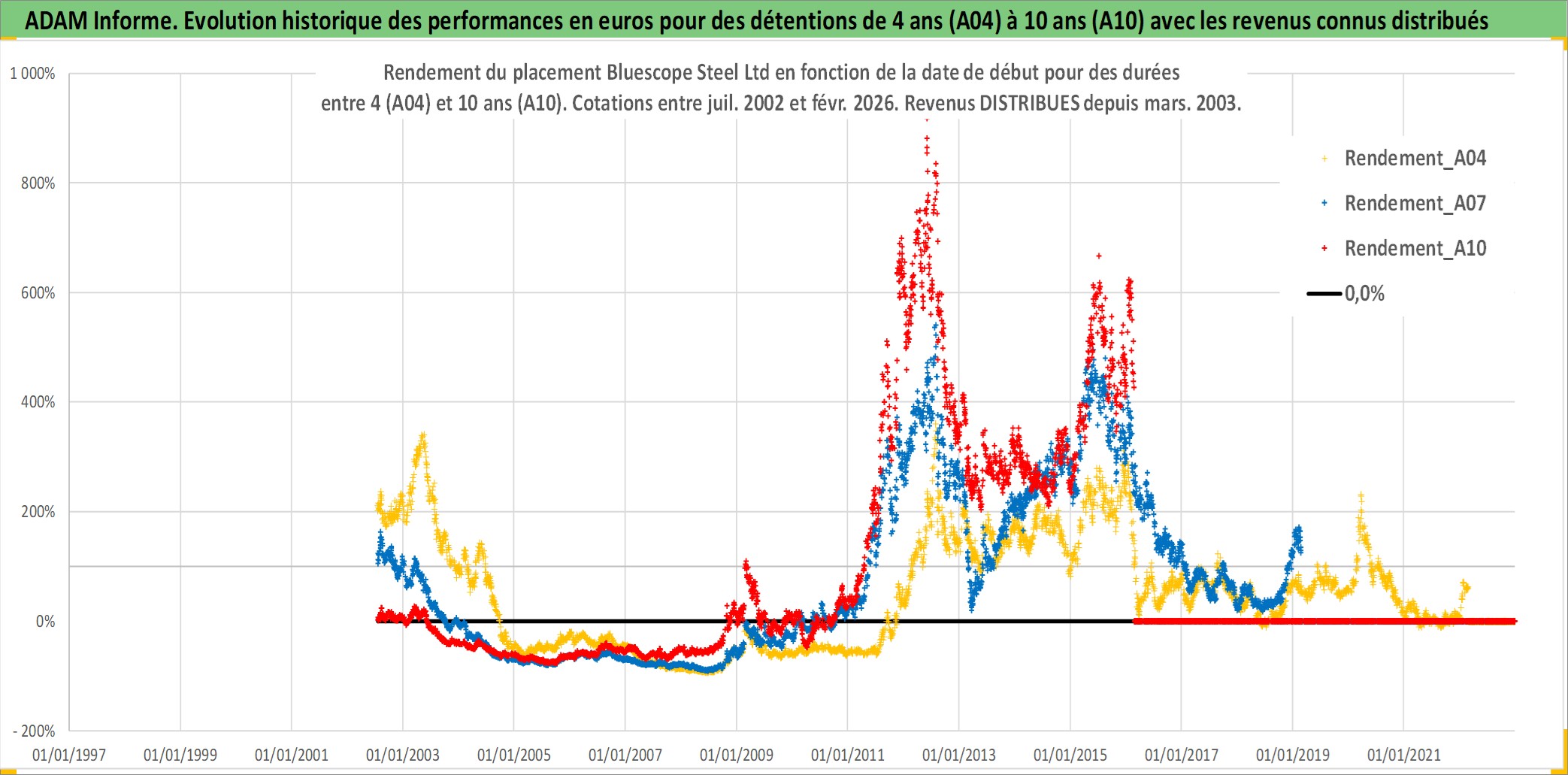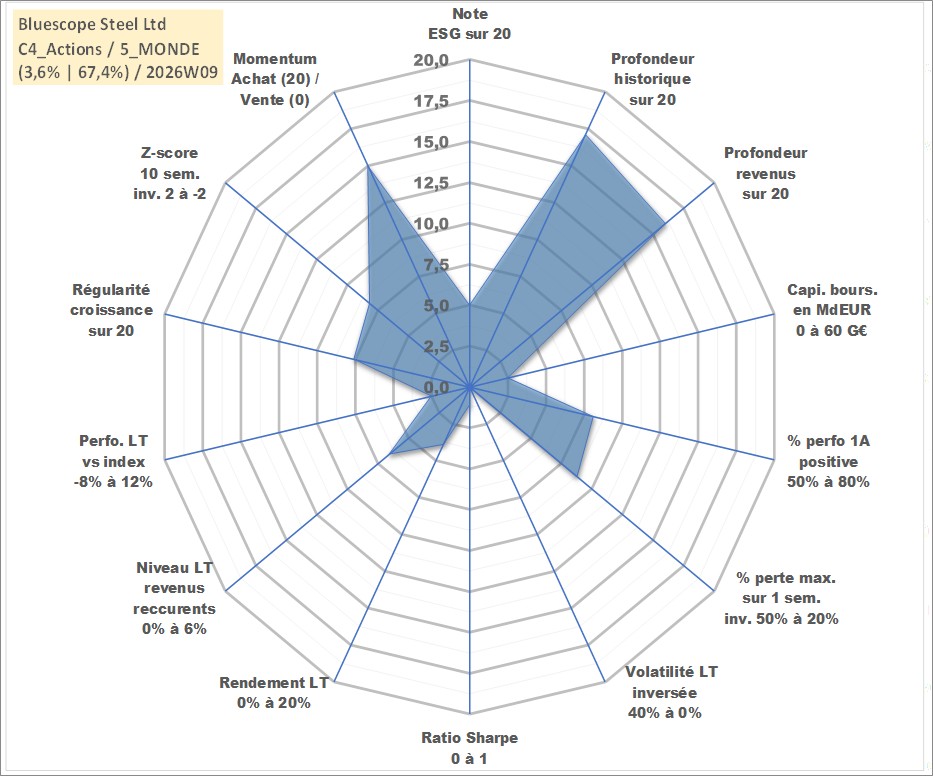 Site dédié aux investisseursPage dédiée sur site financeAnalyse des valorisations hebdomadaires de l'action Bluescope Steel Ltd. Cet actif est cote en AUD. Les valorisations sont en contrevaleur EURO et couvrent les semaines 2002W28 a 2026W09. Les revenus de cet actif financier sont pris en compte depuis la semaine 2003W11. La note globale ESG de cet actif est estimee a 5.0 (apres rebasage entre 0 et 20).