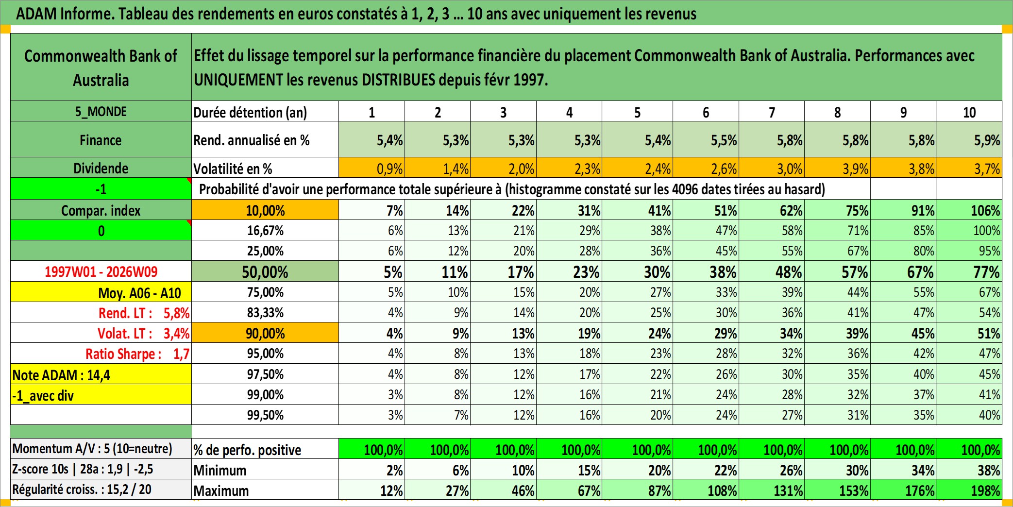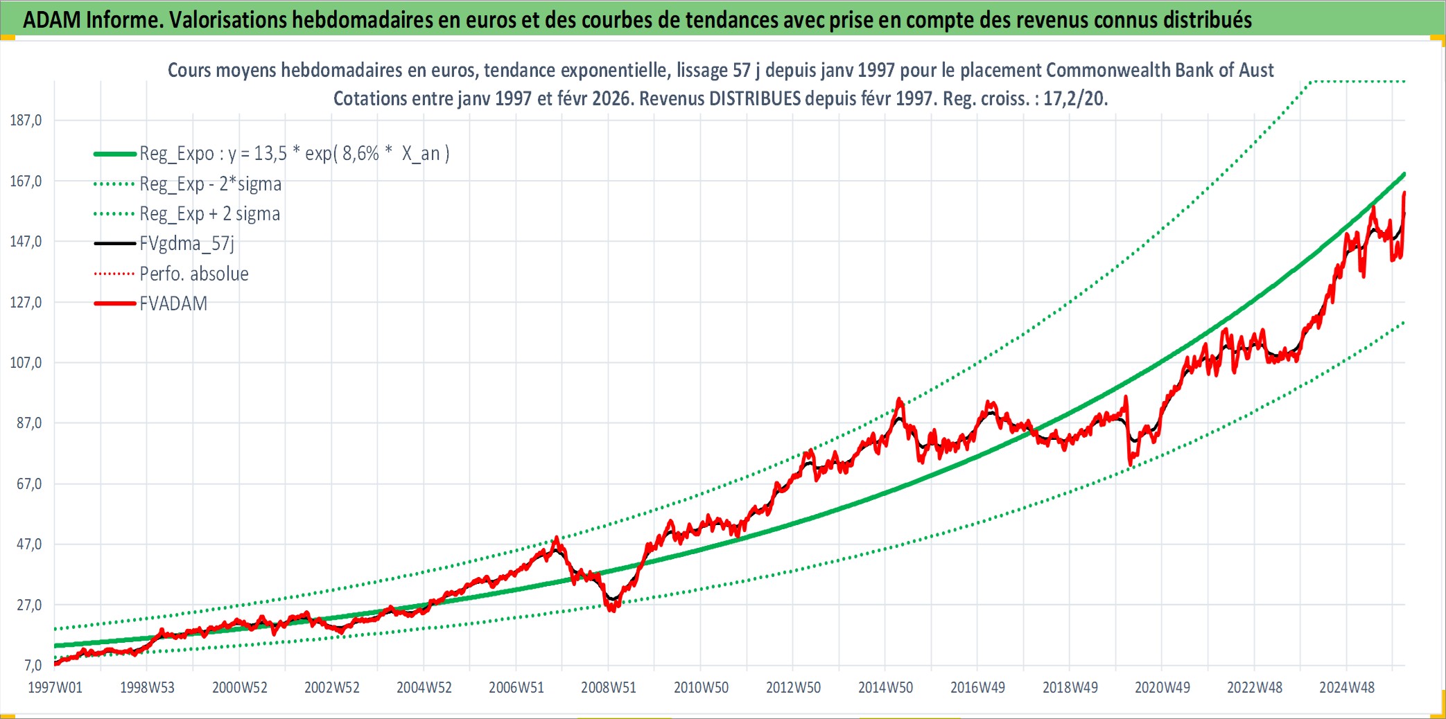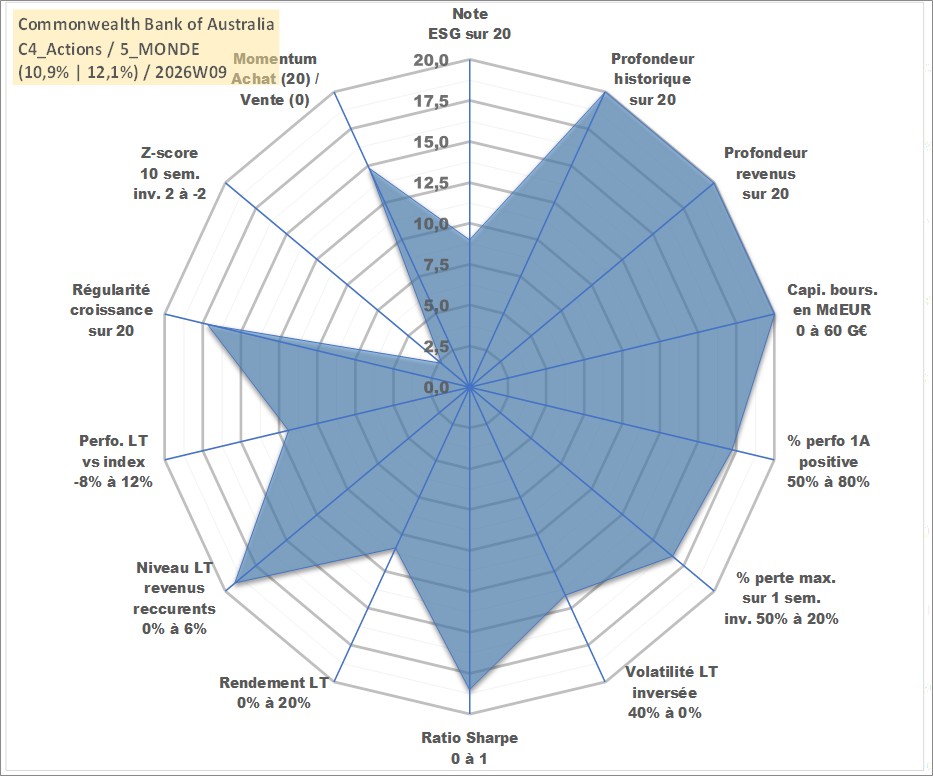 Site dédié aux investisseursPage dédiée sur site financeAnalyse des valorisations hebdomadaires de l'action Commonwealth Bank of Australia. Cet actif est cote en AUD. Les valorisations sont en contrevaleur EURO et couvrent les semaines 1997W01 a 2026W09. Les revenus de cet actif financier sont pris en compte depuis la semaine 1997W08. La note globale ESG de cet actif est estimee a 9.0 (apres rebasage entre 0 et 20).