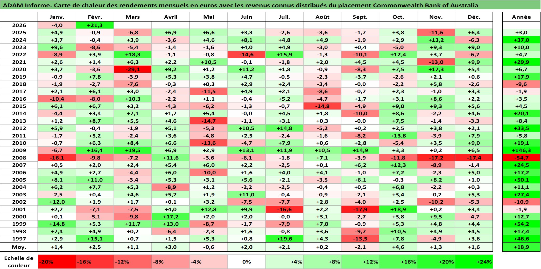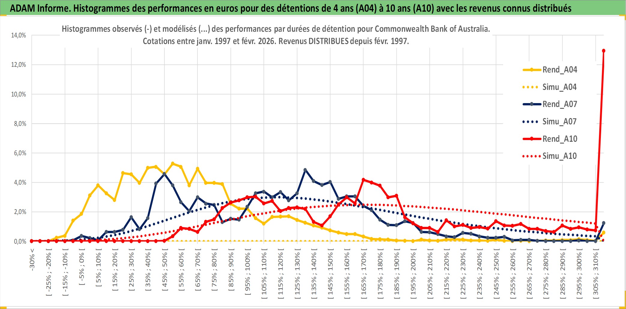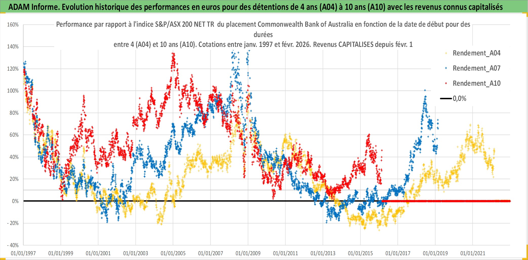 Site dédié aux investisseursPage dédiée sur site financeAnalyse des valorisations hebdomadaires de l'action Commonwealth Bank of Australia. Cet actif est cote en AUD. Les valorisations sont en contrevaleur EURO et couvrent les semaines 1997W01 a 2026W09. Les revenus de cet actif financier sont pris en compte depuis la semaine 1997W08. La note globale ESG de cet actif est estimee a 9.0 (apres rebasage entre 0 et 20).