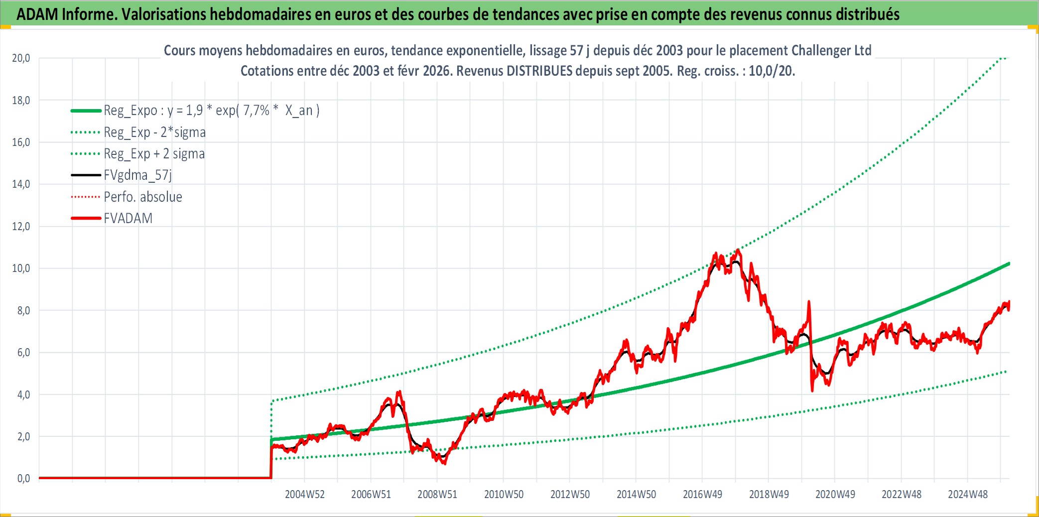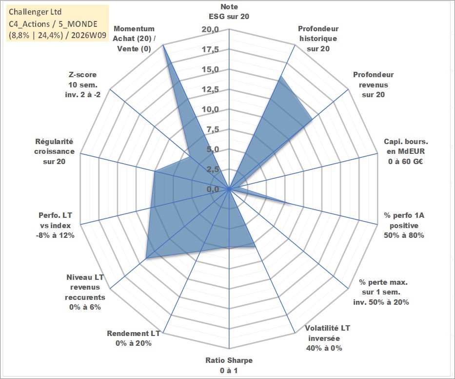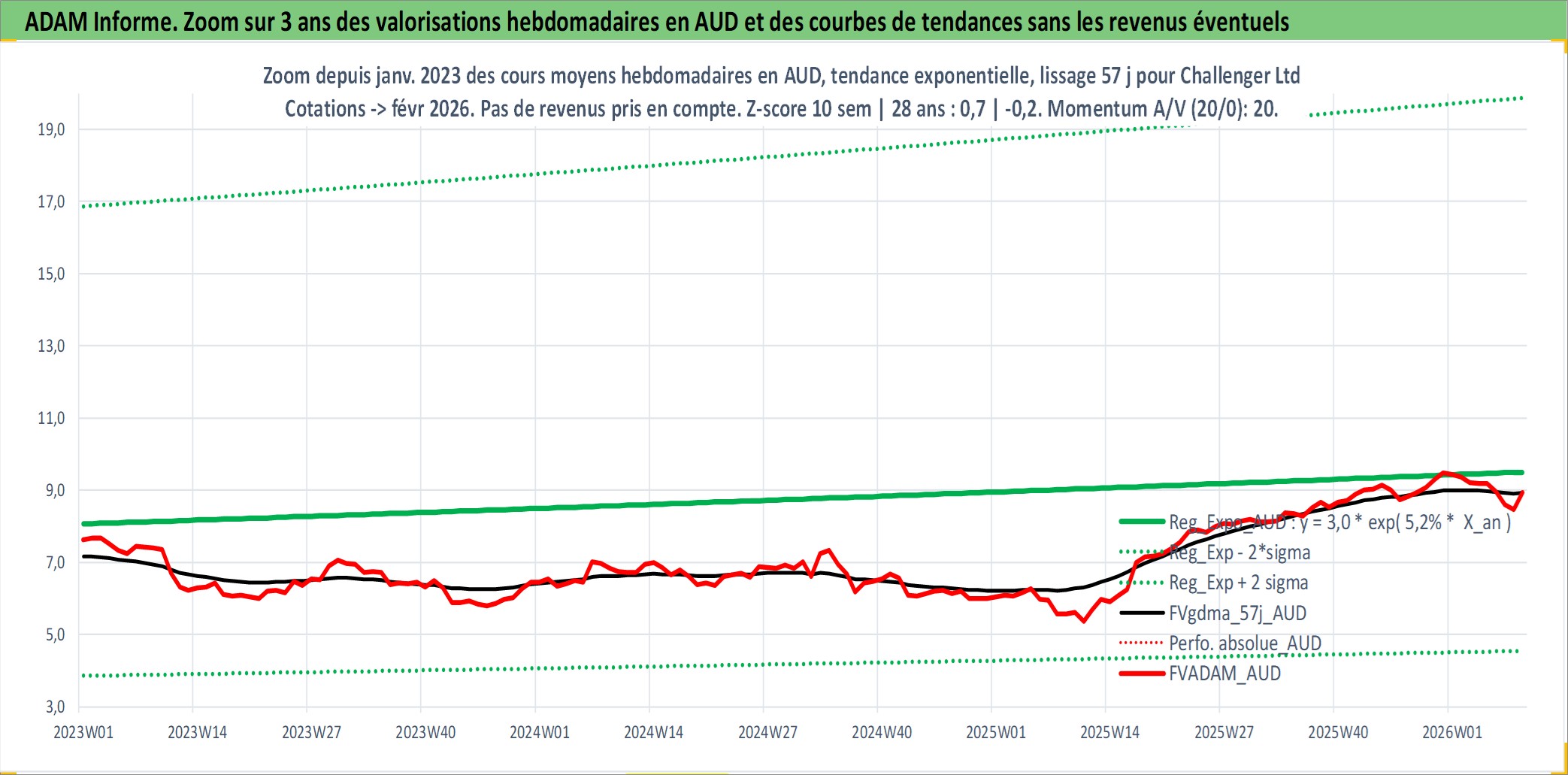 Site dédié aux investisseursPage dédiée sur site financeAnalyse des valorisations hebdomadaires de l'action Challenger Ltd. Cet actif est cote en AUD. Les valorisations sont en contrevaleur EURO et couvrent les semaines 2003W52 a 2026W09. Les revenus de cet actif financier sont pris en compte depuis la semaine 2005W39. La note ESG de cet actif n'est pas connue.