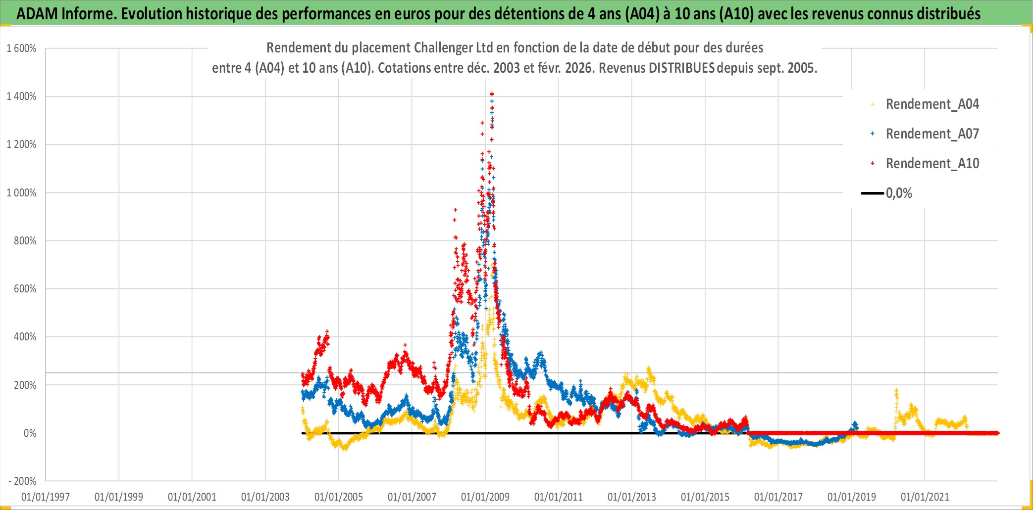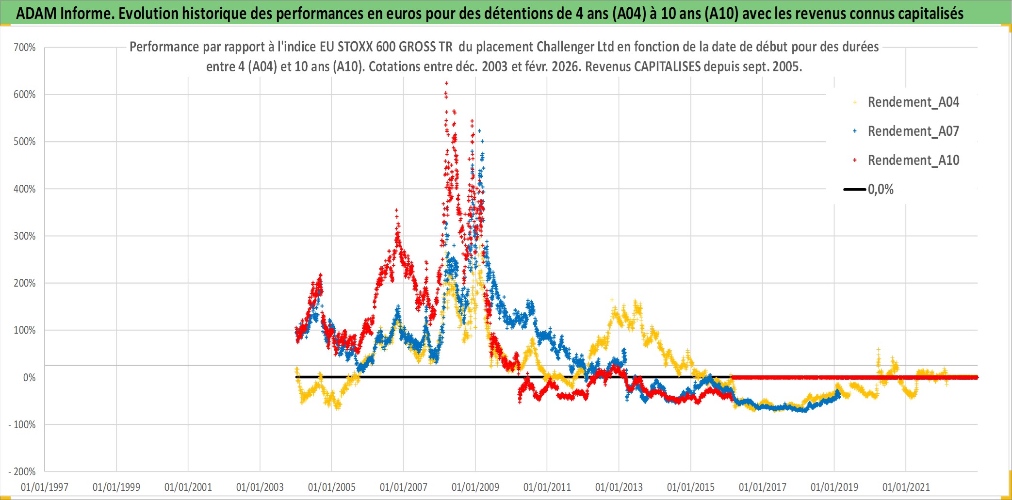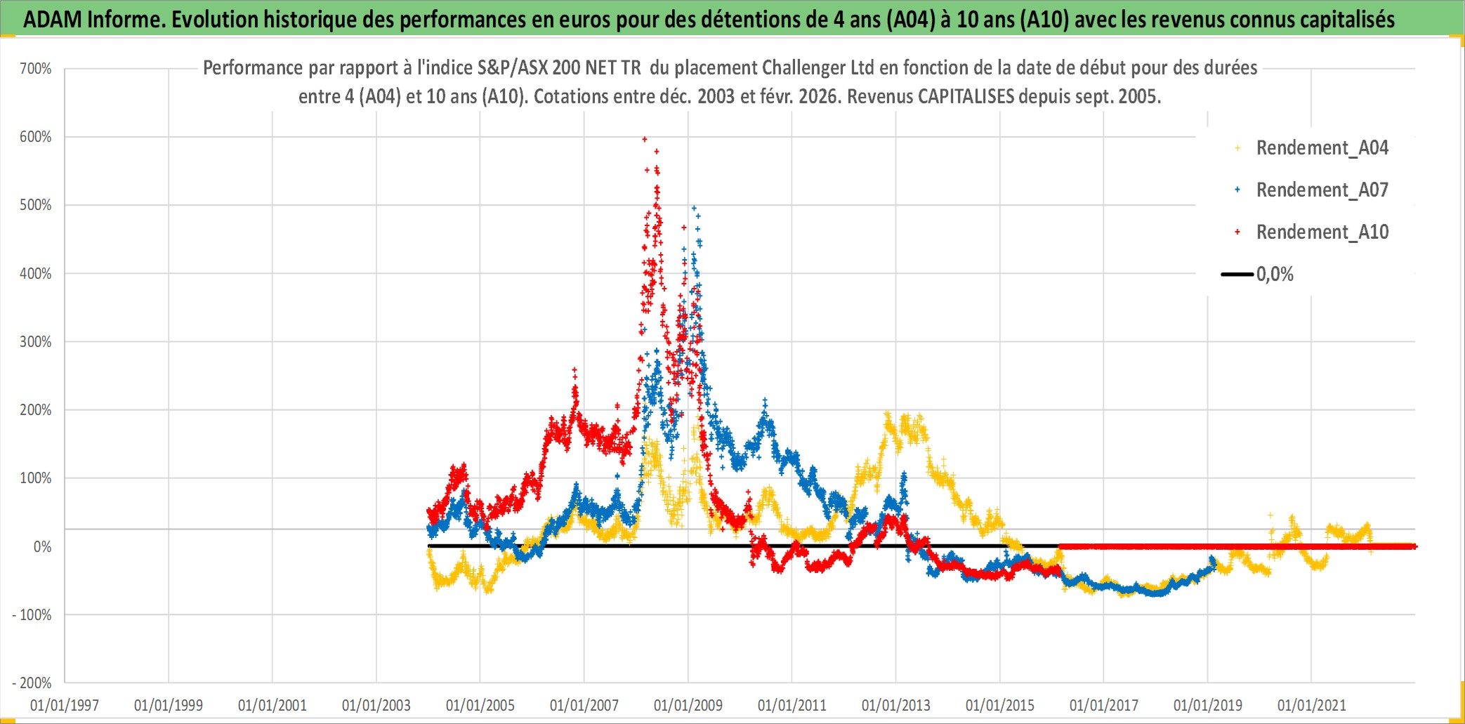 Site dédié aux investisseursPage dédiée sur site financeAnalyse des valorisations hebdomadaires de l'action Challenger Ltd. Cet actif est cote en AUD. Les valorisations sont en contrevaleur EURO et couvrent les semaines 2003W52 a 2026W09. Les revenus de cet actif financier sont pris en compte depuis la semaine 2005W39. La note ESG de cet actif n'est pas connue.