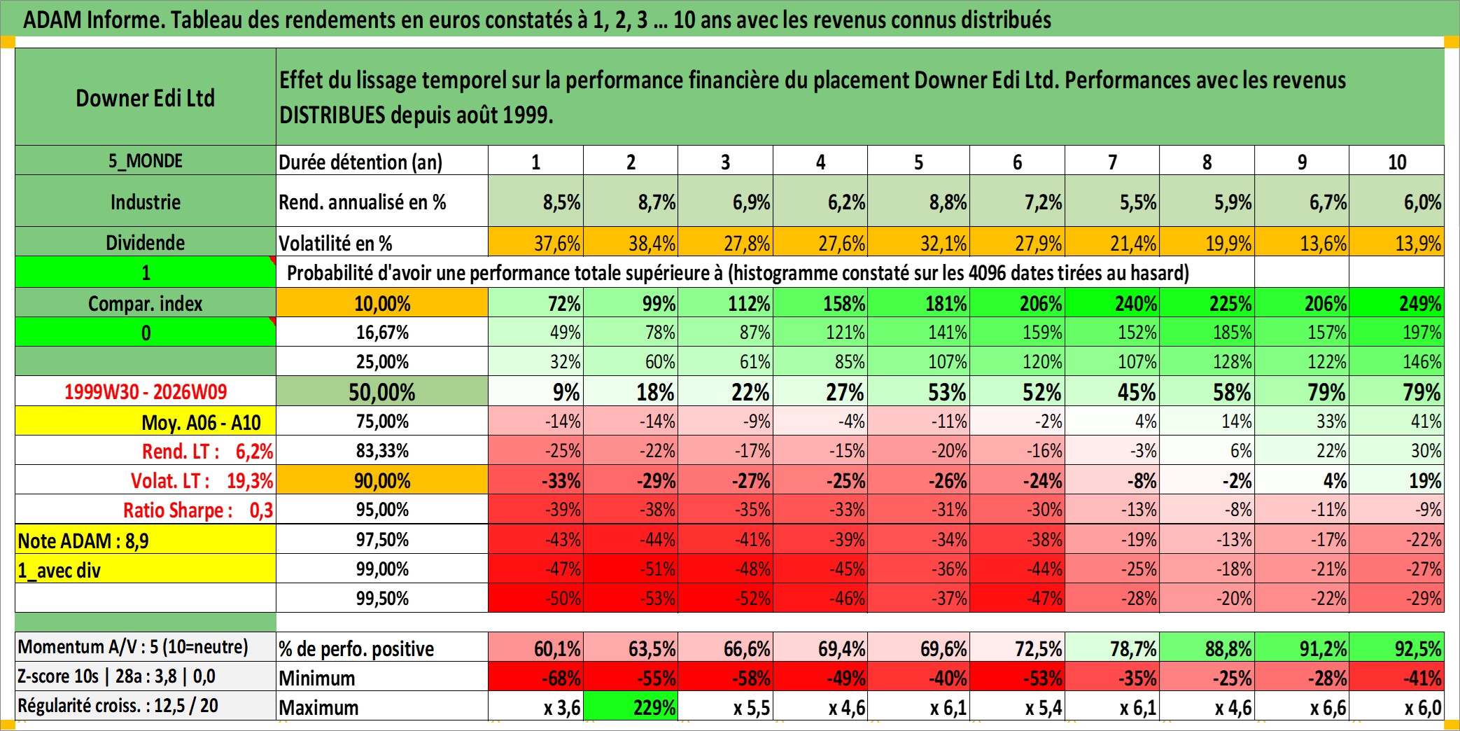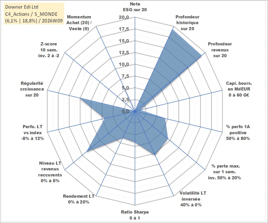 Site dédié aux investisseursPage dédiée sur site financeAnalyse des valorisations hebdomadaires de l'action Downer Edi Ltd. Cet actif est cote en AUD. Les valorisations sont en contrevaleur EURO et couvrent les semaines 1999W30 a 2026W09. Les revenus de cet actif financier sont pris en compte depuis la semaine 1999W34. La note ESG de cet actif n'est pas connue.