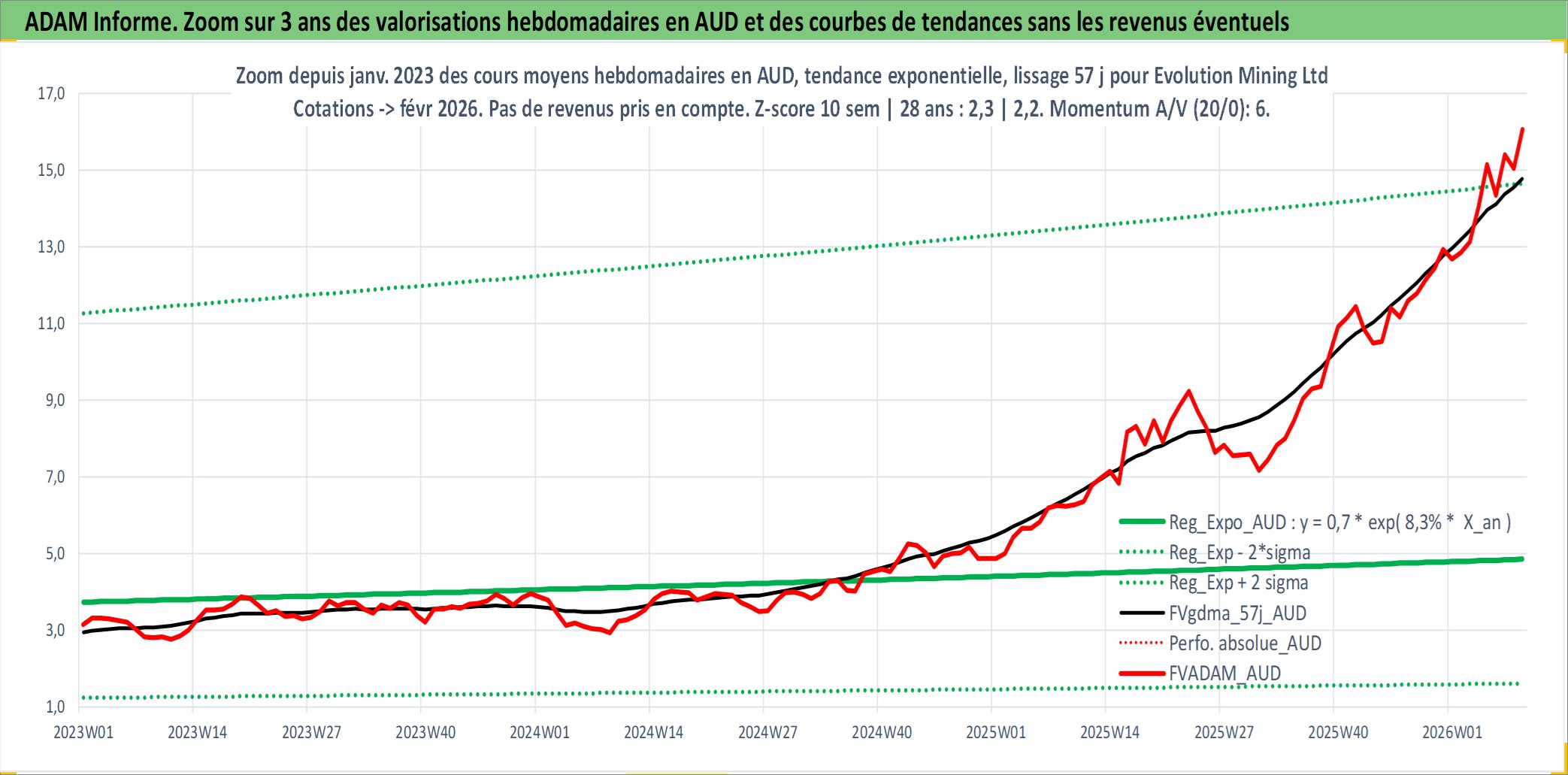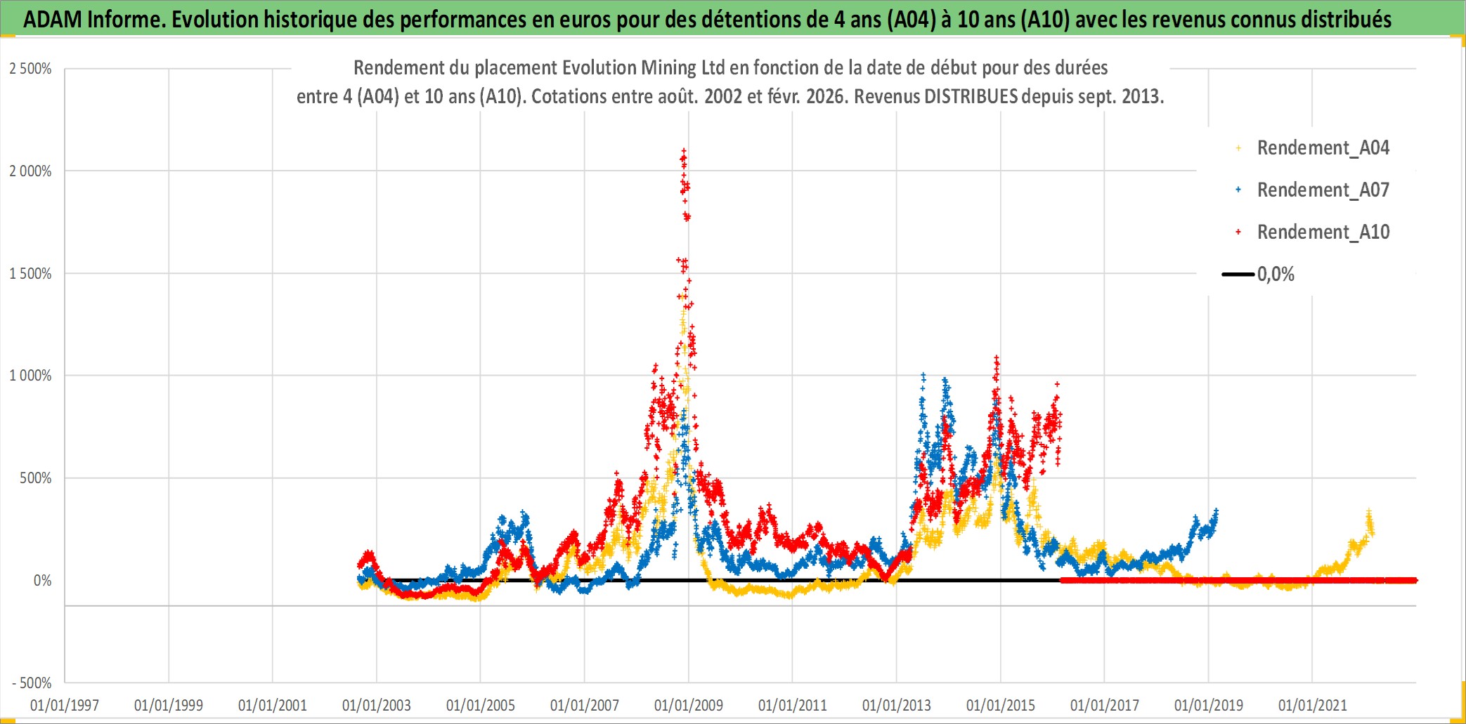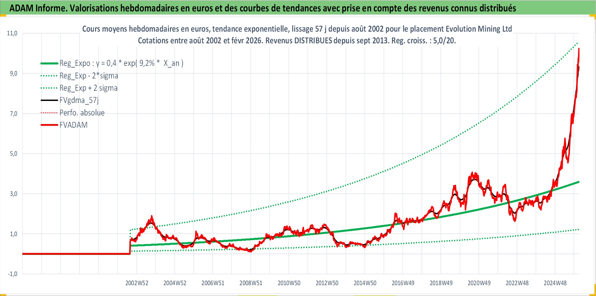 Site dédié aux investisseursPage dédiée sur site financeAnalyse des valorisations hebdomadaires de l'action Evolution Mining Ltd. Cet actif est cote en AUD. Les valorisations sont en contrevaleur EURO et couvrent les semaines 2002W34 a 2026W09. Les revenus de cet actif financier sont pris en compte depuis la semaine 2013W36. La note ESG de cet actif n'est pas connue.