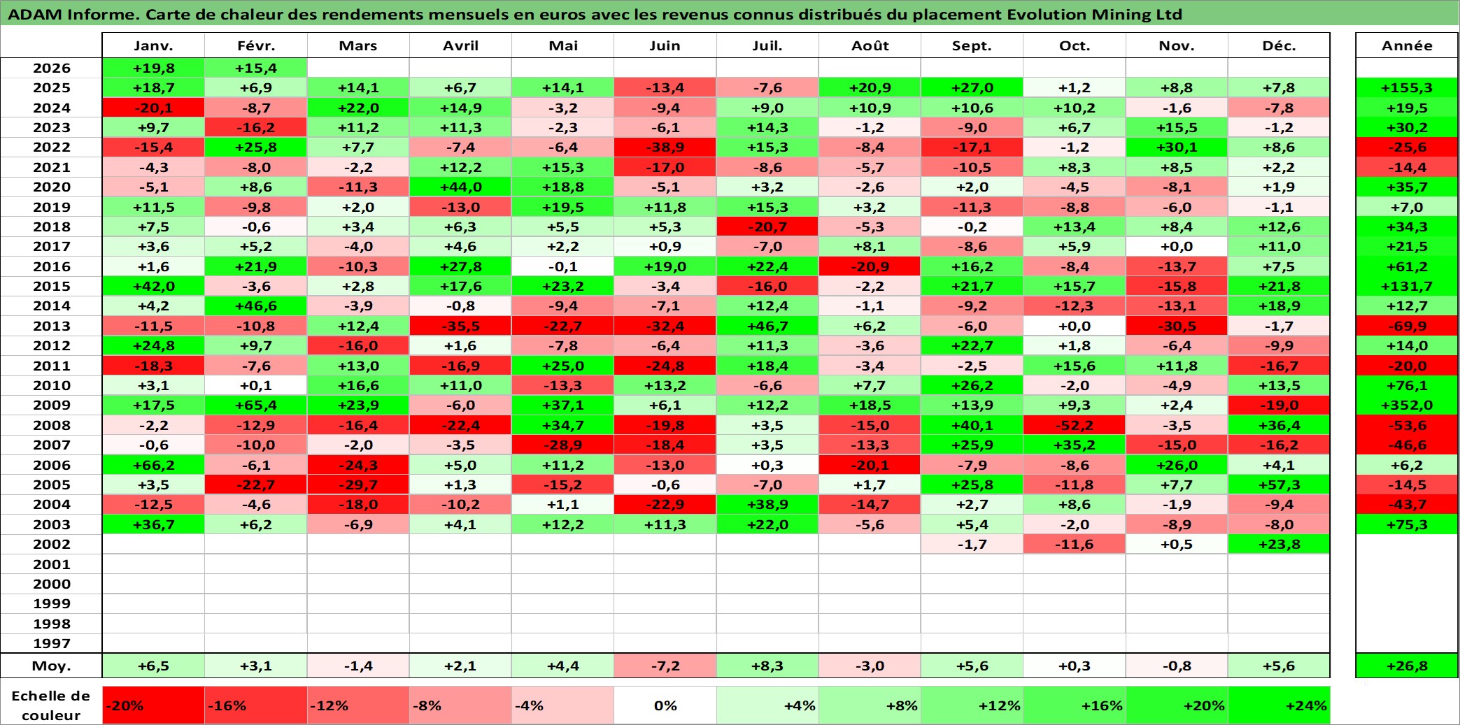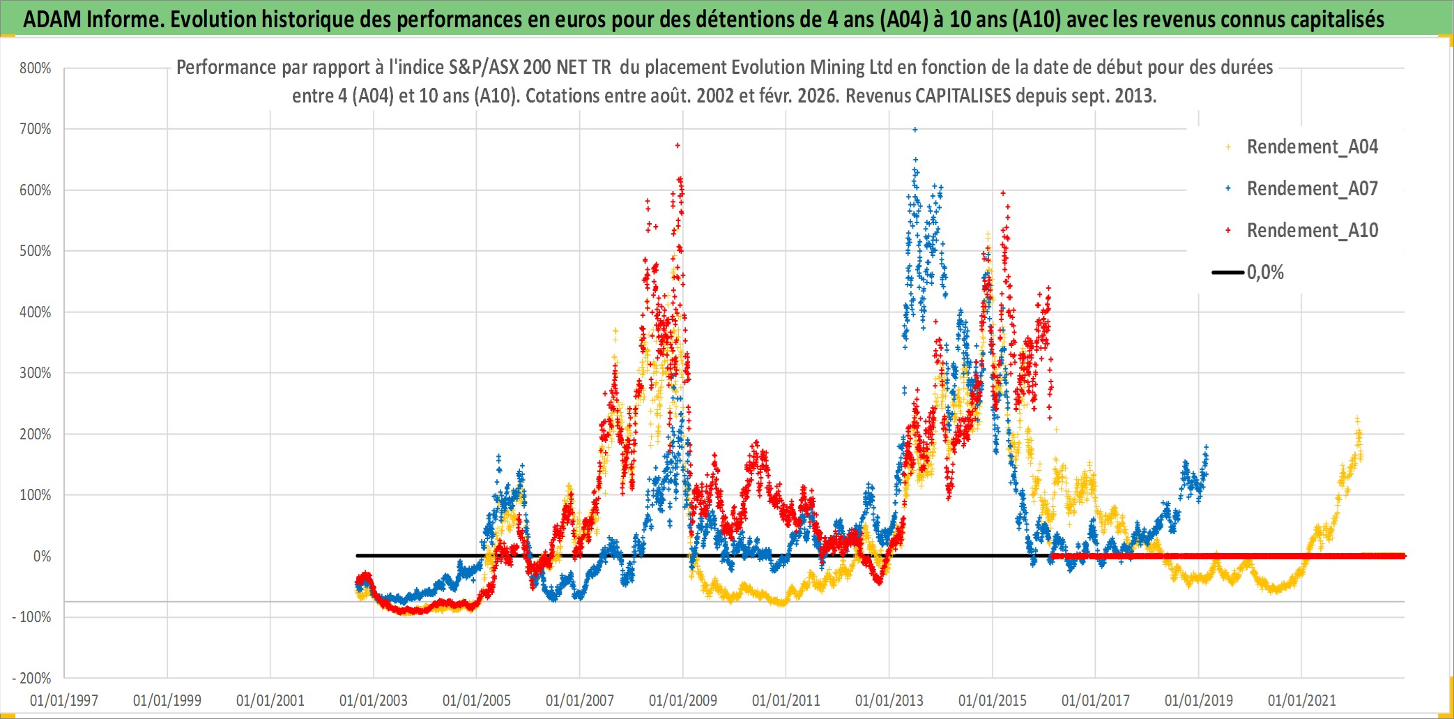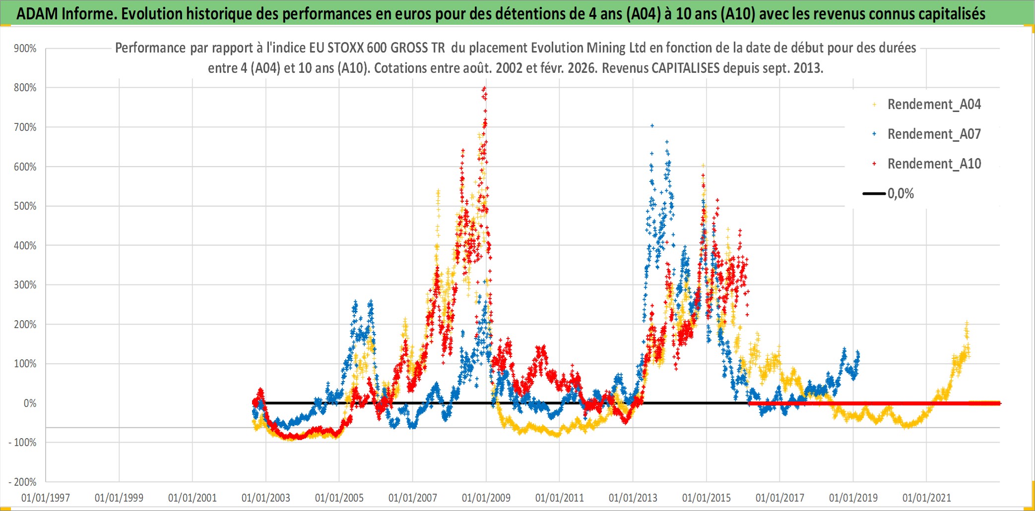 Site dédié aux investisseursPage dédiée sur site financeAnalyse des valorisations hebdomadaires de l'action Evolution Mining Ltd. Cet actif est cote en AUD. Les valorisations sont en contrevaleur EURO et couvrent les semaines 2002W34 a 2026W09. Les revenus de cet actif financier sont pris en compte depuis la semaine 2013W36. La note ESG de cet actif n'est pas connue.