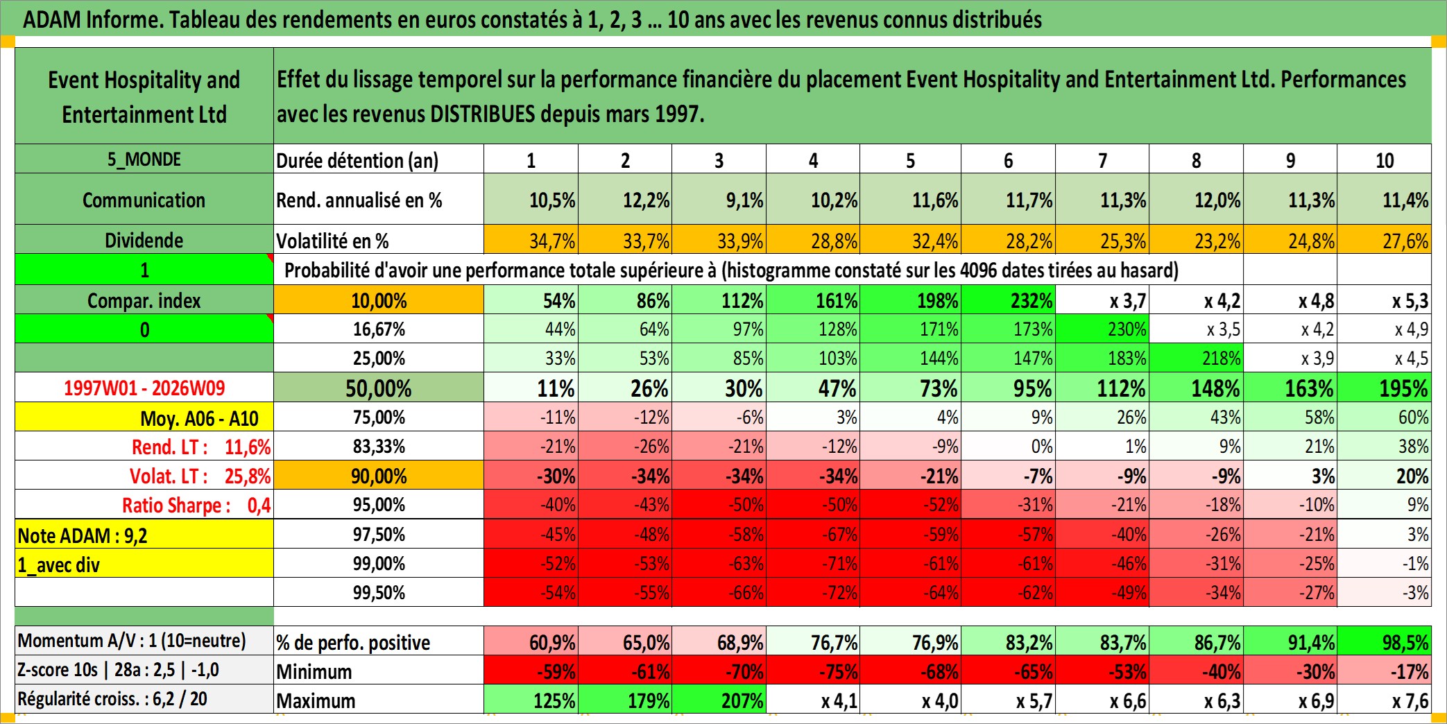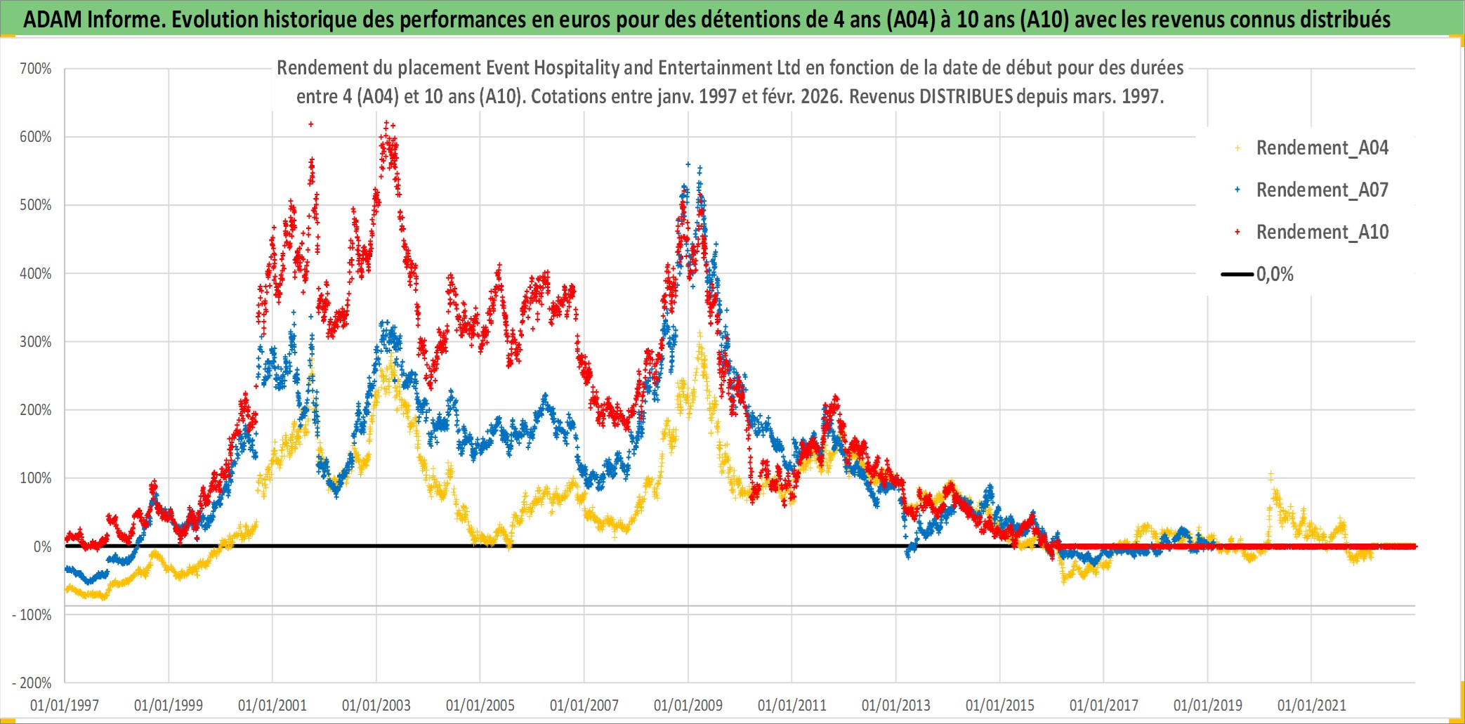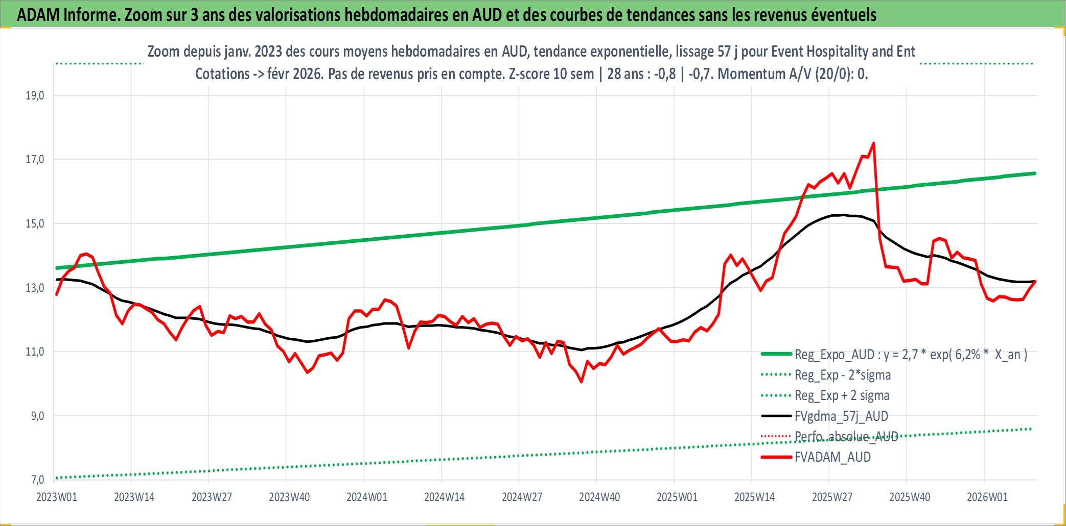 Site dédié aux investisseursPage dédiée sur site financeAnalyse des valorisations hebdomadaires de l'action Event Hospitality and Entertainment Ltd. Cet actif est cote en AUD. Les valorisations sont en contrevaleur EURO et couvrent les semaines 1997W01 a 2026W09. Les revenus de cet actif financier sont pris en compte depuis la semaine 1997W12. La note ESG de cet actif n'est pas connue.